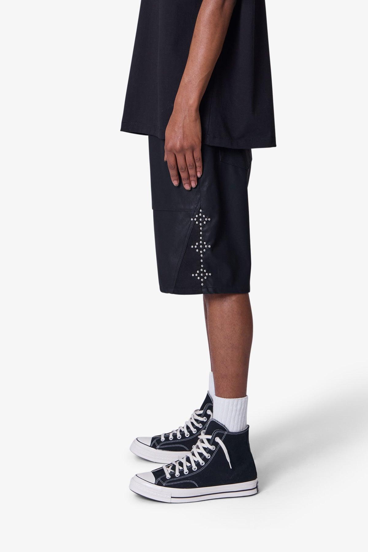 the Ultra Baggy Leather Studded Shorts are designed with a new oversized and baggy fit that is relaxed throughout, featuring studding details throughout, finished hem at the leg opening, and constructed in a vegan leather fabric. details baggy fit 45% polyurethane 55% polyester model is 6’1, 140 lbs and wears a size 30