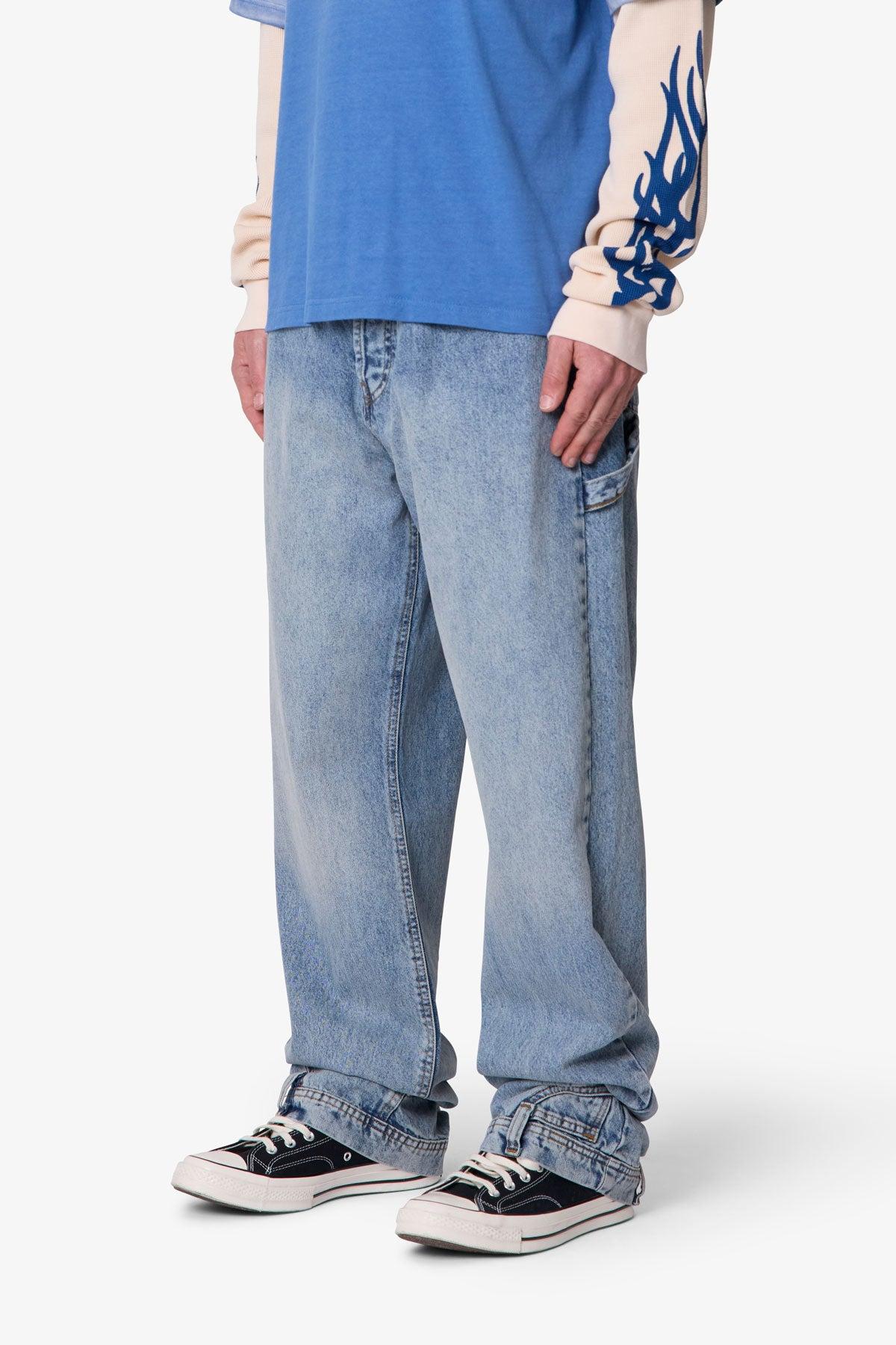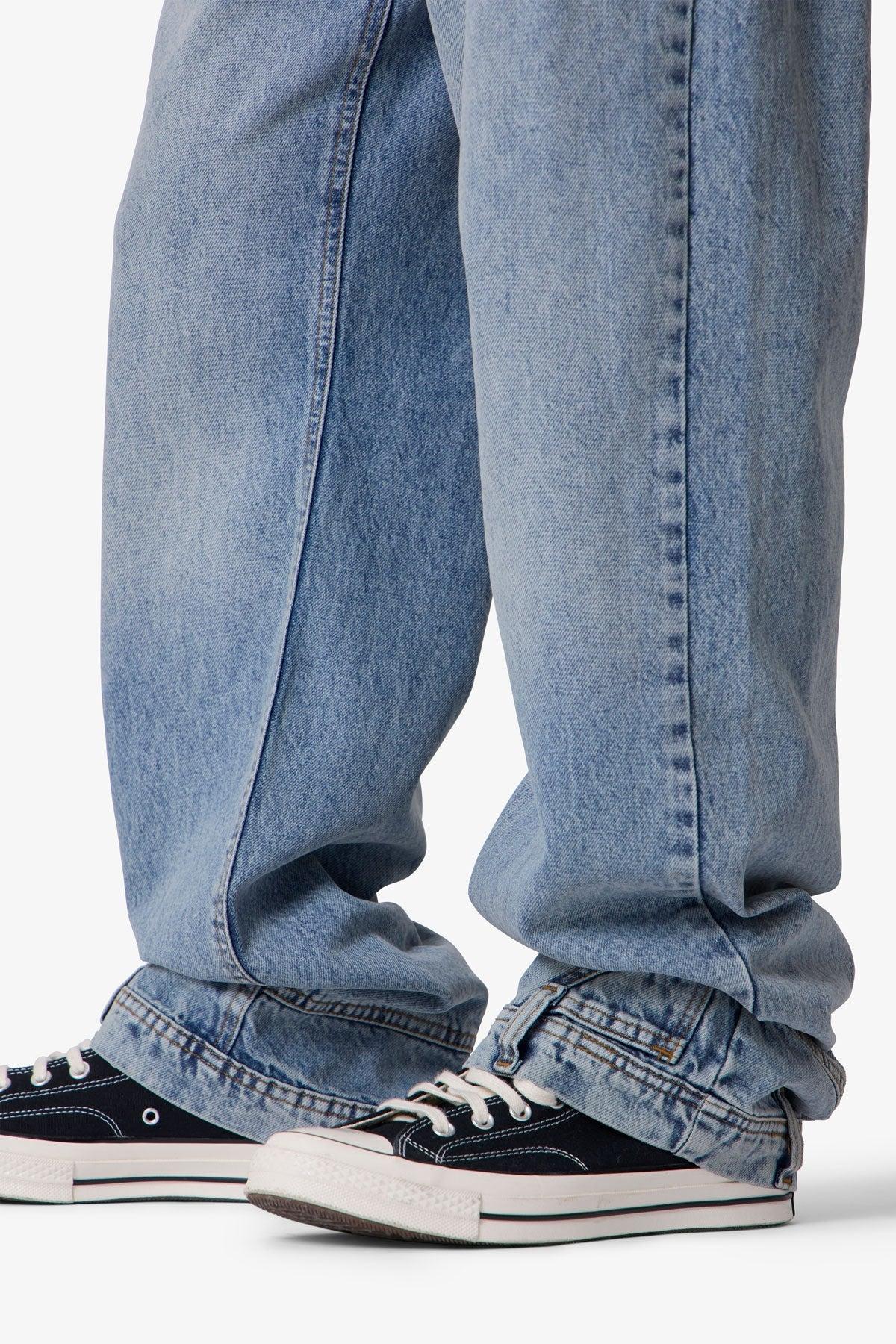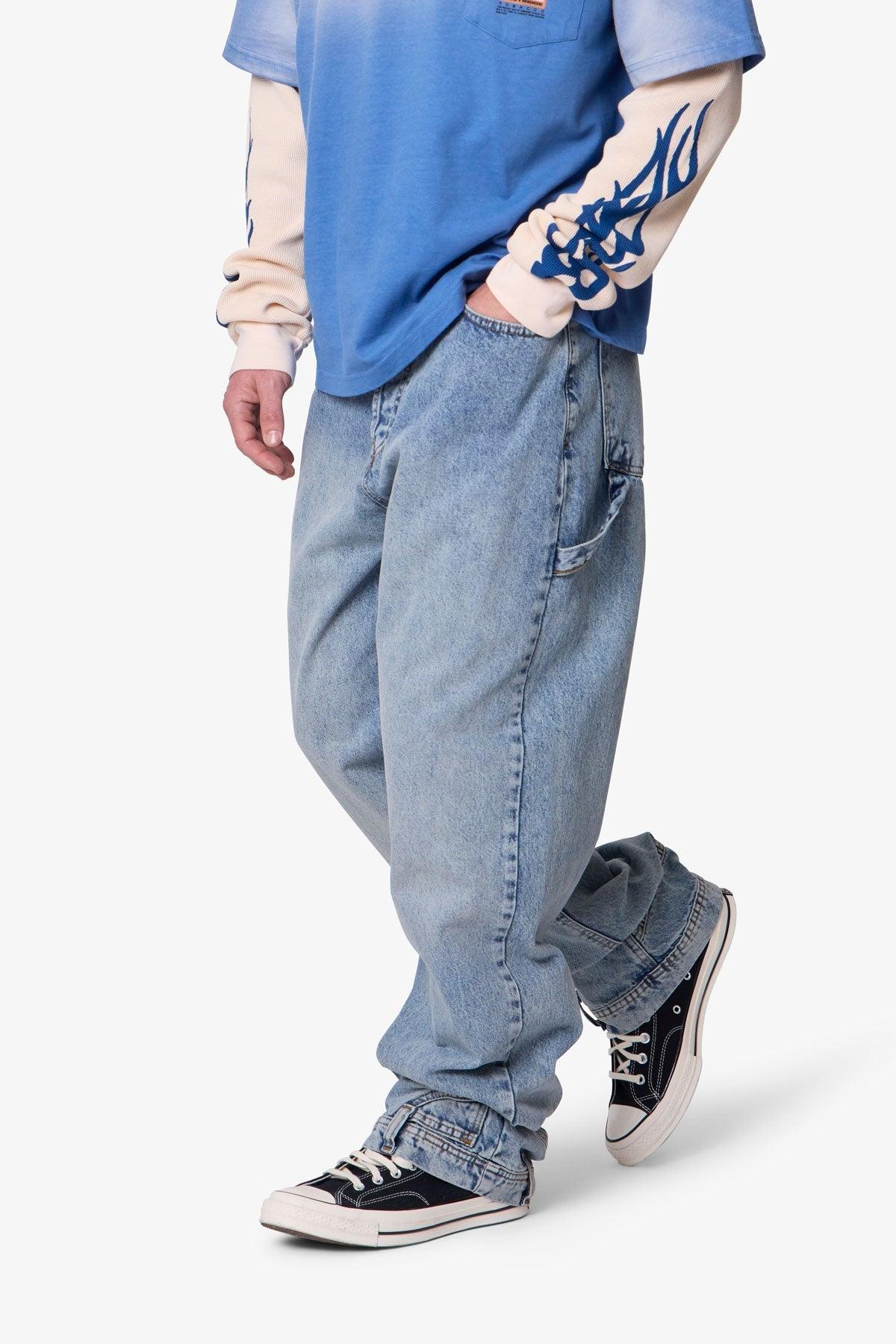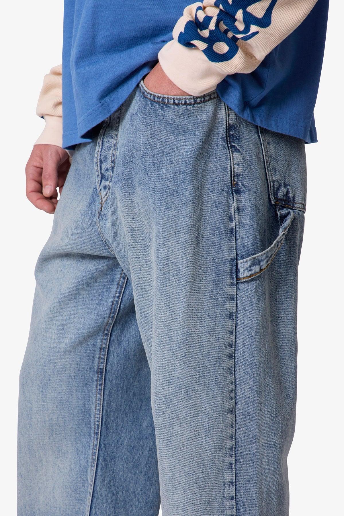 Constructed from 100% cotton denim with a washed blue stone wash, the Ultra Baggy Reconstructed Denim features an oversized silhouette with exaggerated volume through the leg. Designed with a utility pocket on the outer seam of the right leg, a hammer loop, and reconstructed denim waist and belt loops at the bottom hem