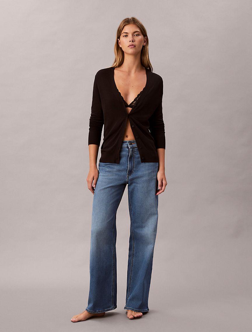Premium denim, crafted from comfort stretch denim for enhanced flexibility. Designed with a high rise waist, wide leg styling and tonal topstitching. Finished with a signature logo patch at the back waist for an iconic touch.