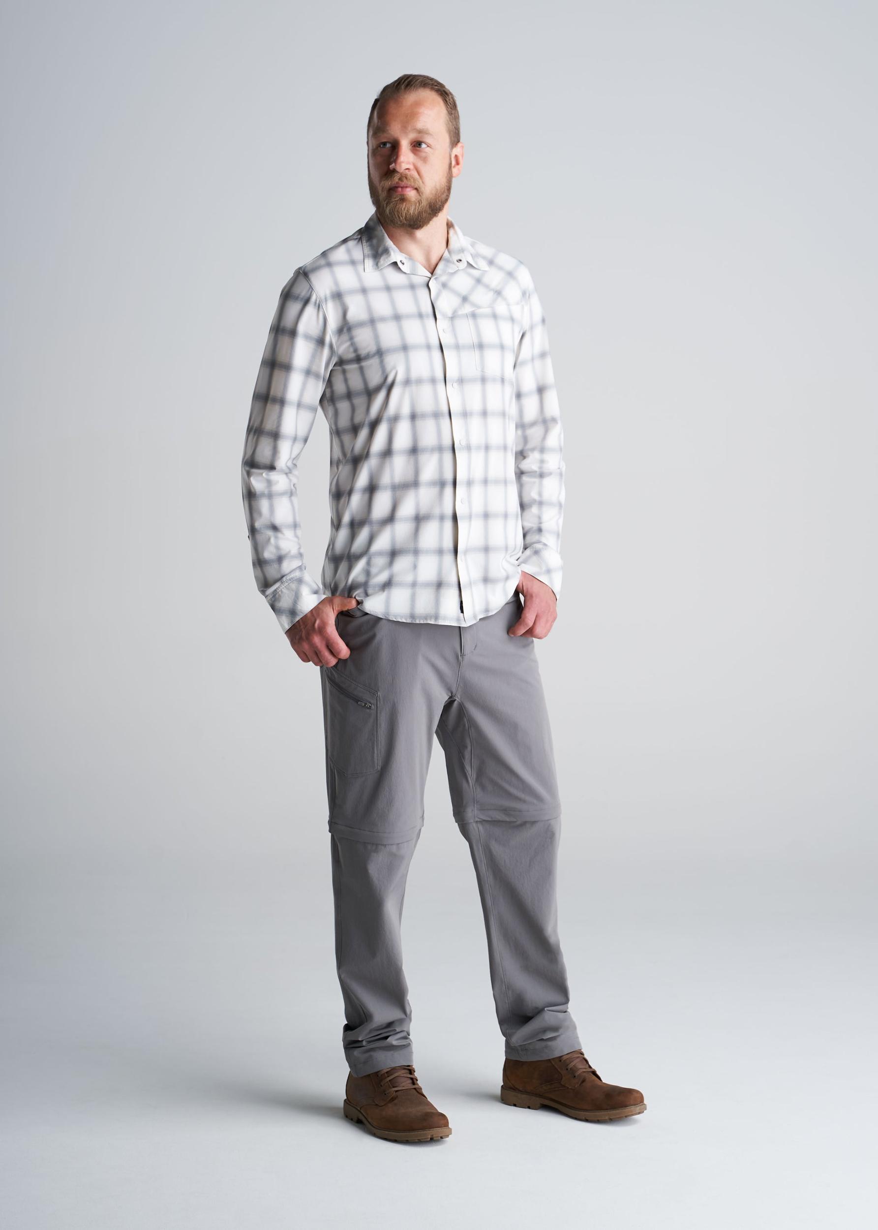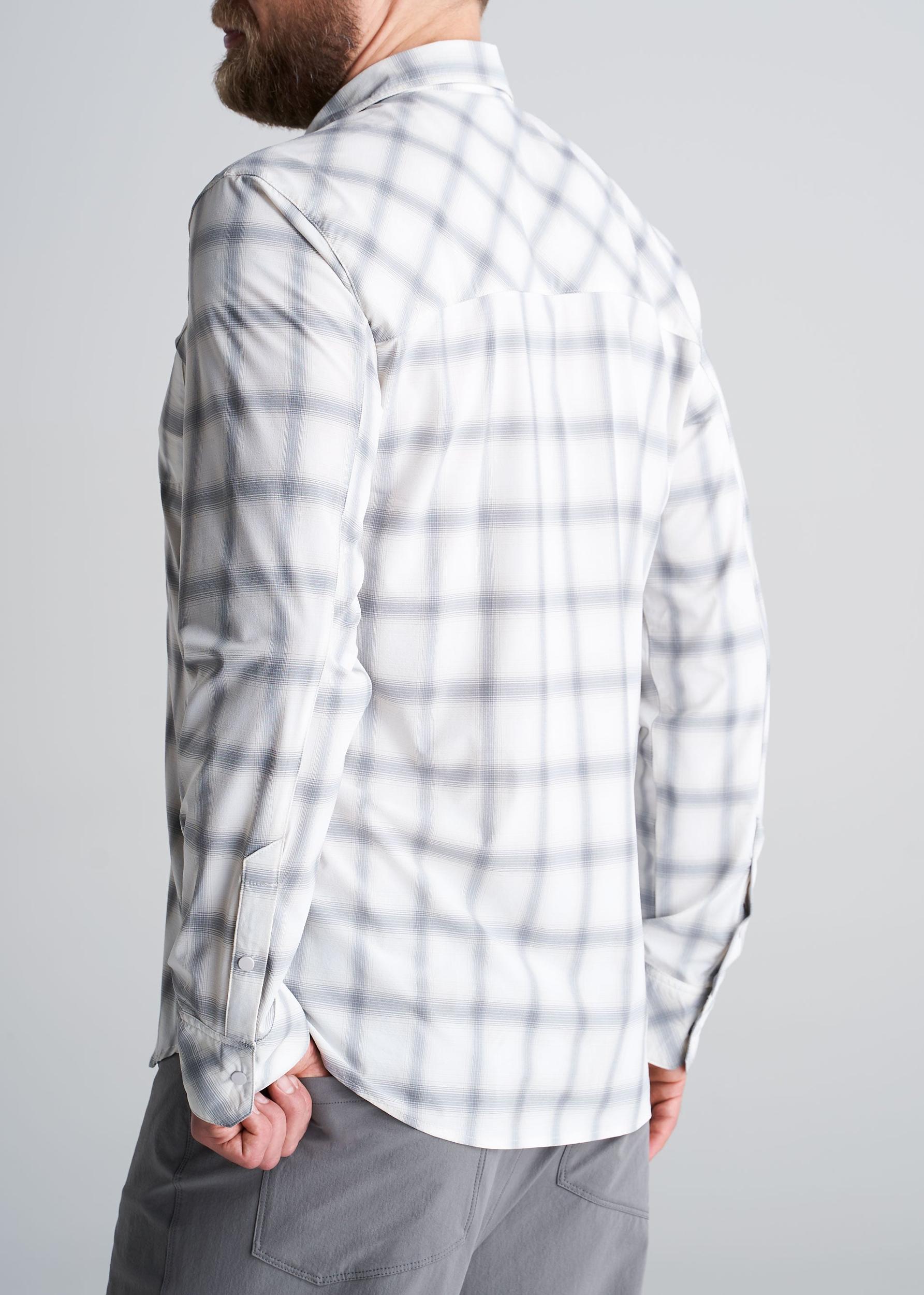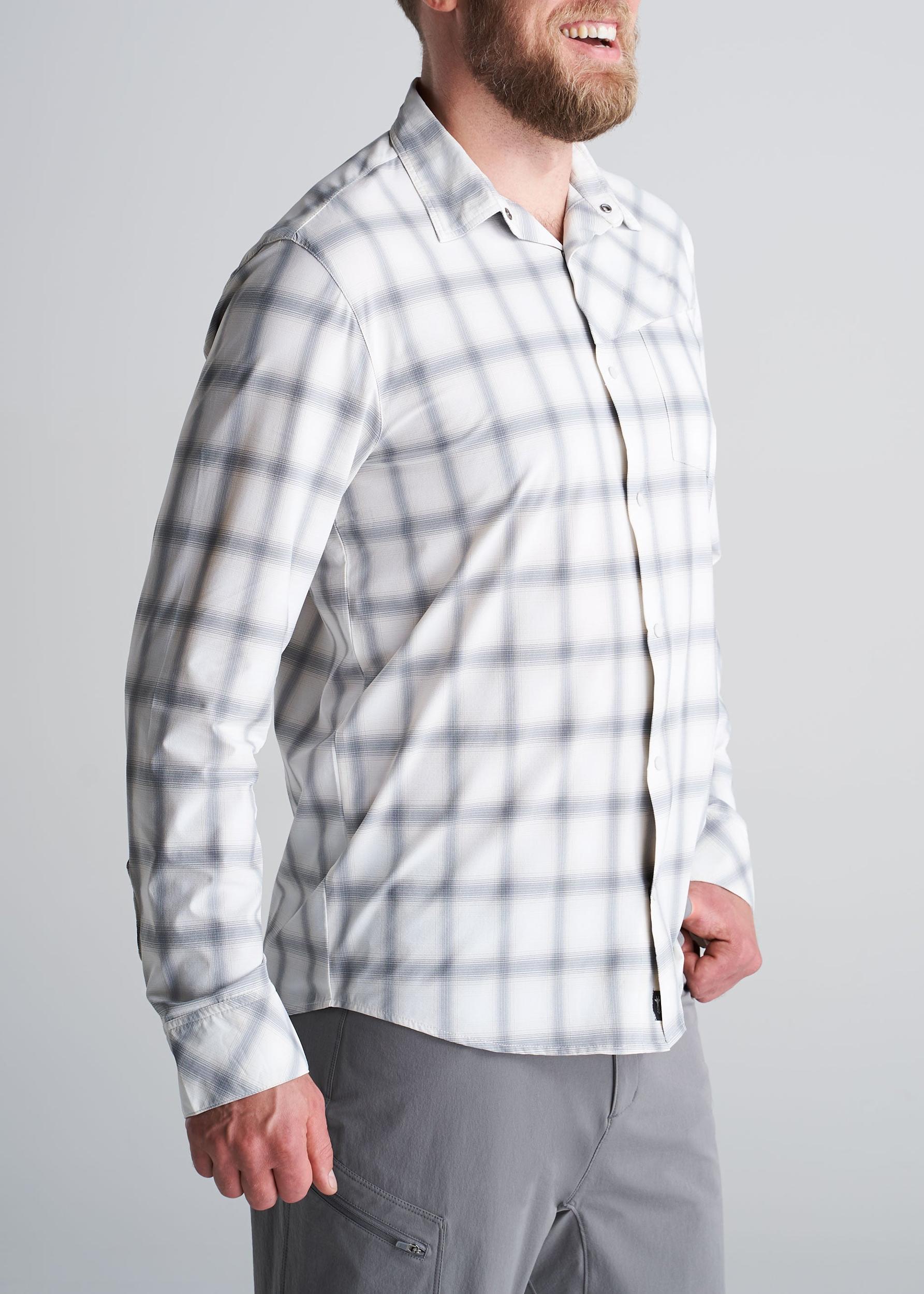 American Tall Men's Ultra Lightweight Snap-Front Shirt in Birch Smoke. A lightweight, sweat-wicking, quick dry tall shirt created specifically for tall guys. Made with 85% Nylon and 15% Spandex for superior durability, flexibility and comfort. Classic button-up design with left breast pocket and relaxed collar. The perfect tall crossover shirt, four-season capable. MORE DETAILS: You're always ready for the next adventure, but you need clothing that's functional, versatile and useful, but most importantly, crafted to fit your tall frame and long arms. That's exactly what the American Tall Lightweight Snap-Front Shirt is. Premium construction for diverse terrain and weather, plenty of room for movement without leaving you swimming in excess fabric. Pair with American Tall Men's Hiking Zip-Off Pants for expert level adventure attire. SIZE & FIT:Model is 6'8", 230 lbs, wearing size L Tall FABRIC & CARE:85% Nylon, 15% SpandexBirch Smoke colorPre-washed/shrinkage controlledMachine washableImported