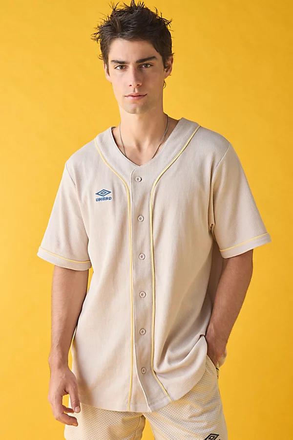 Short sleeve button-down baseball jersey by sportswear label Umbro. Textured cotton-blend shirt with a classic baseball silhouette featuring contrast piping trims and an embroidered logo at the left chest. Find this baseball jersey exclusively at Urban Outfitters. Features Umbro baseball jersey tee Waffle texture cotton blend Button-down front Short sleeve Regular fit UO exclusive Content + Care 58% Cotton, 37% polyester, 5% spandex Machine wash Imported Size + Fit Measurements taken from size M