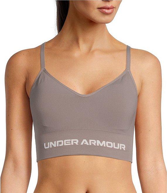 From Under Armour, this sports bra features: 4-way stretch fabrication Scoop neckline Removable soft cups Adjustable straps Seamless fit Pullover construction Polyester/elastane Machine wash/tumble dry, remove pads before washing Imported