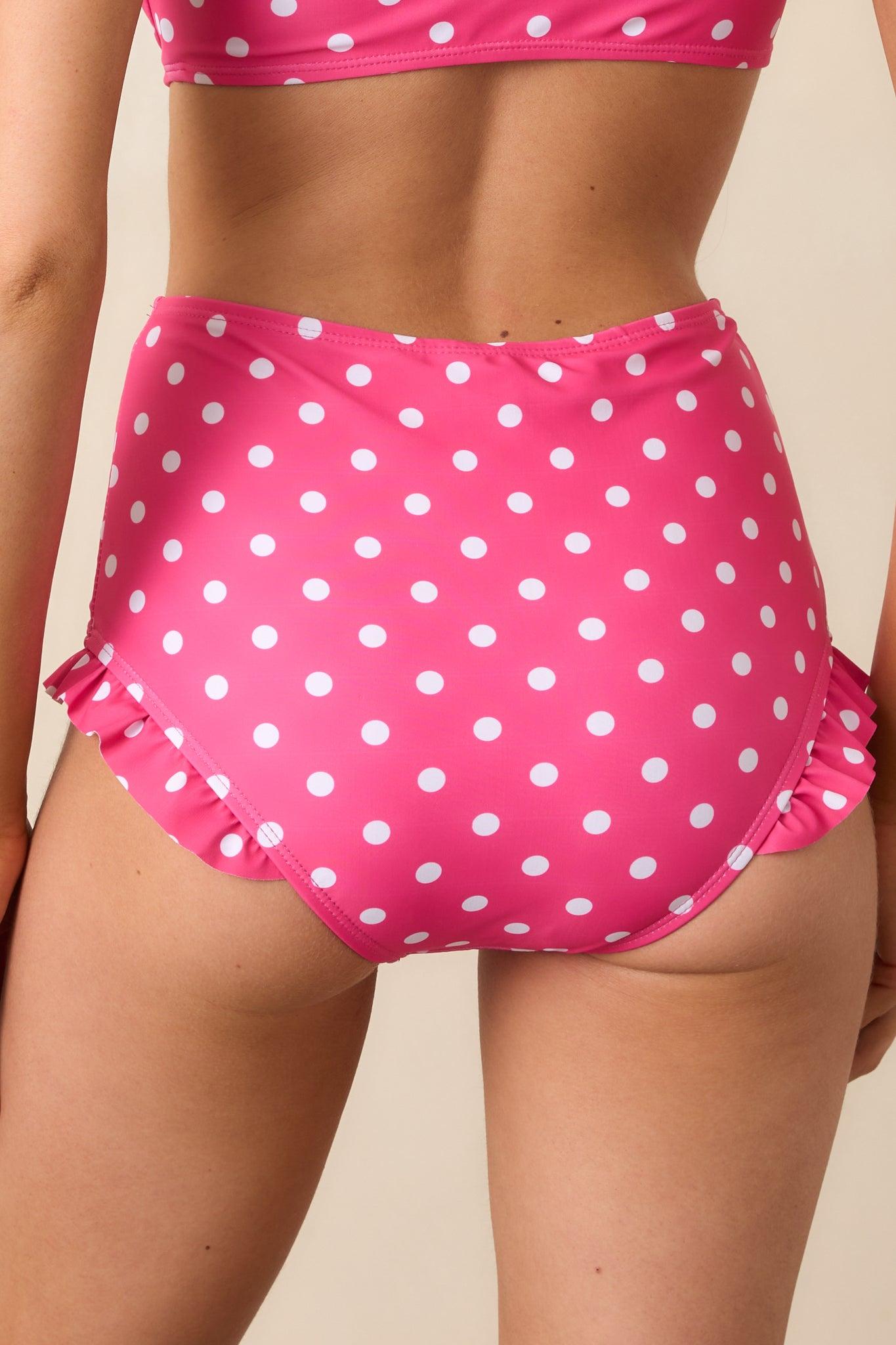 The Under The Sun Pink Polka Dot High-Waisted Ruffle Trim Bikini Bottoms are a delightful choice for soaking up the warmth and joy of a sunny day. They're perfect for those carefree moments when you want to feel playful and radiant. These pink bikini bottoms feature a white polka dot print, high rise design, ruffle trim on the bottom hems, a full coverage back, and front panel design.