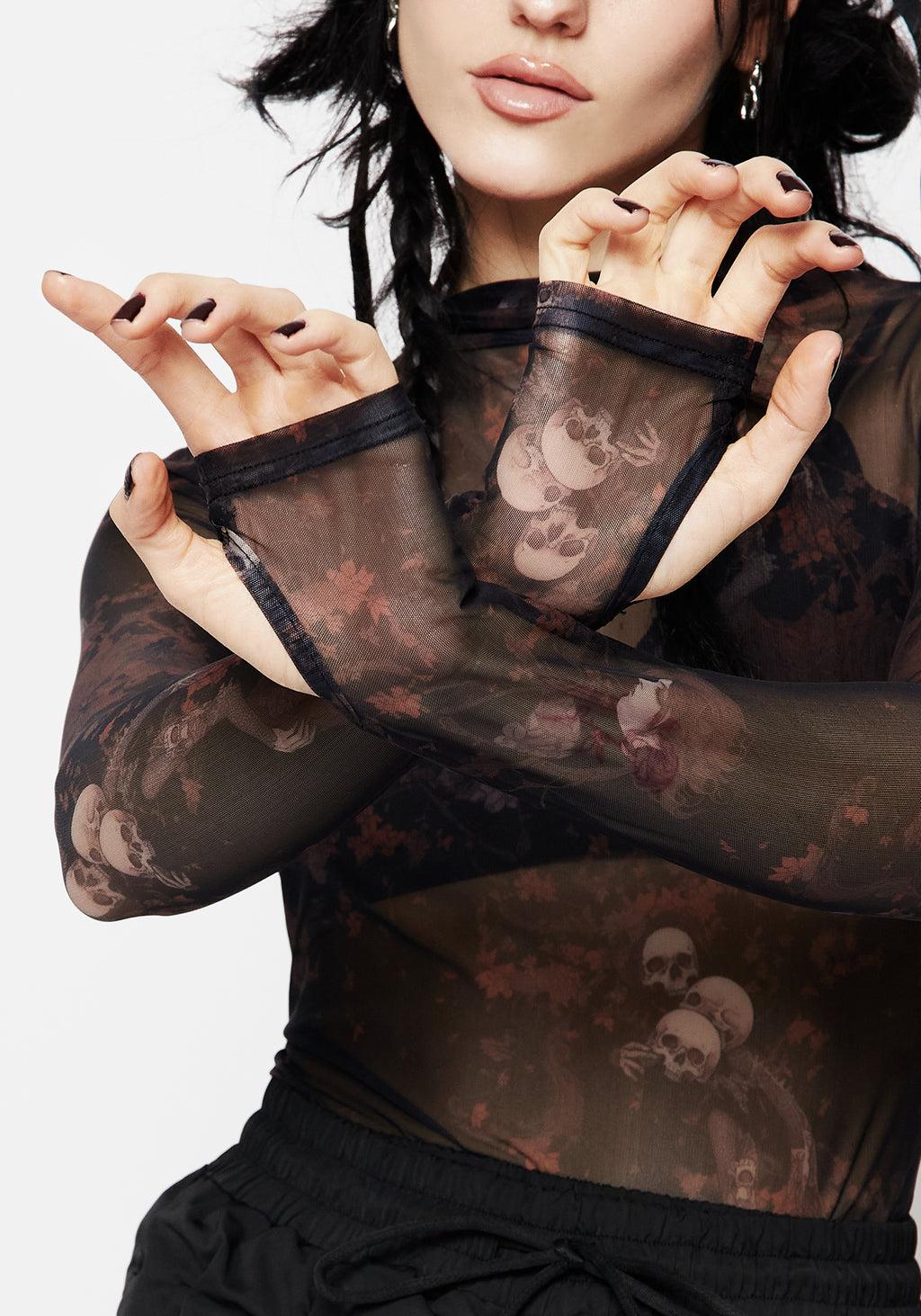 Down we go... - Black & brown floral skull print long sleeve mesh top - Slim fit in comfortable super-stretchy mesh - High mock neck & long sleeves (with thumb holes !!) for full coverage - Stretch mesh fabrication is fully sheer to layer as you like - Muted orange-brown decaying floral skull print - To die for! 95% polyester, 5% elastane