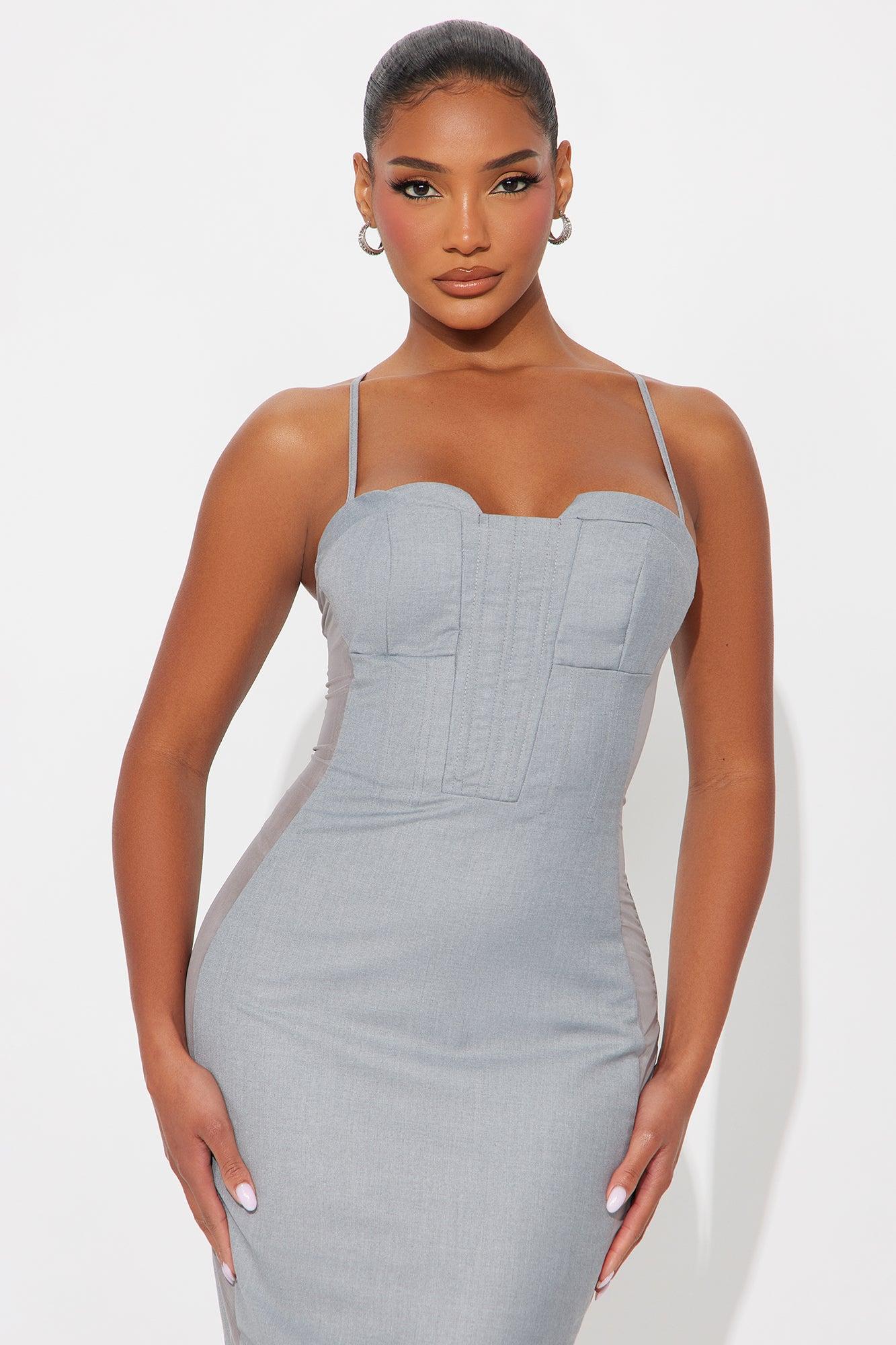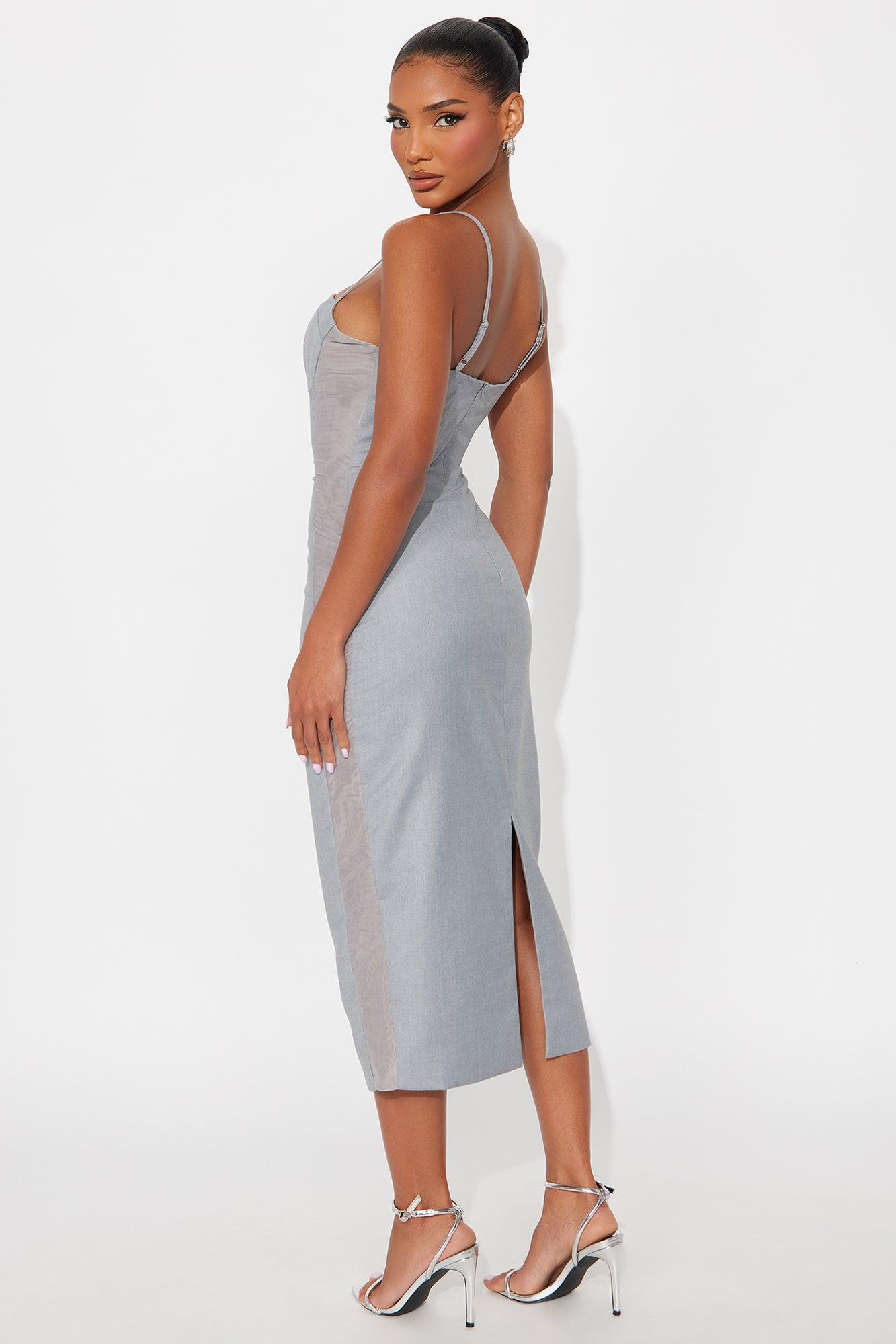 Available In Grey. Midi Dress Non Stretch Adjustable Straps Sheer Mesh Sides Boned Detail Lined Back Zipper Back Slit Length Measured Flat= 47" Shell 1: 65% Polyester 35% Rayon Shell 2: 92% Polyester 8% Spandex Lining: 100% Polyester Imported