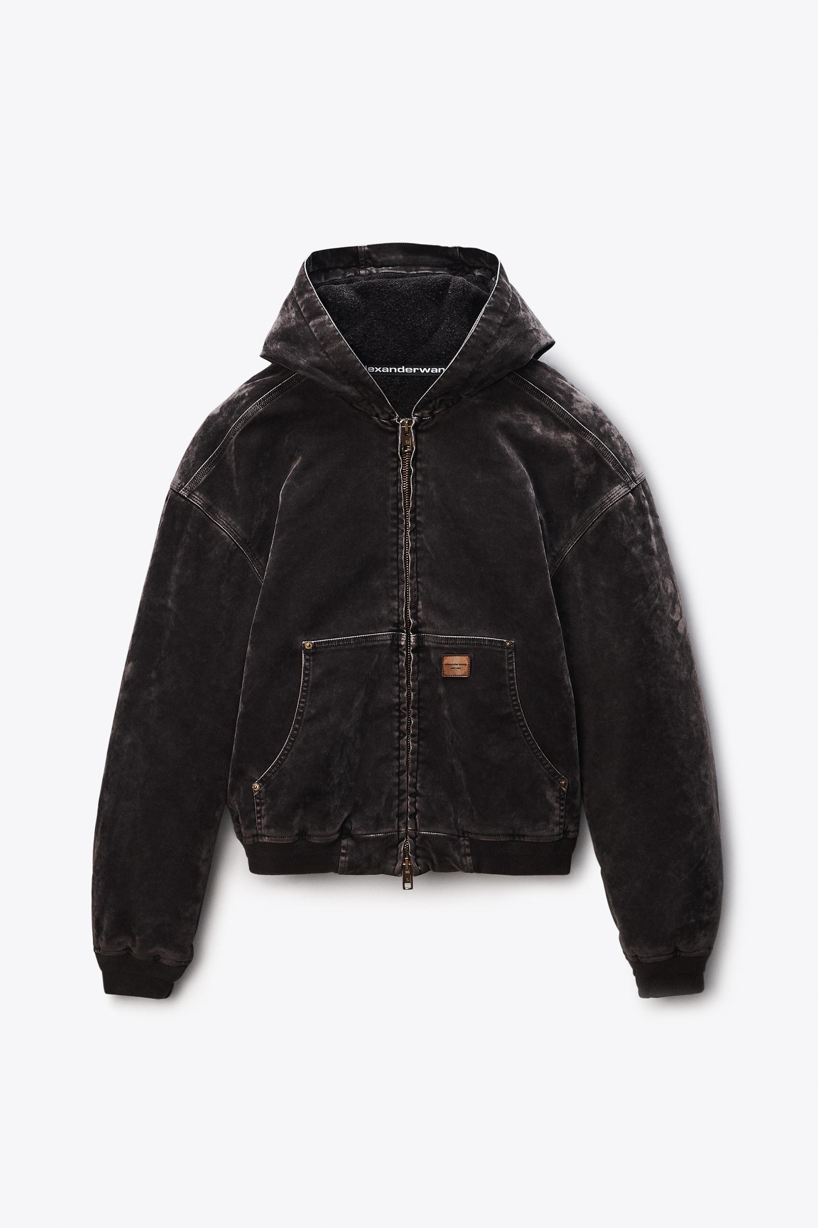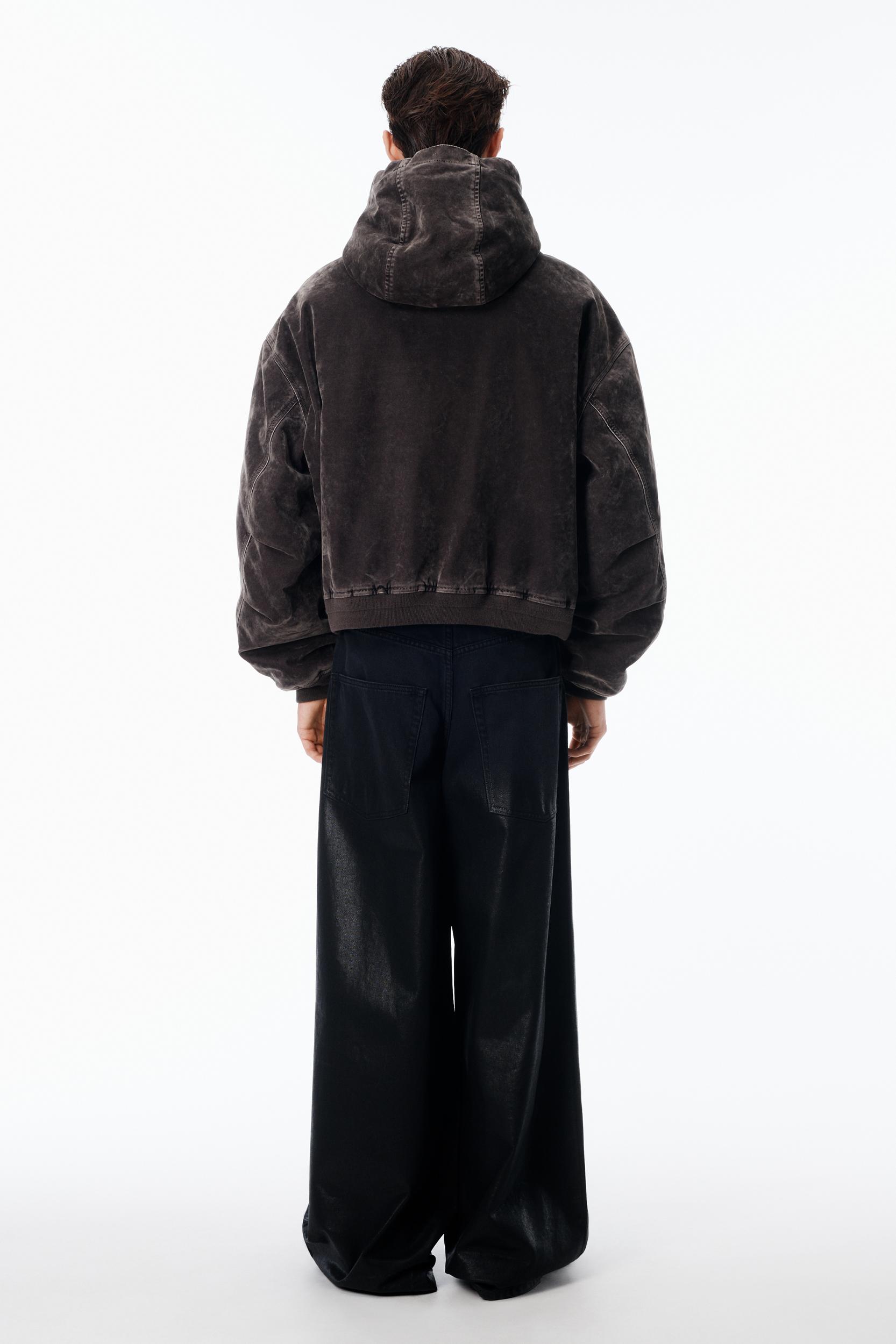 Oversized hoodie in grey flocked stretch denim. Drop-shoulder fit with articulated sleeves and a quilted body for structure and warmth. Finished with a full zip closure, carpenter patch pockets, and a tan logo patch at front.