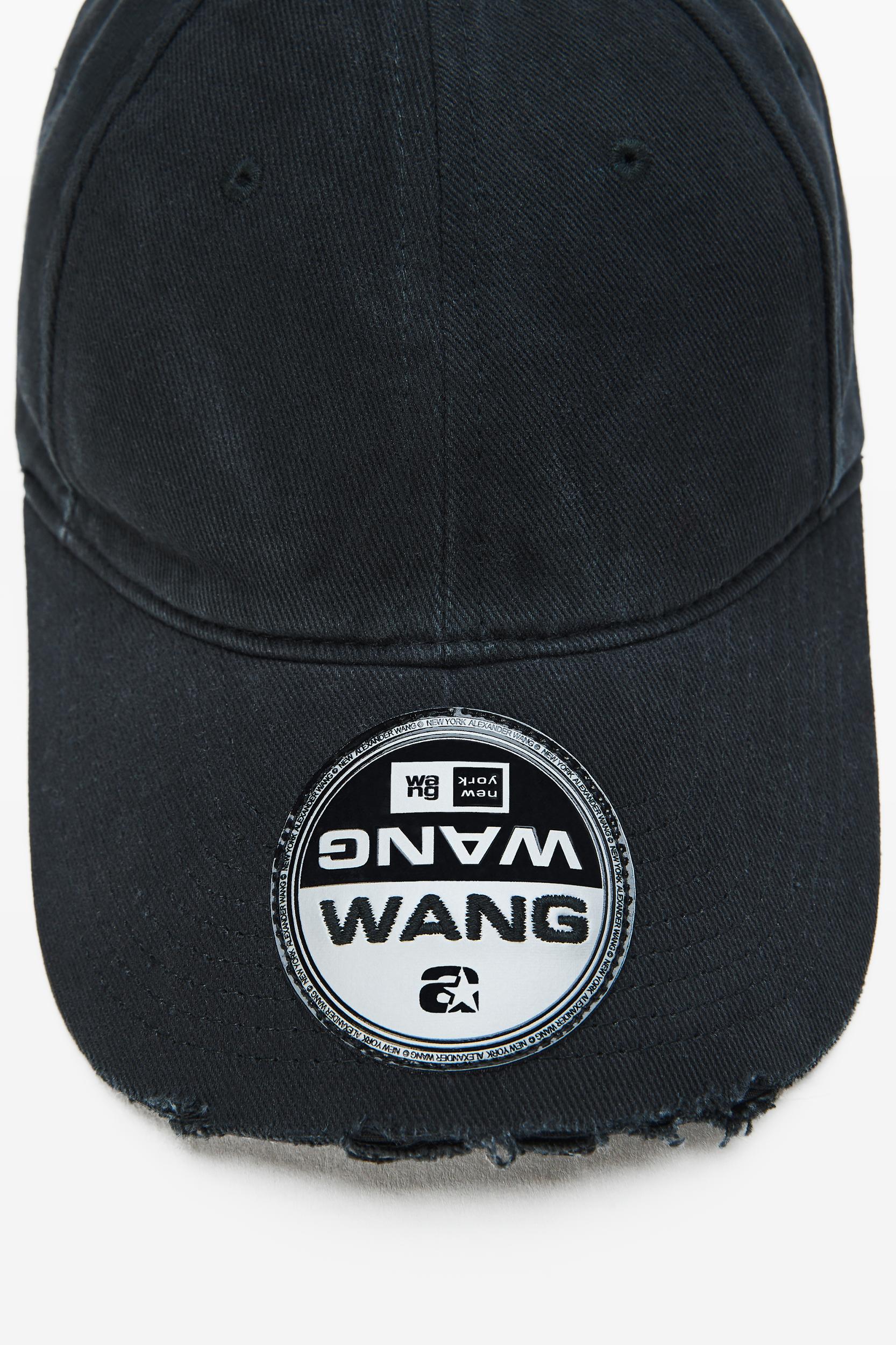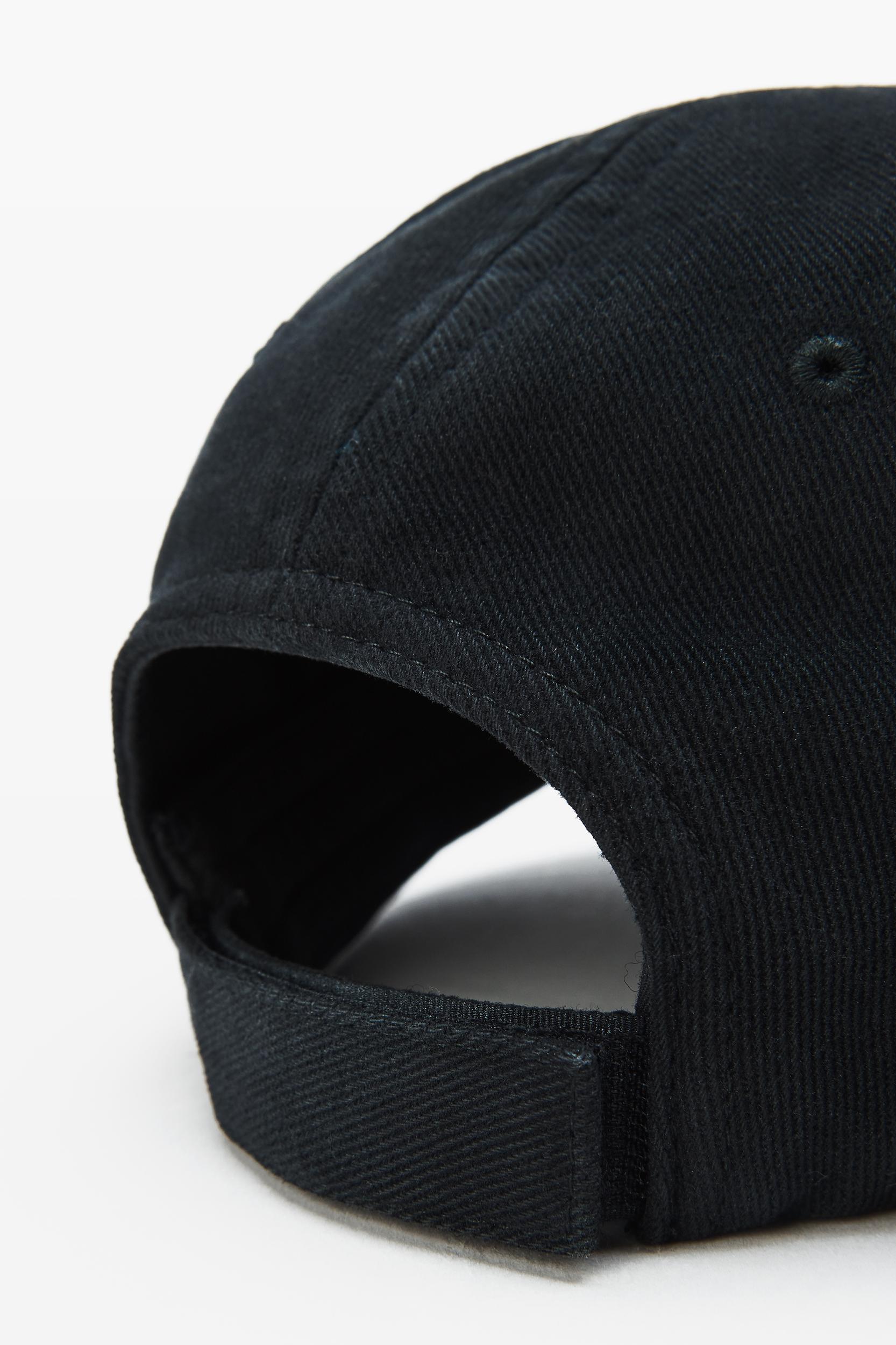 Washed black cotton twill cap with a circular two-tone graphic at the brim. Finished with dual-process foil and embroidery detail, plus an adjustable Velcro strap at the back.