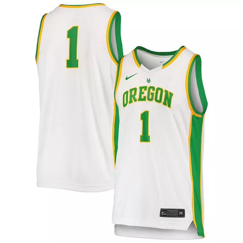 TEAM PRIDE. GAME-READY STYLE. Rep your Ducks pride on and off the court in the Nike College (Oregon) Jersey. It's made with lightweight, breathable fabric to help keep you comfortable, so you don't miss a moment. Product Details: Standard fit for a relaxed, easy feel. 100% polyester. Machine wash. Imported. Style: P32919J432; Color: White; Size: M; Gender: Male; Age Group: Adult | Nike College (Oregon) Basketball Jersey in White, Size: Medium | P32919J432-ORE