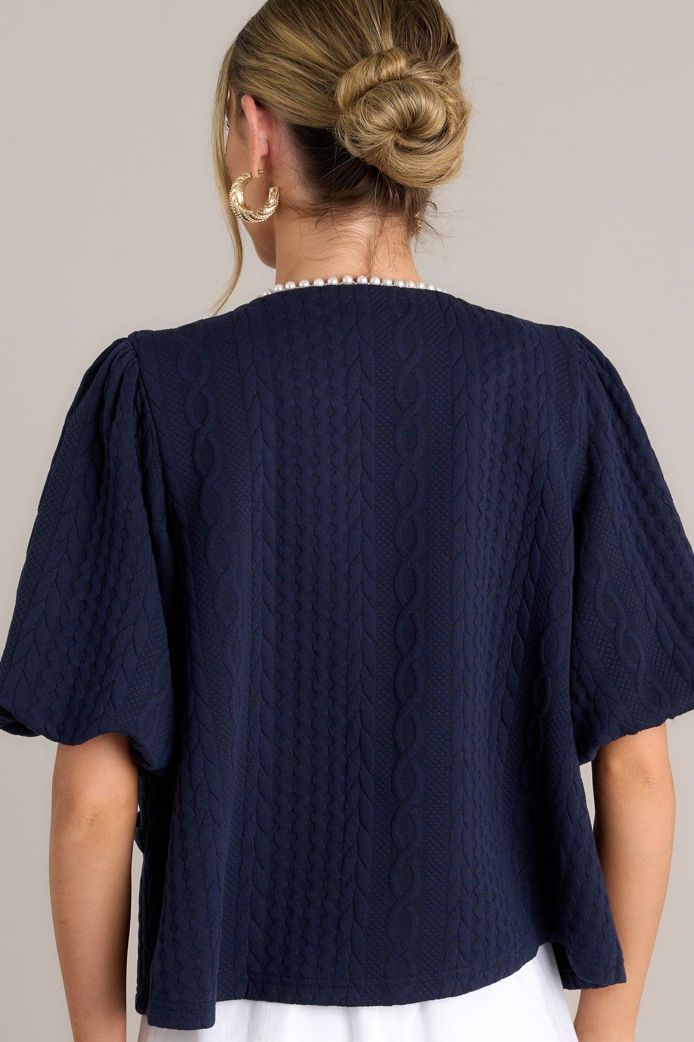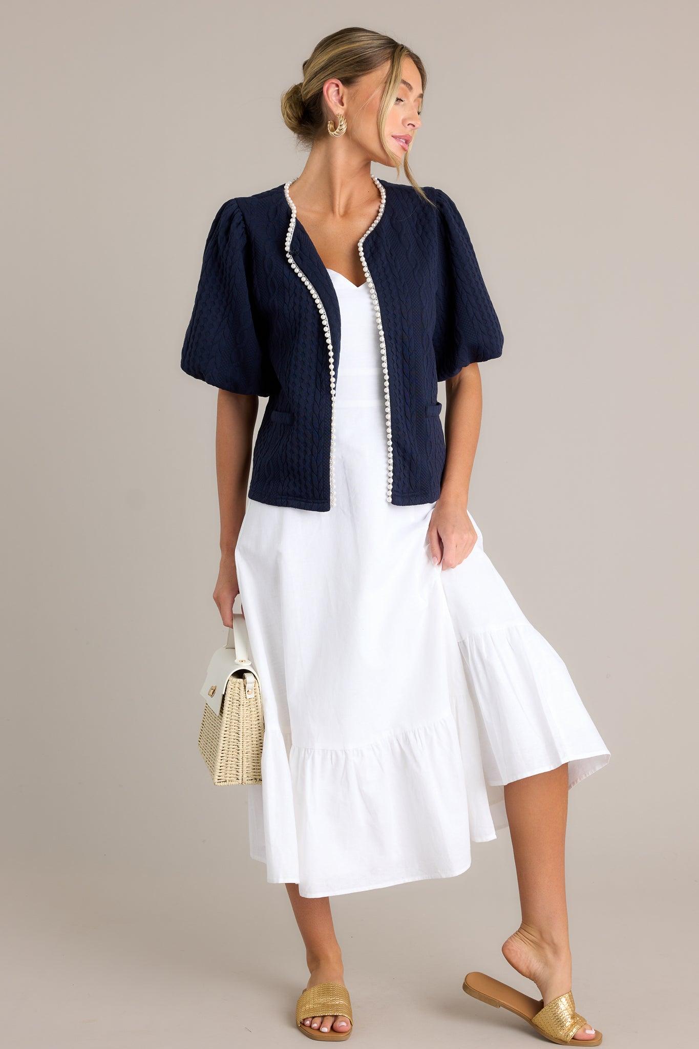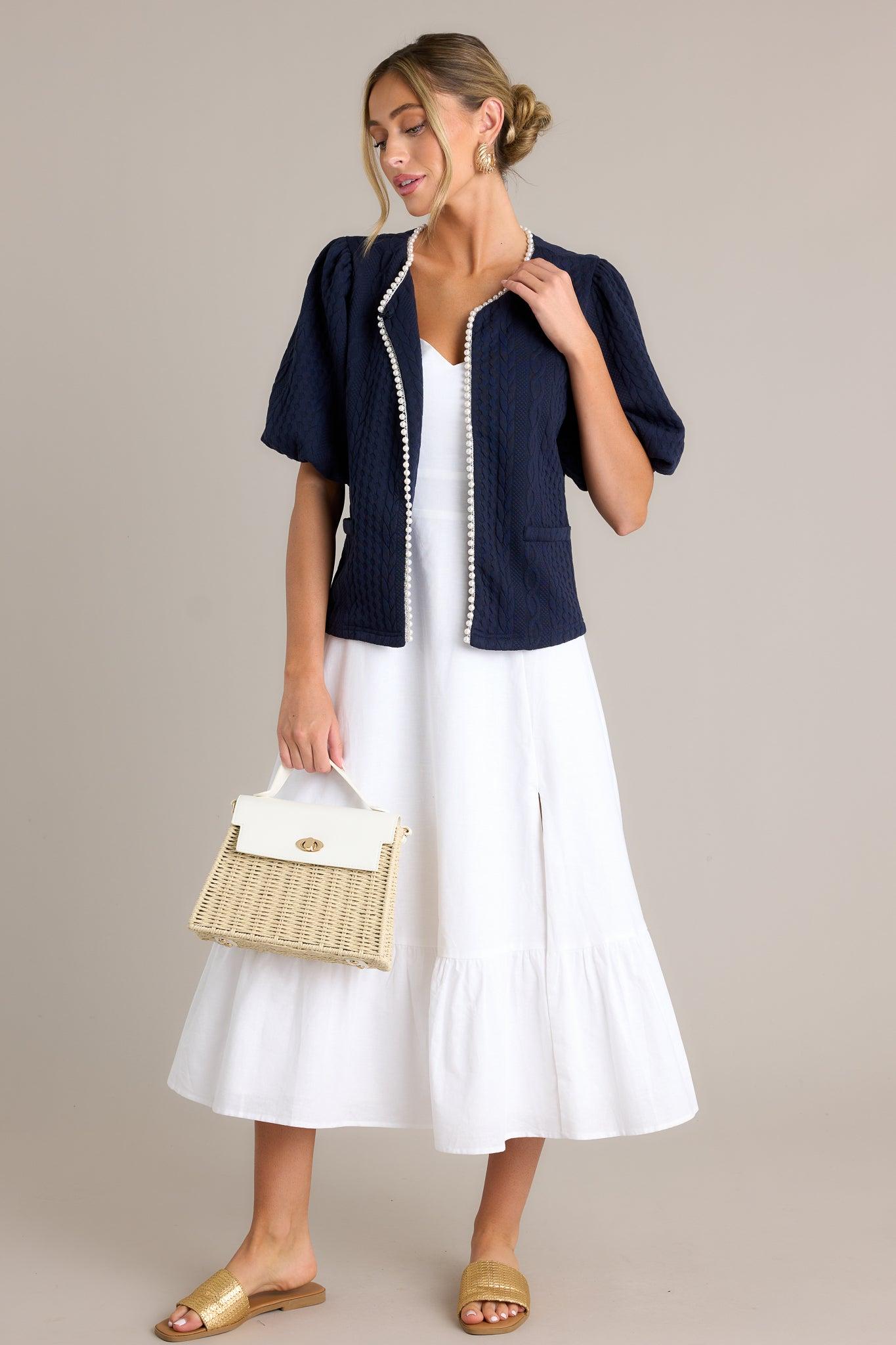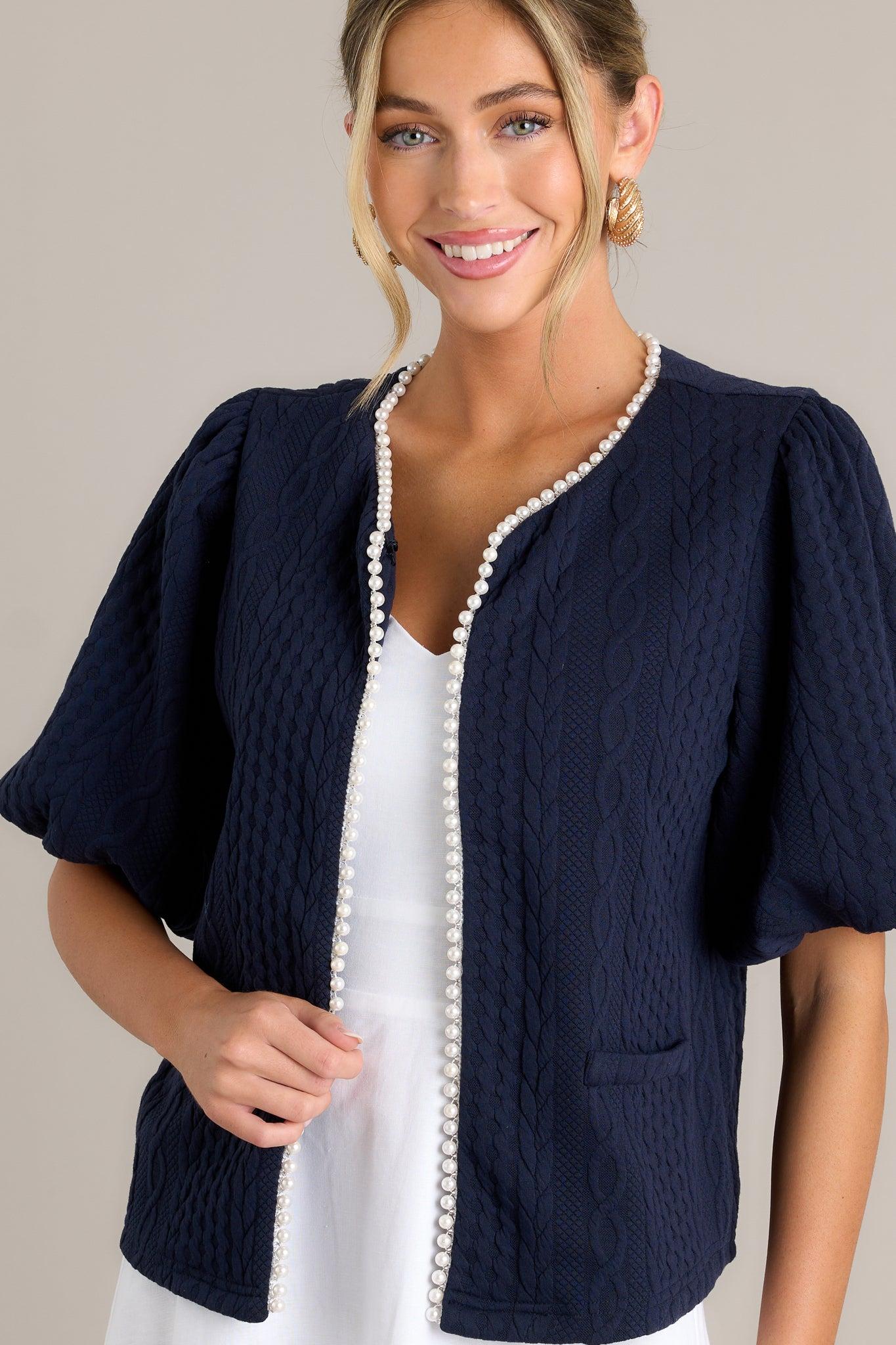 Get ready to charm your way through any occasion with our Universal Charm Navy Short Puff Sleeve Jacket! This playful and quirky jacket features short puff sleeves that add a fun and unique touch to any outfit. Stay stylish and confident all day long with this must-have addition to your wardrobe. This navy short sleeve jacket features a v-neckline, a hook & bar closure, faux pearl trim, a quilted design, faux pockets, and elastic cuffed puff sleeves.