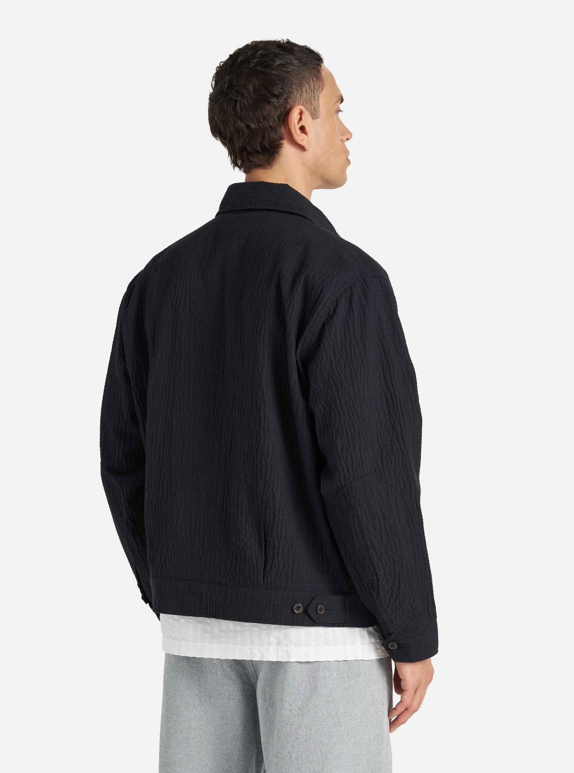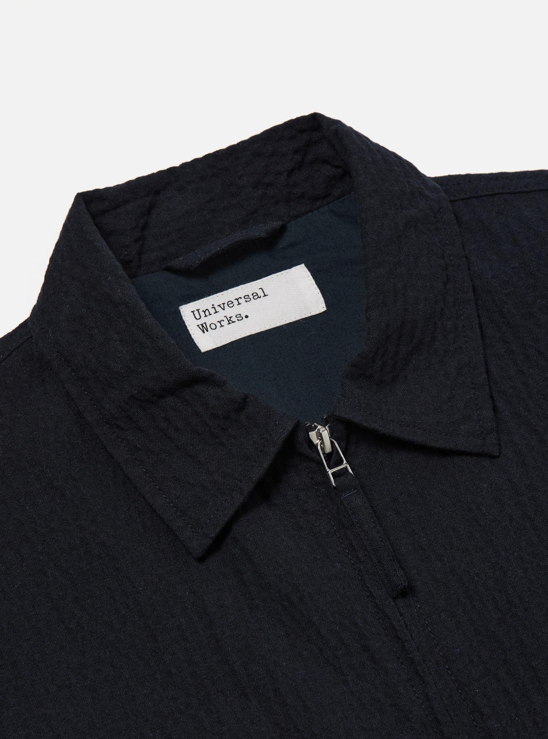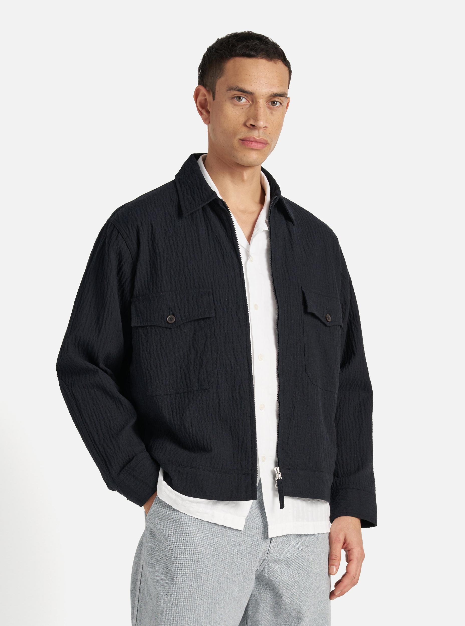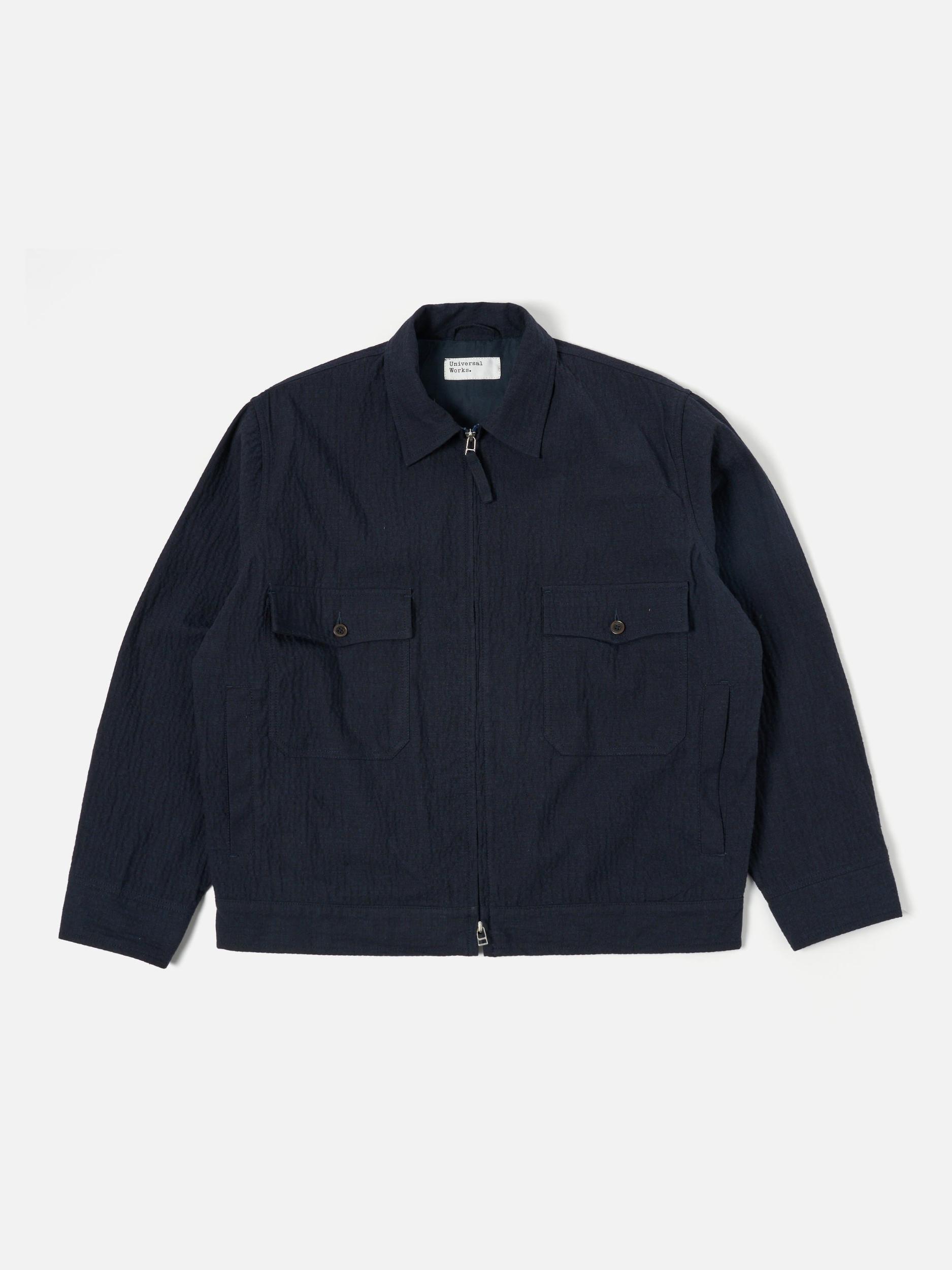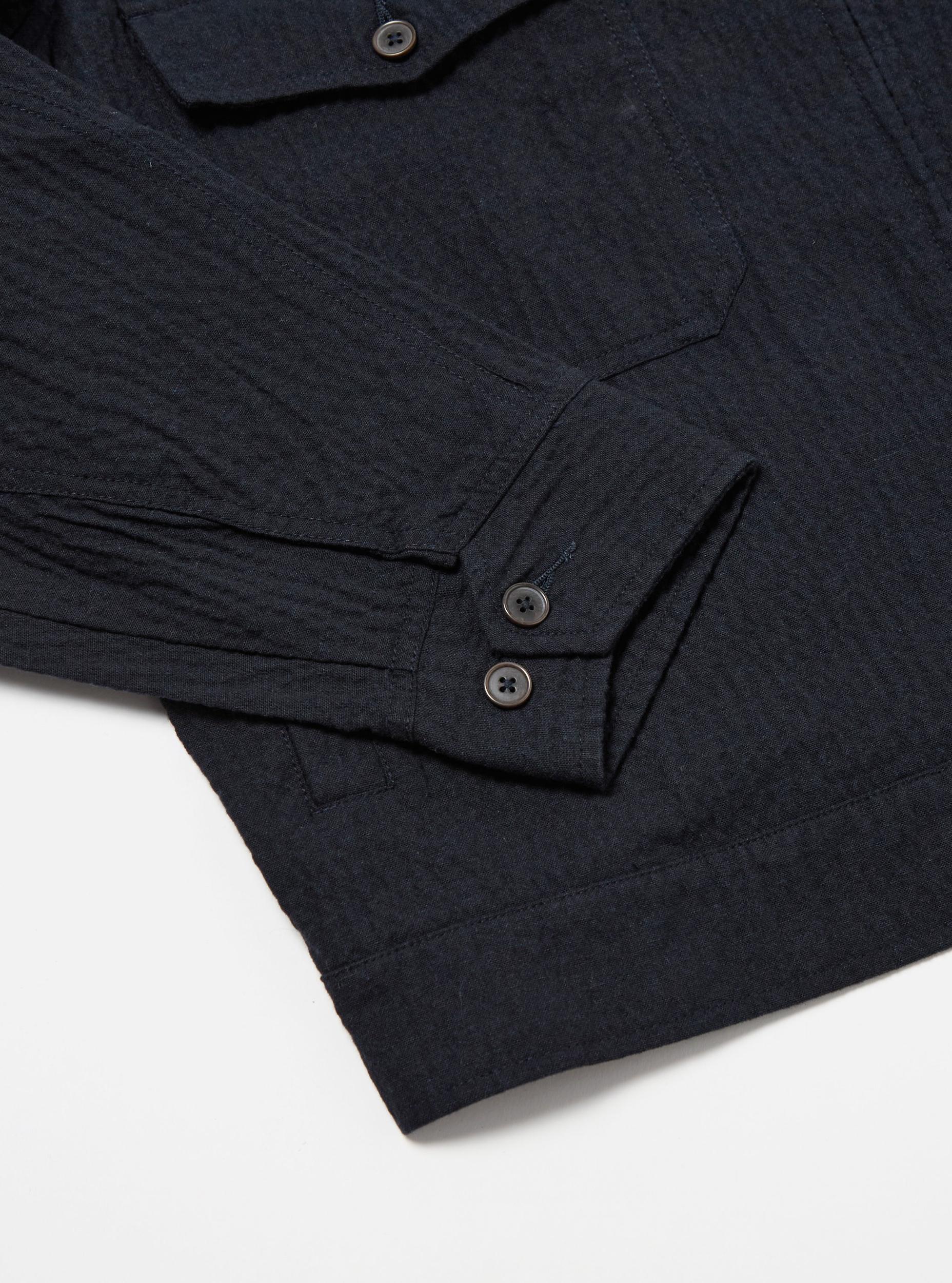 Based on a vintage jacket we found and adapted, the E130 Jacket is a similar style to our Windcheater, but with a looser, boxier fit. It has adjustable hem tabs, elbow patches for reinforcement, and our two-way zip front. Our model is 6' 0'' with a 38' Chest and is wearing a size ‘Large.’ A simply woven, airy fabric in a blend of upcycled fibres to create a fabric with a seersucker effect and a dry hand feel. The blend of fibres gives a slight marl effect to the rich navy base. • Relaxed, boxy fit. • Two front button flap pockets. • Two additional handwarmer pockets. • Waist adjusters. • Adjustable button cuffs. • Two-way zip-front. • Fabric Content: Outer: 65% Recycled Cotton, 25% Recycled Polyester, 5% Viscose, 4% Other Fibres, 1% Elastane. Body Lining: 100% Cotton. Top Sleeve Lining: 100% Polyester. • Washcare: Do not machine wash. Do not bleach. Do not tumble dry. Warm iron. Dry clean only. Do not iron decoration. • Please be aware that the measurements below are technical measurements that are based on the garment laid flat and are useful as a general guide only. Measured in Centimetres. XS S M L XL XXL XXXL Centre Back Length. 60 62 64 66 68 70 72 Chest Width - 2.5cm Below Armhole. 61 63.5 66 68.5 71 73.5 76 Sleeve Length - From Shoulder (inc. Cuff.) 58 59.5 61 62.5 64 65.5 67 Across Shoulders. 45 47 49 51 53 55 57