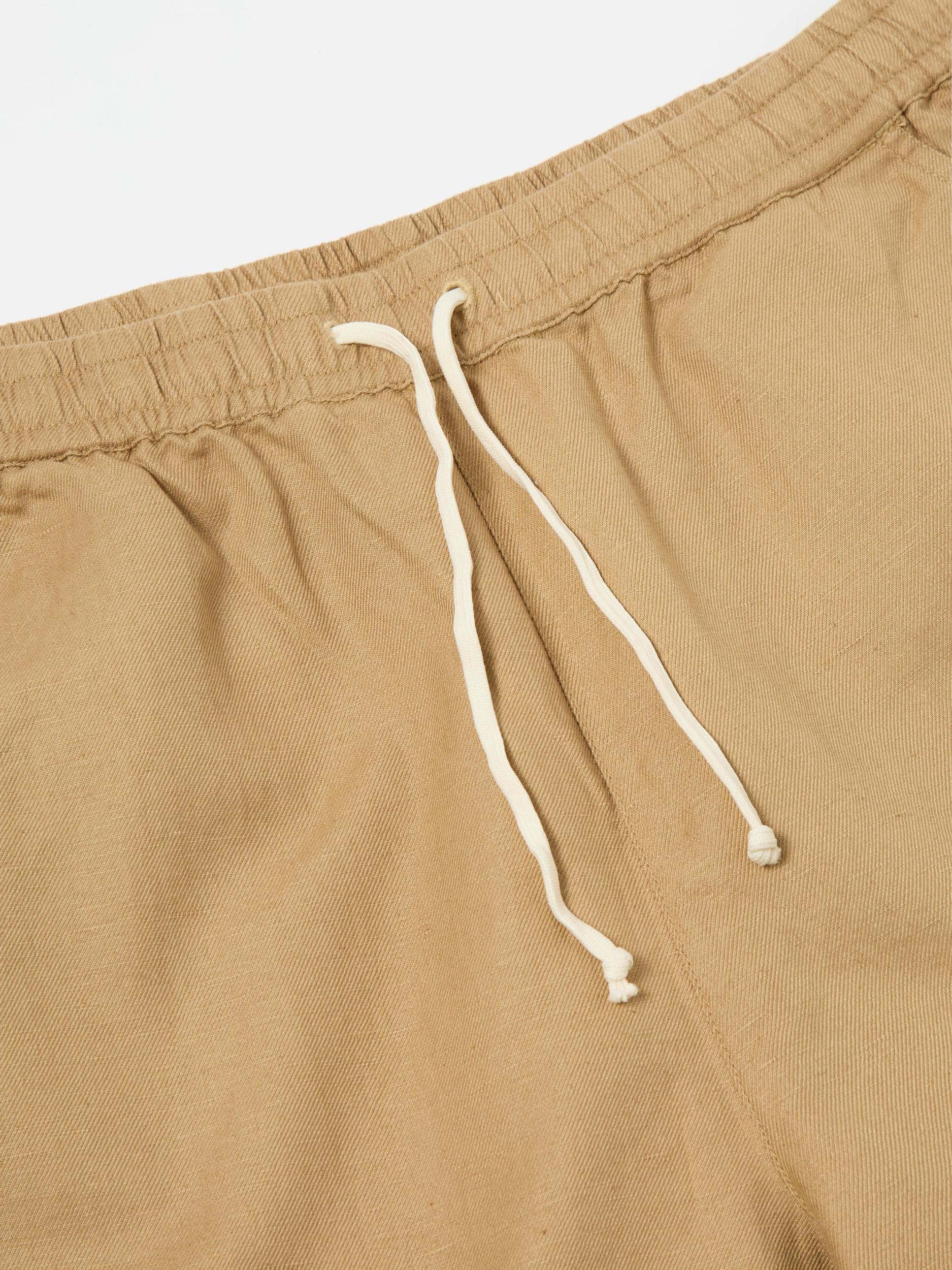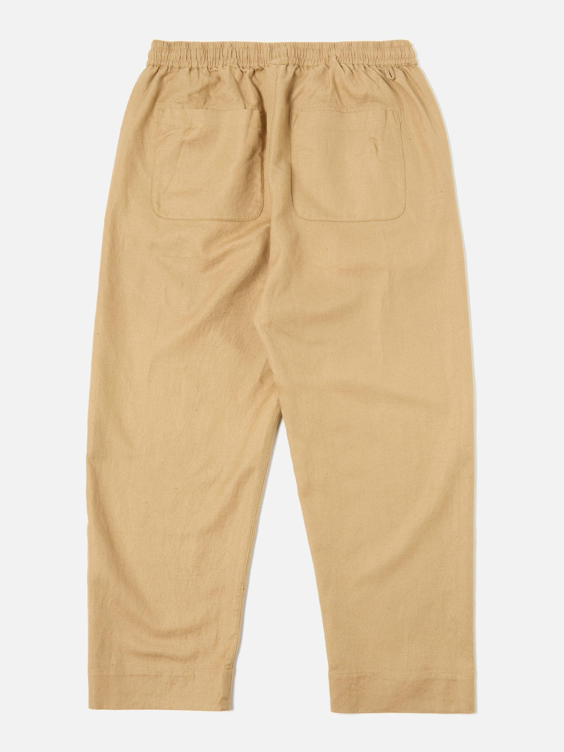 Brand new for SS24; inspired by the simple, wide, and loose trouser style worn for practising martial arts. A stylish, yet comfortable trouser for great freedom of movement. This is a great medium-weight cotton linen fabric. A tailoring blend cloth for a soft, yet structured fabric that carries off a great jacket or pant! A summer staple in a garment-dyed summer colour. • Product Code: P3029. • Drawcord, elasticated waist. • Rear panel detail. • No fly. • Two front pockets. • Two rear patch pockets. • Simple relaxed fit. • Fabric Content: 65% Cotton, 35% Linen. • Washcare: Wash at 30 degrees. Do not bleach. Do not tumble dry. Warm iron. Do not dry clean. Wash like colours together. Do not iron decoration. [sizing] Our model is 6' 0'' with a 32’ Waist and is wearing a size ‘32.’ Please be aware that the measurements below are technical measurements that are based on the garment laid flat and are useful as a general guide only. You can find a trouser fitting guide on our journal here. For advice on sizing, we have a small guide available here - or alternatively, contact us if you'd like any help. Measured in Centimetres. 28" 30" 32" 34" 36" 38" Outside Leg - Inc. Waistband. 93 96 99 103 106 106 Waist. 37.5 40 42.5 45 47.5 50 Thigh - 2.5cm Below Crotch. 34.5 36 37.5 39 40.5 42 Hem Opening Width. 20 21 22 23 24 25 Front Rise Inc. Waistband. 34.5 35.5 36.5 37.5 38.5 39.5 Back Rise Inc. Waistband. 44.5 45.5 46.5 47.5 48.5 49.5