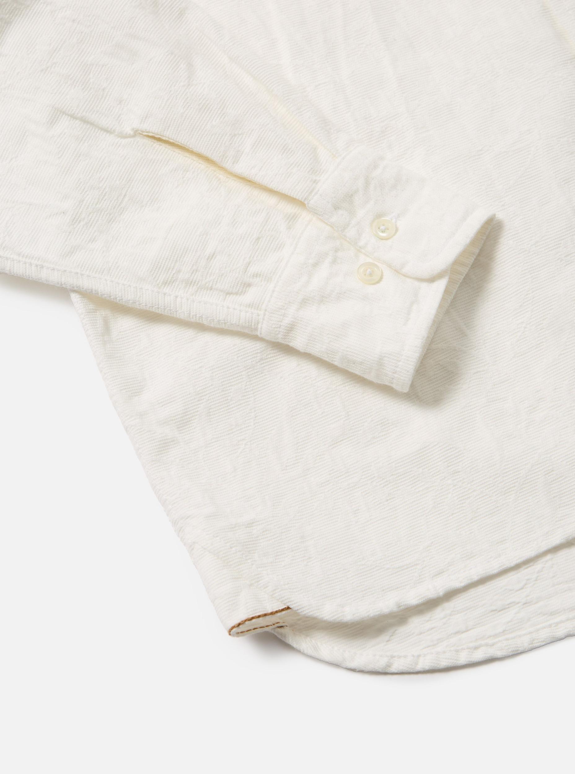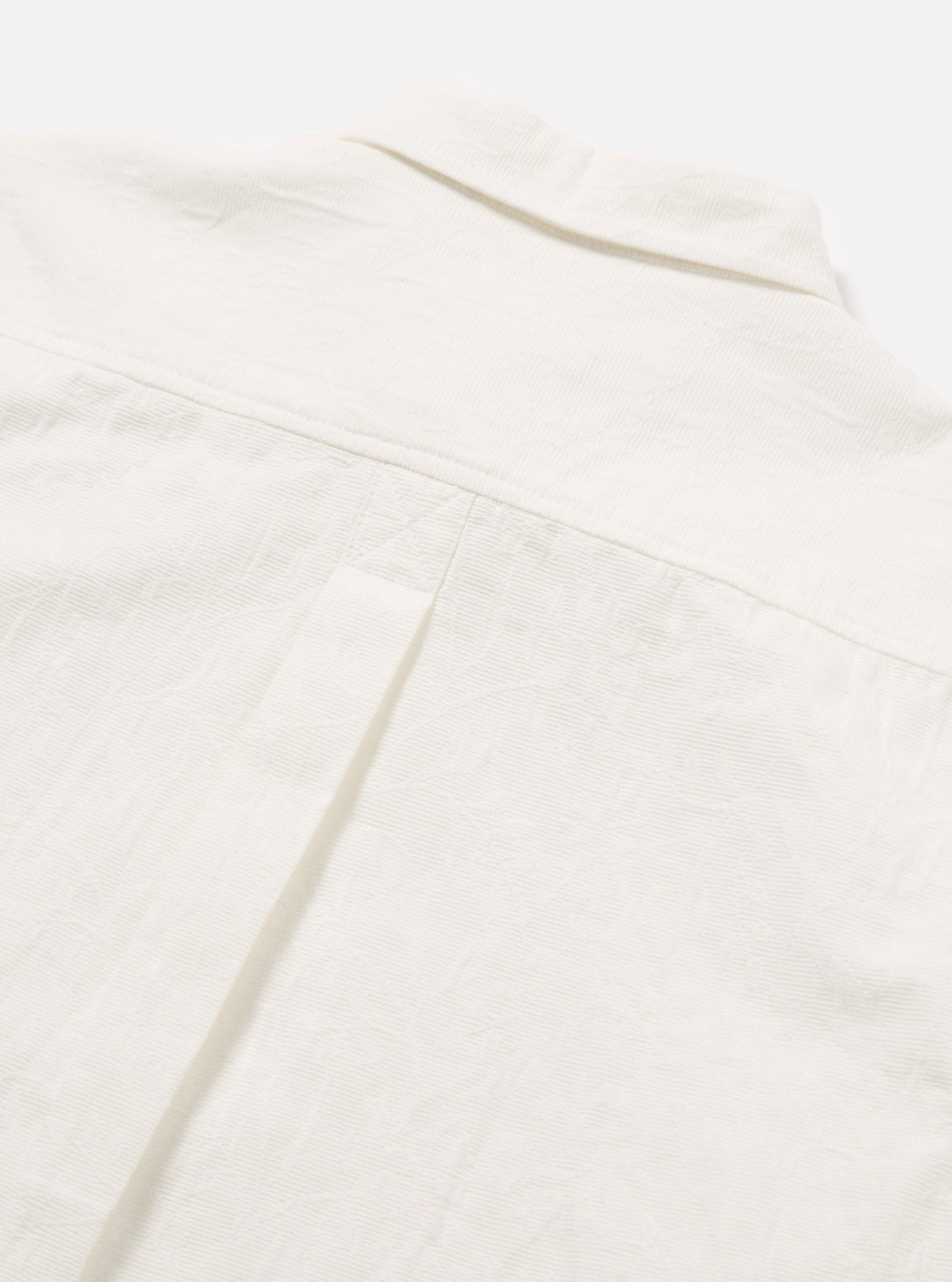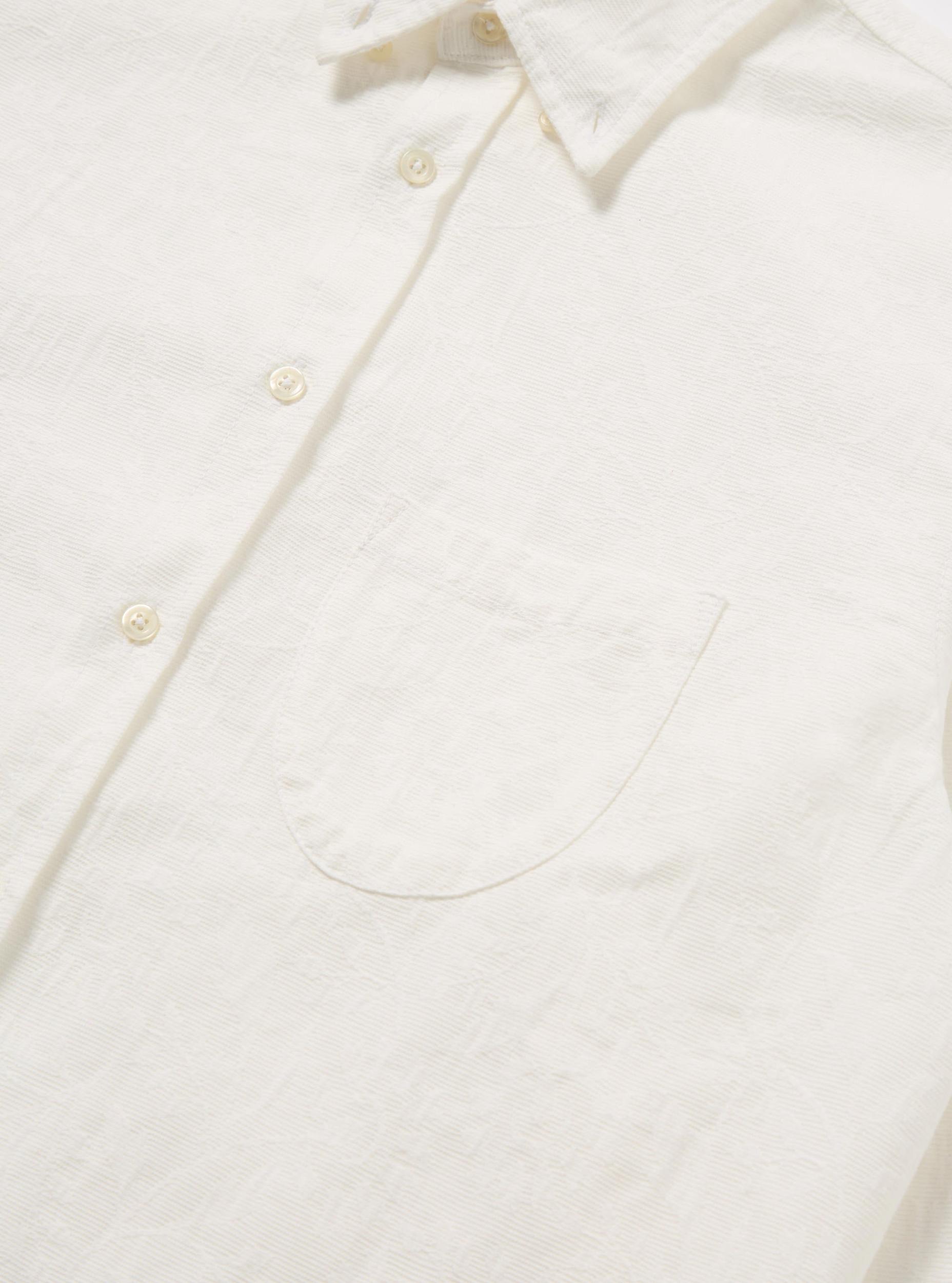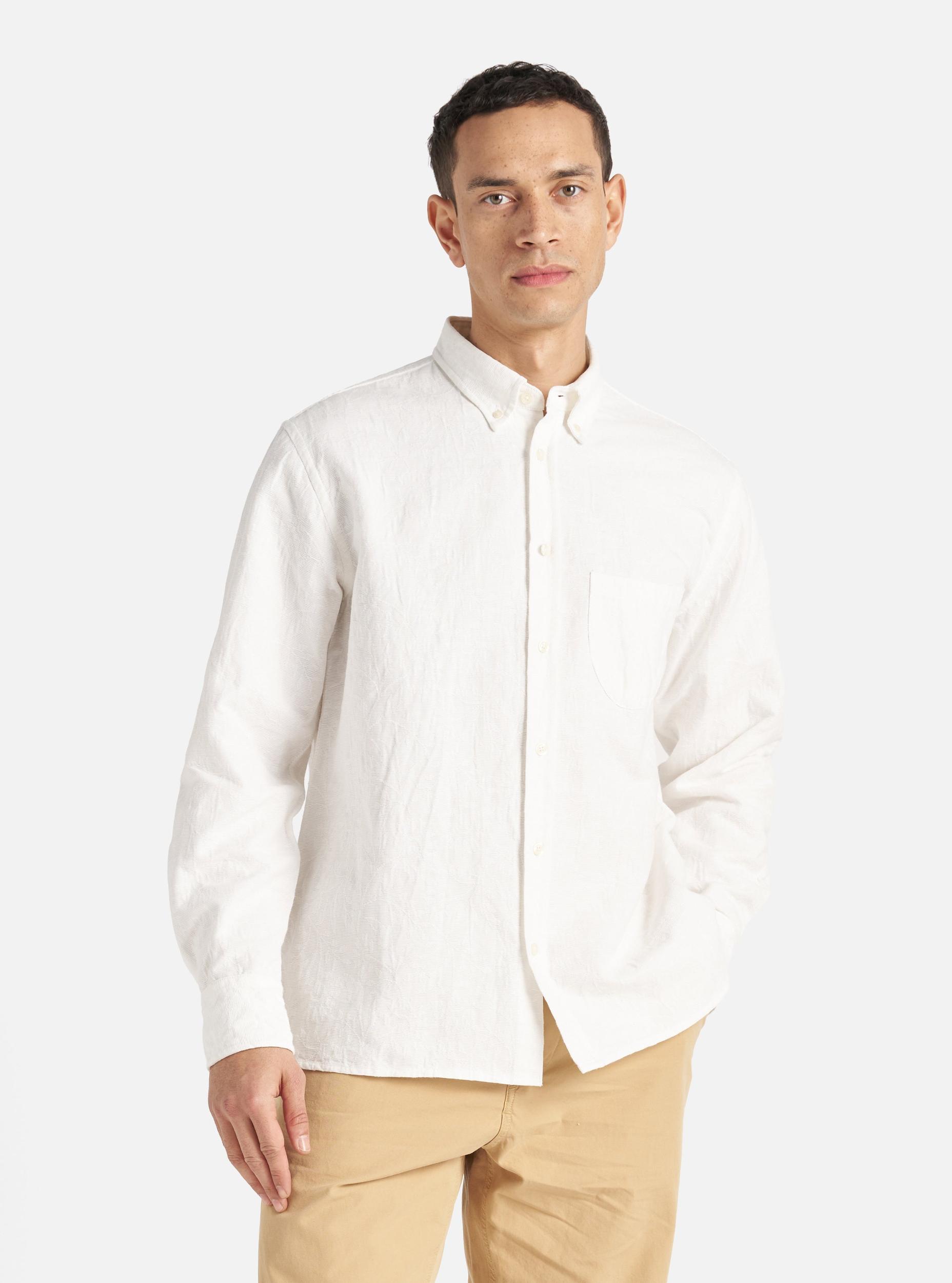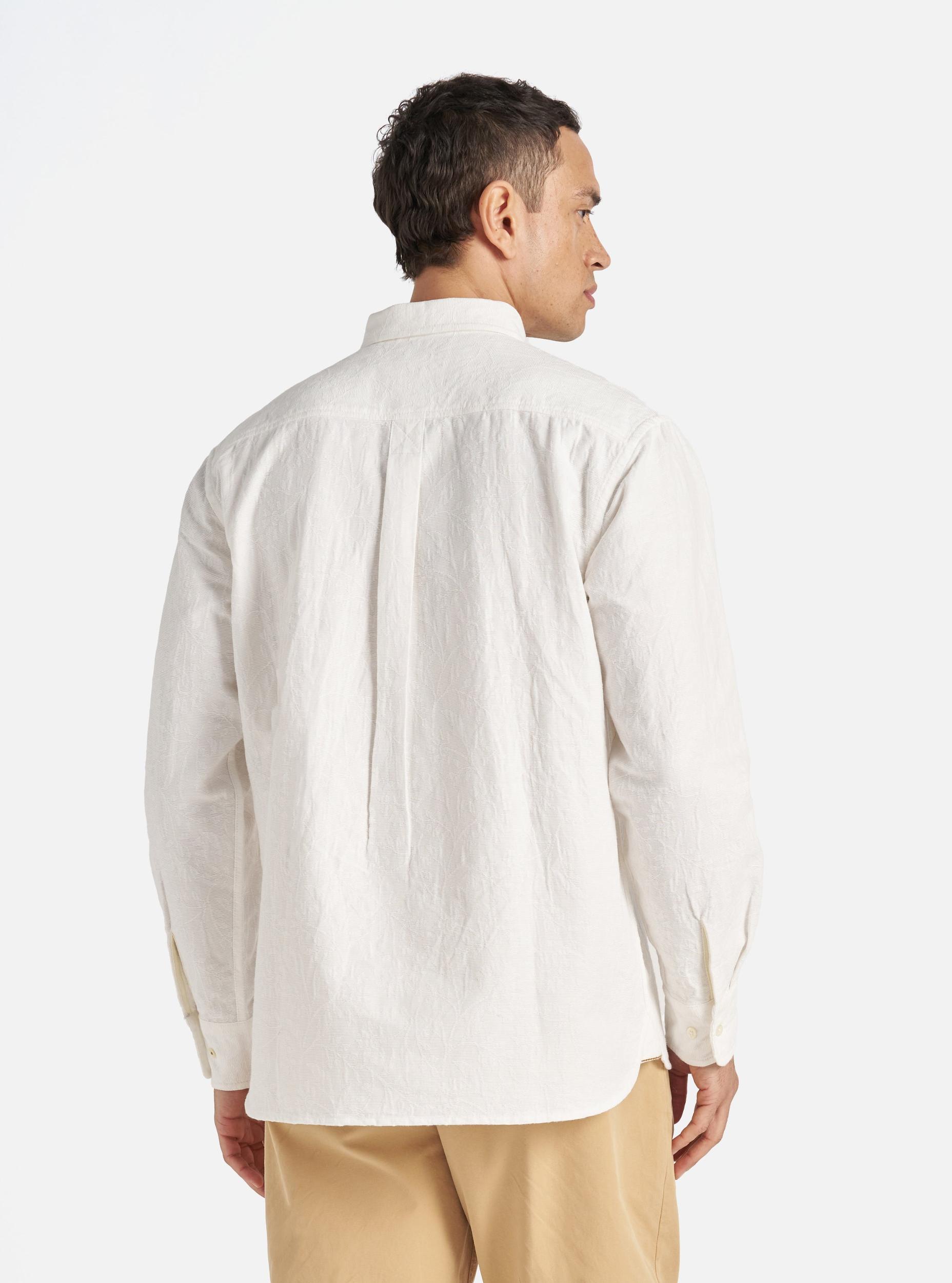 A button-down shirt to be worn unbuttoned for those lazy days. With a single asymmetric pocket as a throwback to one of our original pocket shapes. Our model is 6' 0'' with a 38' Chest and is wearing a size ‘Large.’ An intricately-woven floral jacquard self-colour pattern on 100% cotton. • Relaxed fit. • Button down collar. • Asymmetrical chest pocket. • Back yoke with box pleat. • Fabric Content: 100% Cotton. • Washcare: Wash at 30 degrees. Do not bleach. Do not tumble dry. Warm iron. Do not dry clean. Wash like colours together. Do not iron decoration. • Please be aware that the measurements below are technical measurements that are based on the garment laid flat and are useful as a general guide only. Measured in Centimetres. XS S M L XL XXL XXXL Centre Back Length. 72 74 76 78 80 82 84 Chest Width - 2.5cm Below Armhole. 53.5 56 58.5 61 63.5 66 68.5 Sleeve Length - From Shoulder (inc. Cuff.) 60.5 62 63.5 65 66.5 68 69.5 Across Shoulders. 44 46 48 50 52 54 56