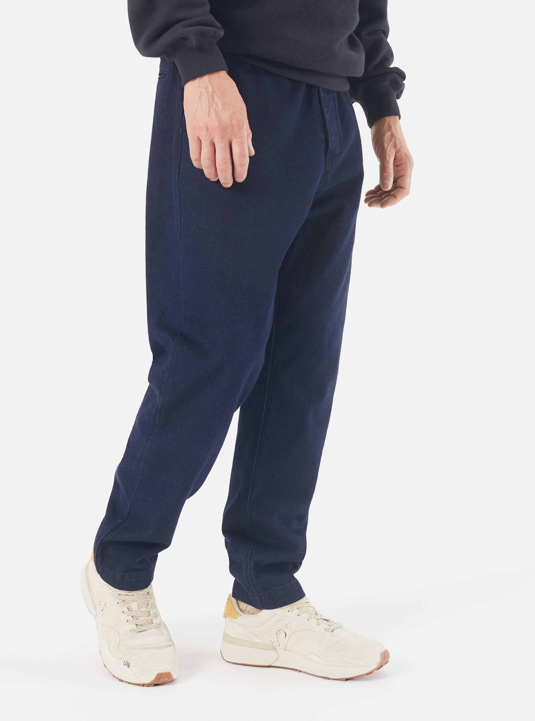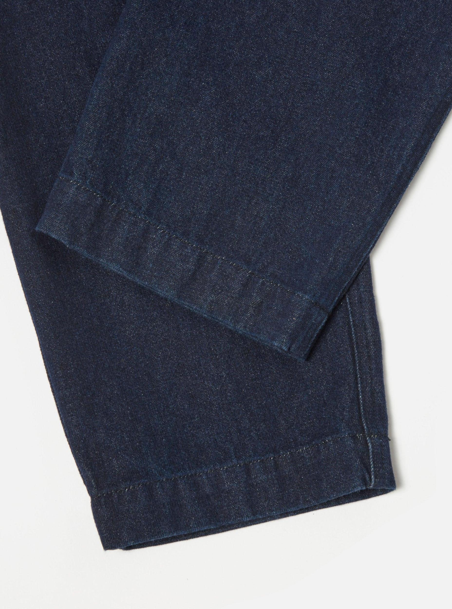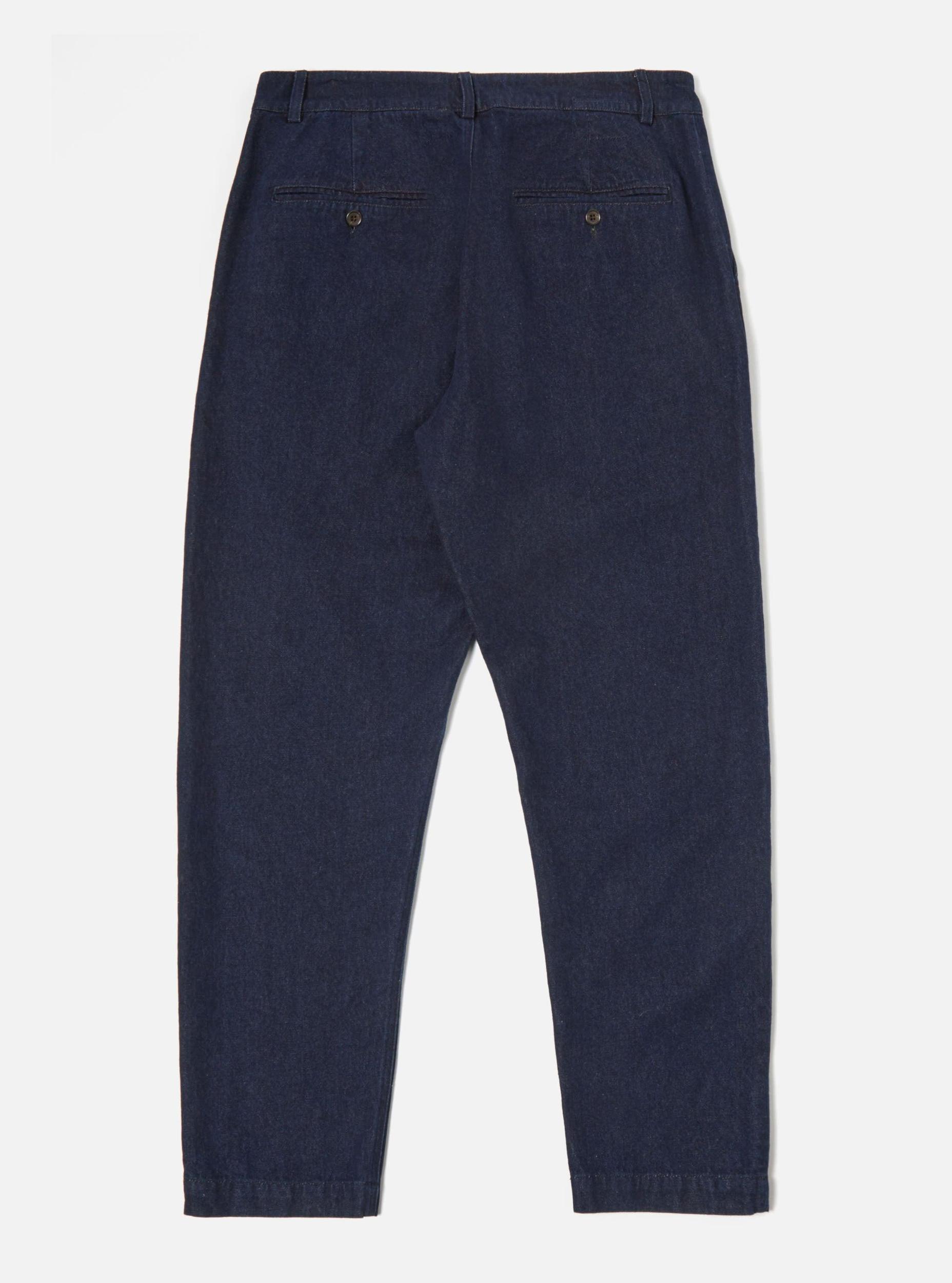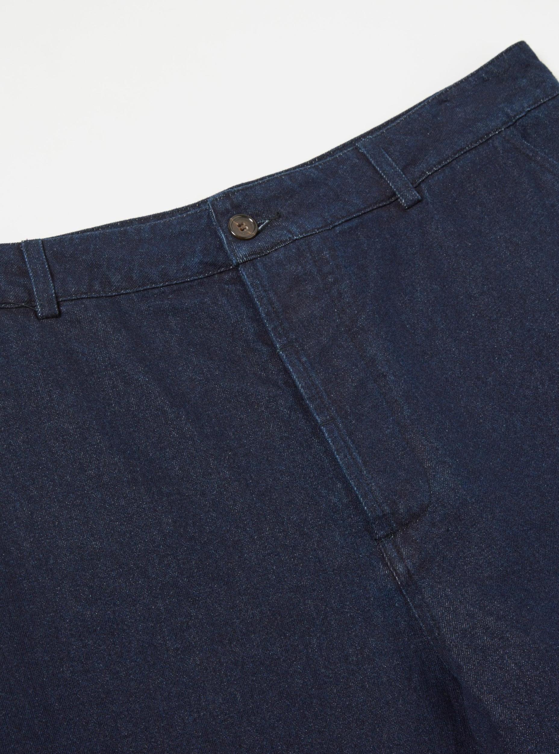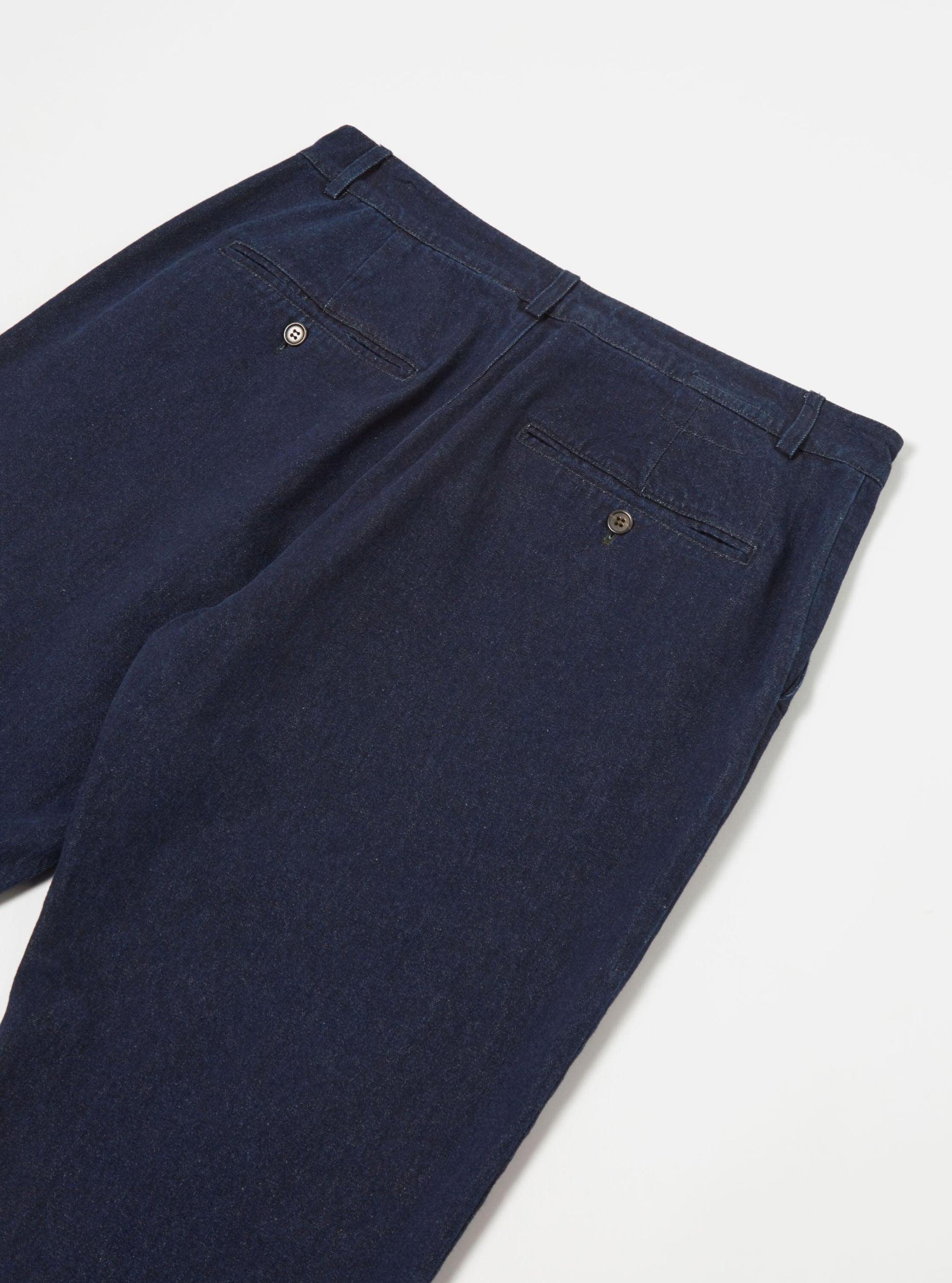 Our contemporary classic, great-fitting trouser shape. 11oz denim designed by our long-term Portuguese dedicated denim specialists. This is a medium-weight, right-hand twill Indian woven ‘Misato’ denim, that has been traditionally dyed with natural plant-based indigo. The denim is then given a rinse garment wash to remove any shrinkage. Super comfortable and easy to wear, this is a hard-wearing denim that is destined to be your new go-to. Made in Portugal by one of our favourite trouser makers, we’ve been working with them since 2011. This garment is dyed with indigo. Take care as some colour transfer may occur when worn close to lighter-coloured garments and furniture. Like your favourite jeans, this garment will gradually fade with wear. Wash separately. • Product Code: 00137. • Comfortable, loose fit through the hips and thigh. • Leg tapers through to hem. • Mid-rise. • Button fly. • Two front pockets. • Two rear jetted buttoned pockets. • Fabric Content: 85% Cotton, 15% Recycled Cotton, 100% Cotton Trim. • Washcare: Wash at 30 degrees. Do not bleach. Do not tumble dry. Cool iron. Do not dry clean. Wash like colours together. [sizing] Please be aware that the measurements below are technical measurements that are based on the garment laid flat and are useful as a general guide only. You can find a trouser fitting guide on our journal here. For advice on sizing, we have a small guide available here - or alternatively, contact us if you'd like any help. Measured in Centimetres. 28" 30" 32" 34" 36" 38" Outside Leg - Inc. Waistband. 100 103 106 110 113 113 Waist. 38.5 41 43.5 46 48.5 51 Thigh - 2.5cm Below Crotch. 32 33.5 35 36.5 38 39.5 Hem Opening Width. 17 17.75 18.5 19.25 20 20.75 Front Rise - Inc. Waistband. 32 33 34 35 36 37 Back Rise - Inc. Waistband. 39 40 41 42 43 44