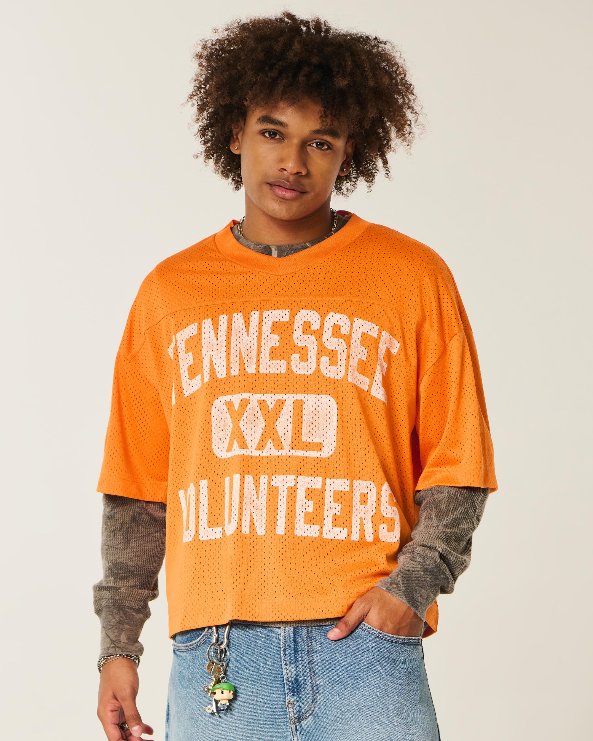 This classic football jersey is made with soft mesh fabric and features official licensed University of Tennessee print graphics. V-neckline, short sleeves. Baggy Crop Fit.