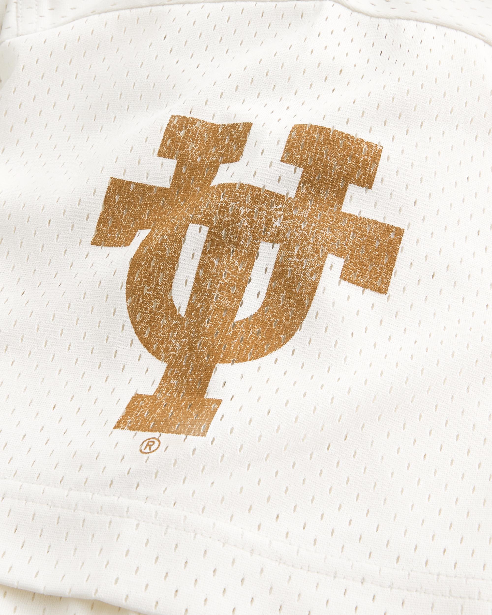 This classic football jersey is made with soft mesh fabric and features official licensed University of Texas print graphics. V-neckline, short sleeves. Baggy Crop Fit.