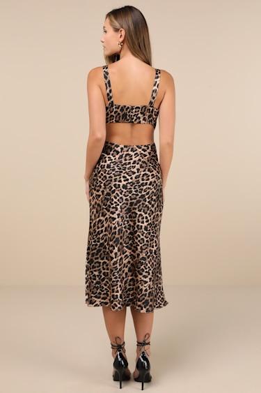 You'll be utterly unparalleled when you arrive in the Lulus Unmatched Elegance Tan Leopard Satin Sleeveless Midi Dress! Glossy woven satin (with a leopard print design) dips low to a V-neckline at the center of a sleeveless bodice with figure-flattering princess seams and a sexy cutout detail at back, secured by a row of upscale covered buttons. High waist sits atop a midi skirt that sways like a dream as you strut across the dancefloor with a drink in hand! Hidden side zipper/clasp.