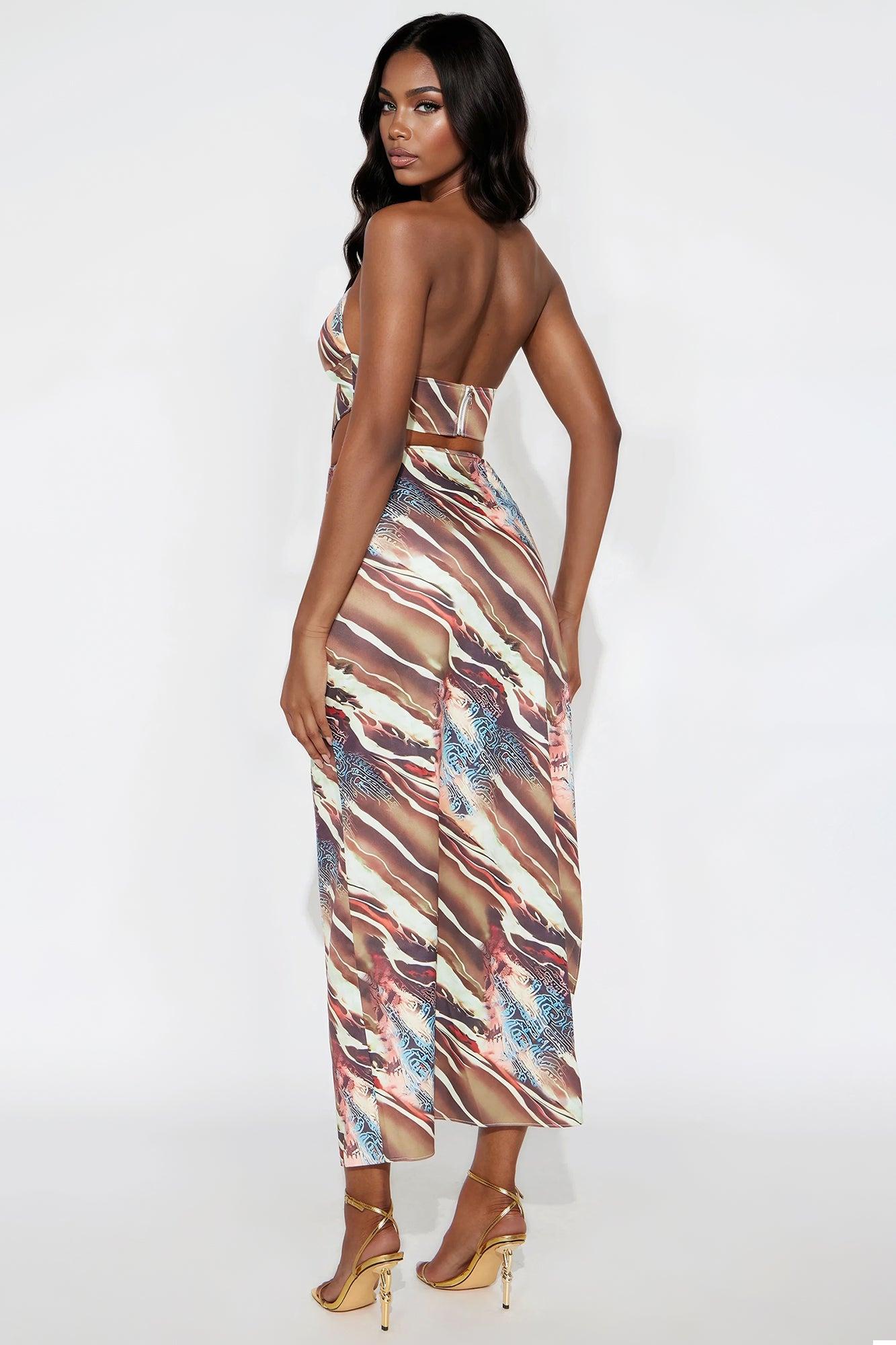 Available In Brown/combo. 2 Piece Ensemble Halter Top and Maxi Skirt Set Top With Zipper Back Closure Adjustable Straps Non Stretch Invisible Side Zipper Closure On Skirt Side Front Slit Metal Detail Disclaimer: Due To The Printing Process A Difference In Saturation May Occur. Each Garment Is Unique Top Shell: 96% Polyester 4% Spandex Lining: 100% Polyester Bottom Shell: 96% Polyester 4% Spandex Imported
