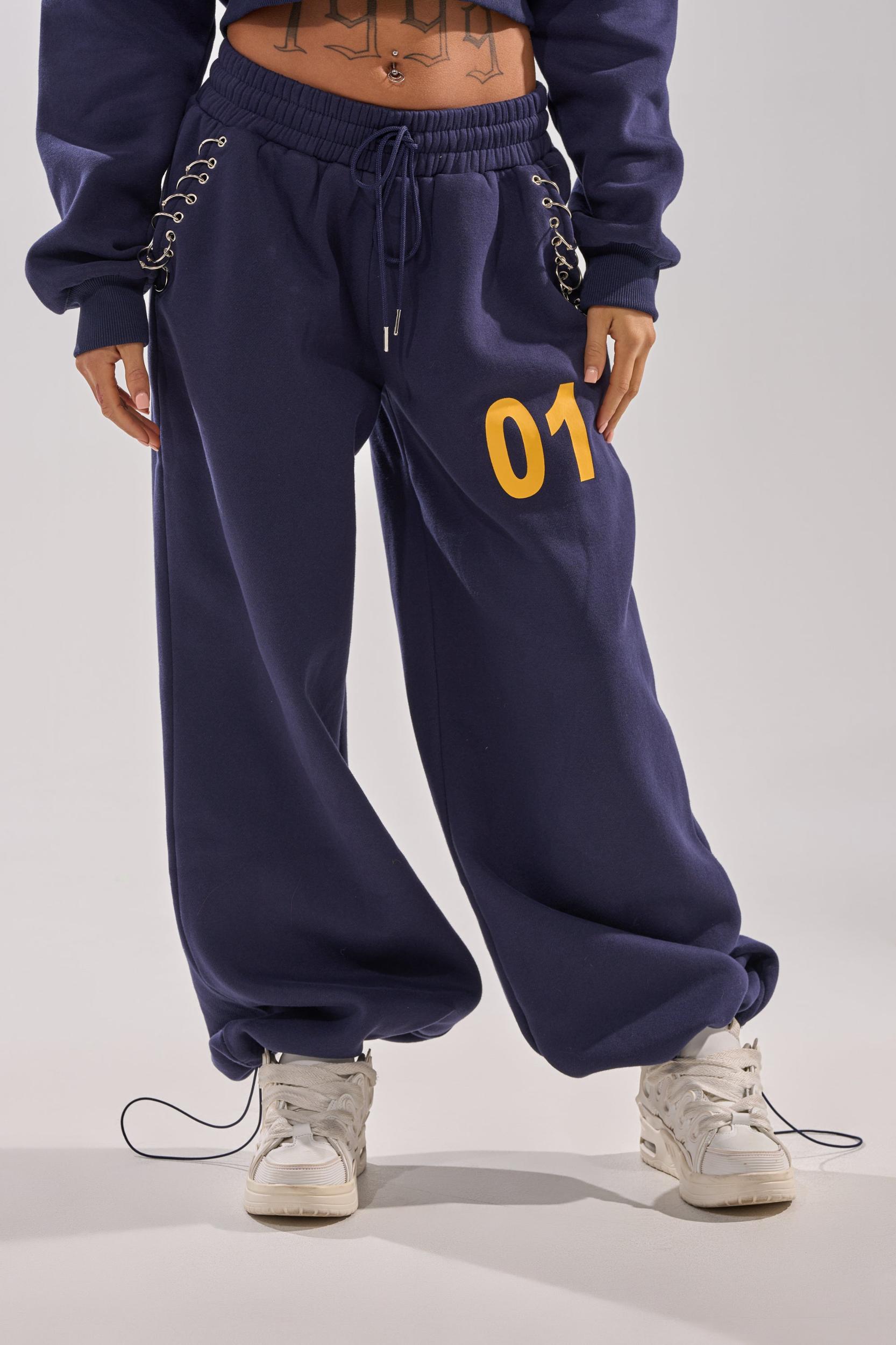These sporty, wide-leg sweatpants are crafted from a soft, mid-weight fleece fabric and features a high-rise elastic waistband with a drawstring closure, on seam waist pockets lined with silver metal ring detailing for an edgy touch, and a bold “01” graphic print on the upper thigh. Complete with adjustable bungee cord fastenings at the pant cuffs for an optional, cinched look. Style with the matching AKIRA Label Untamed Metal Ring Sweatshirt and sneakers, perfect for lounging, travel, or everyday casual wear. - Main: 50% Cotton 50% Polyester, Lining: 100% Polyester- Spot Clean Only- No Stretch- Imported (all measurements approximate from size small)- 11” Rise- 30” Inseam- Model is 5’7” and is wearing size smallProduct ID: 1077979 (all measurements approximate from size 1X)- 13” Rise- 30” InseamProduct ID: 1077983