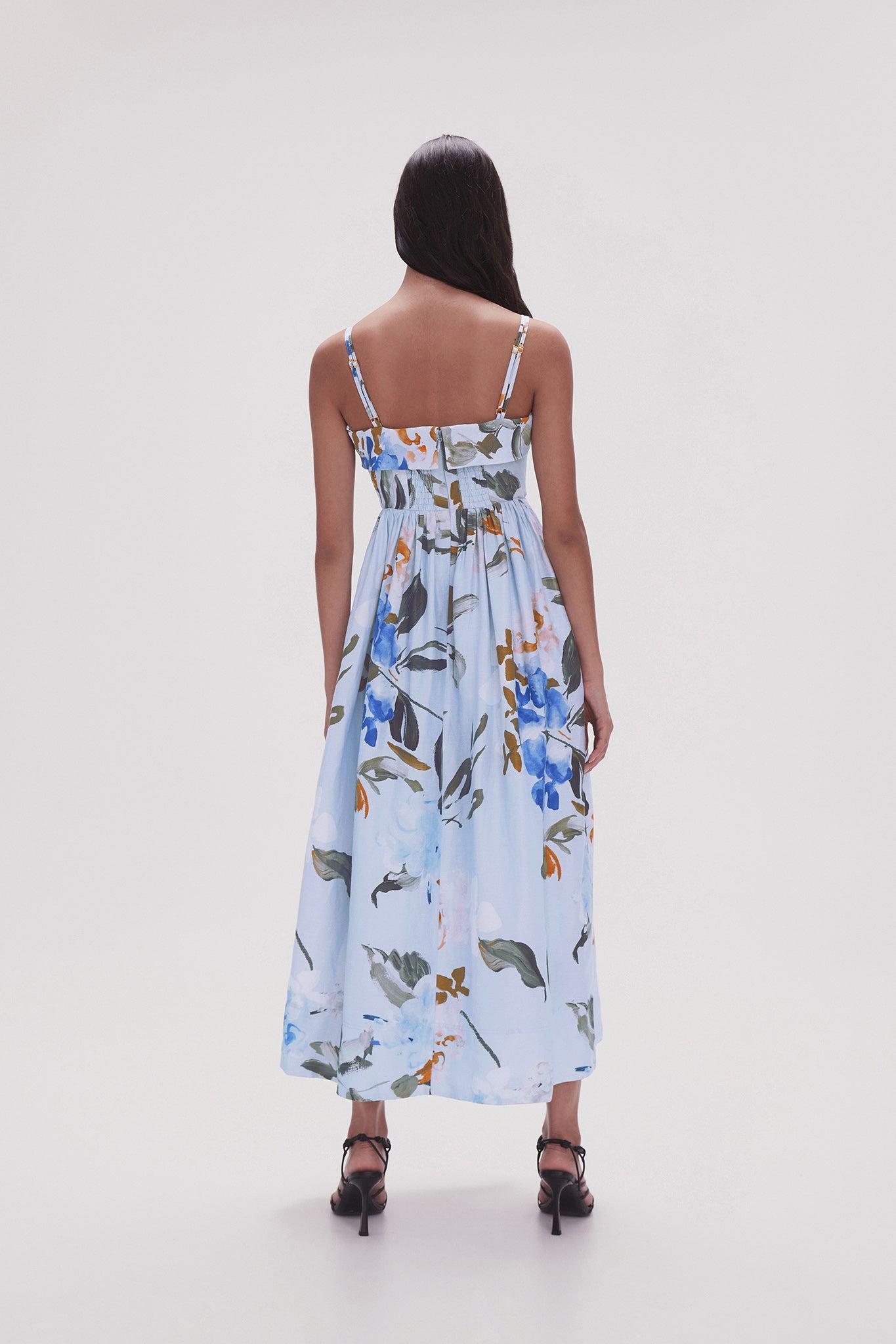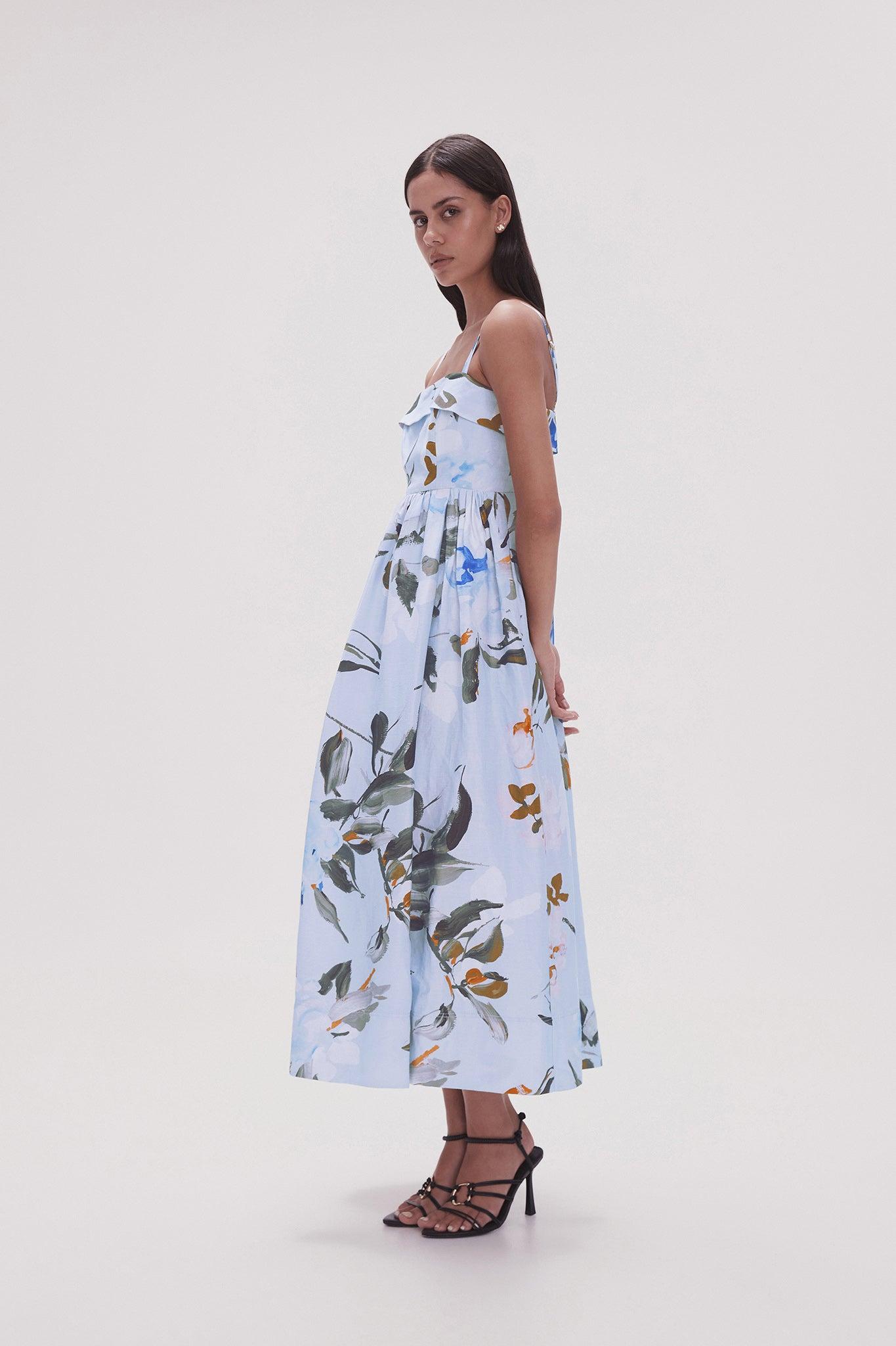 PRODUCT DETAILS Midi dress Square neckline Heavy stitch detailing Adjustable twin straps Fitted bodice Full skirt with gathers Zip, hook and eye closure Lined Shop All Dresses SIZE AND FIT Model wears a size AU 8/S Model: 178cm/ 5’10 Bust: 80cm Waist: 64cm Hips: 90cm FABRICATION 65% Linen 35% Viscose Dry Clean only