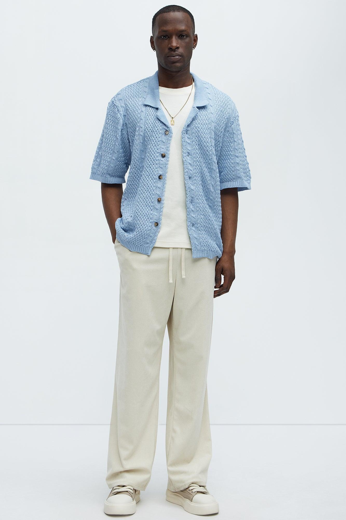 Unwind Cable Knit Short Sleeve Button Up - Blue