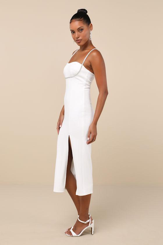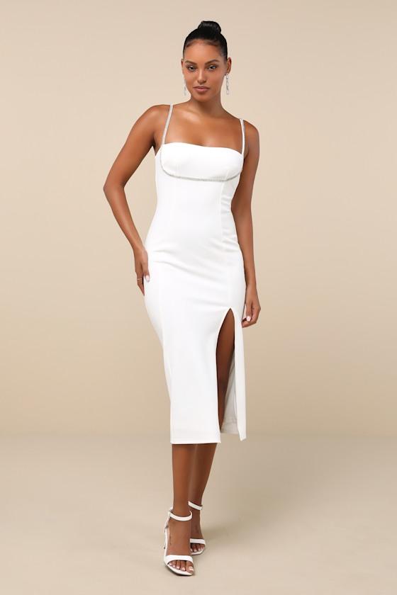 You'll make sparks fly everywhere you go in the Lulus Upscale Flirt Ivory Rhinestone Sleeveless Bodycon Midi Dress! Slightly stretchy crepe knit shapes this glitzy dress that falls from sparkling, rhinestone-embellished straps that flow into the darted bodice with a straight neckline (with hidden no-slip strips). The figure-fitting silhouette shows off your curves just right before ending at a chic midi hem with a side slit. Hidden back zipper/clasp.