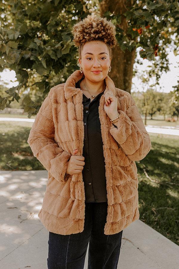 - From city strolls to special events, this stunning faux fur jacket has you covered! Its plush texture adds an effortless luxe feel to your look. - Fully lined faux fur material with a wide stripe design - A collared neckline with an open, draped front - Long sleeves - Hidden side pockets - A relaxed silhouette that ends in a straight hem