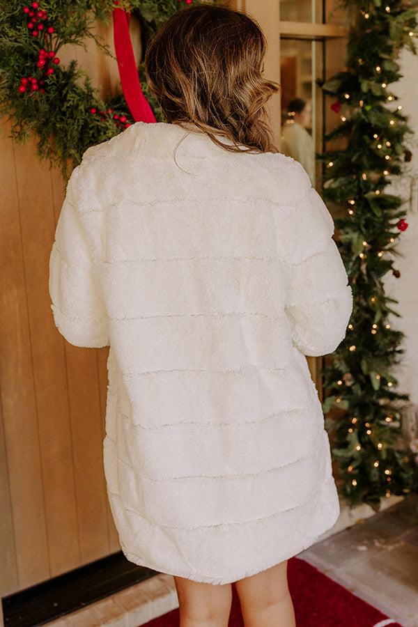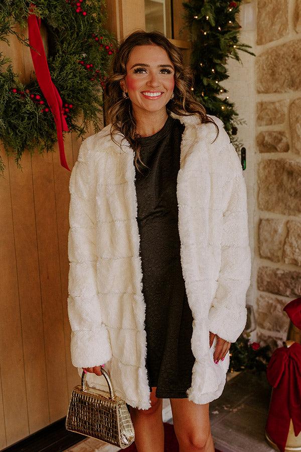 - From city strolls to special events, this stunning faux fur jacket has you covered! Its plush texture adds an effortless luxe feel to your look. - Fully lined faux fur material with a wide stripe design - A collared neckline with an open, draped front - Long sleeves - Hidden side pockets - A relaxed silhouette that ends in a straight hem