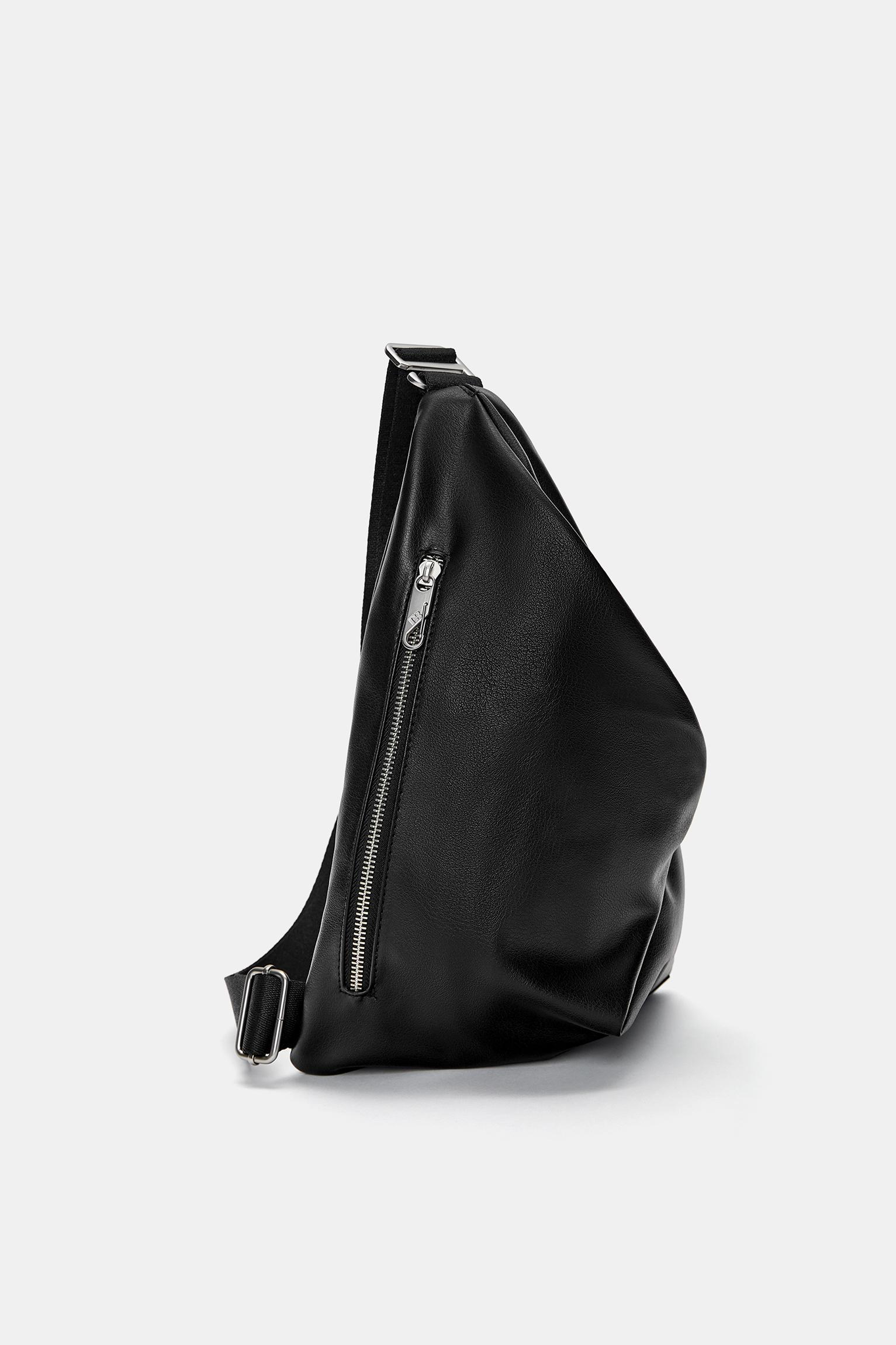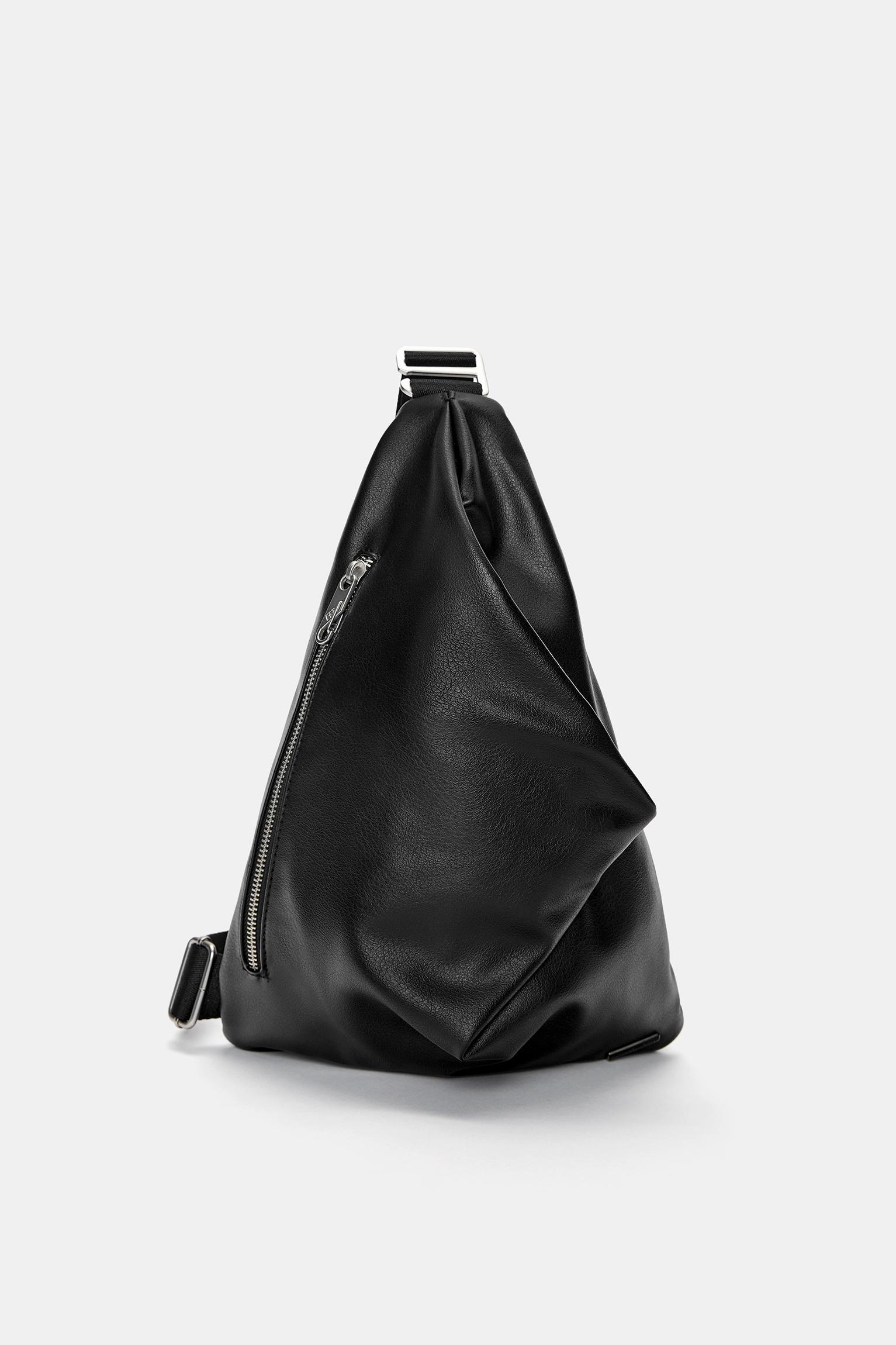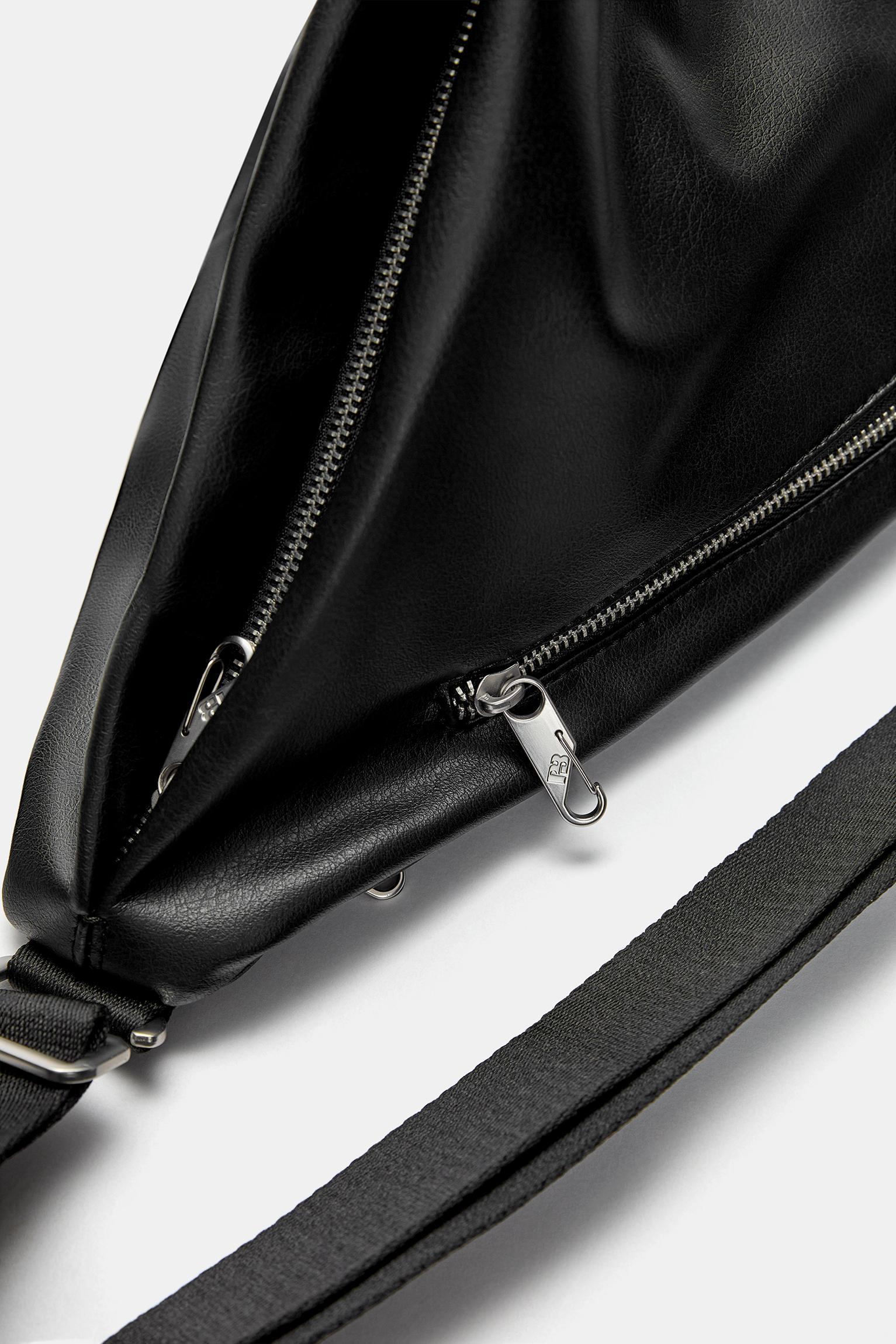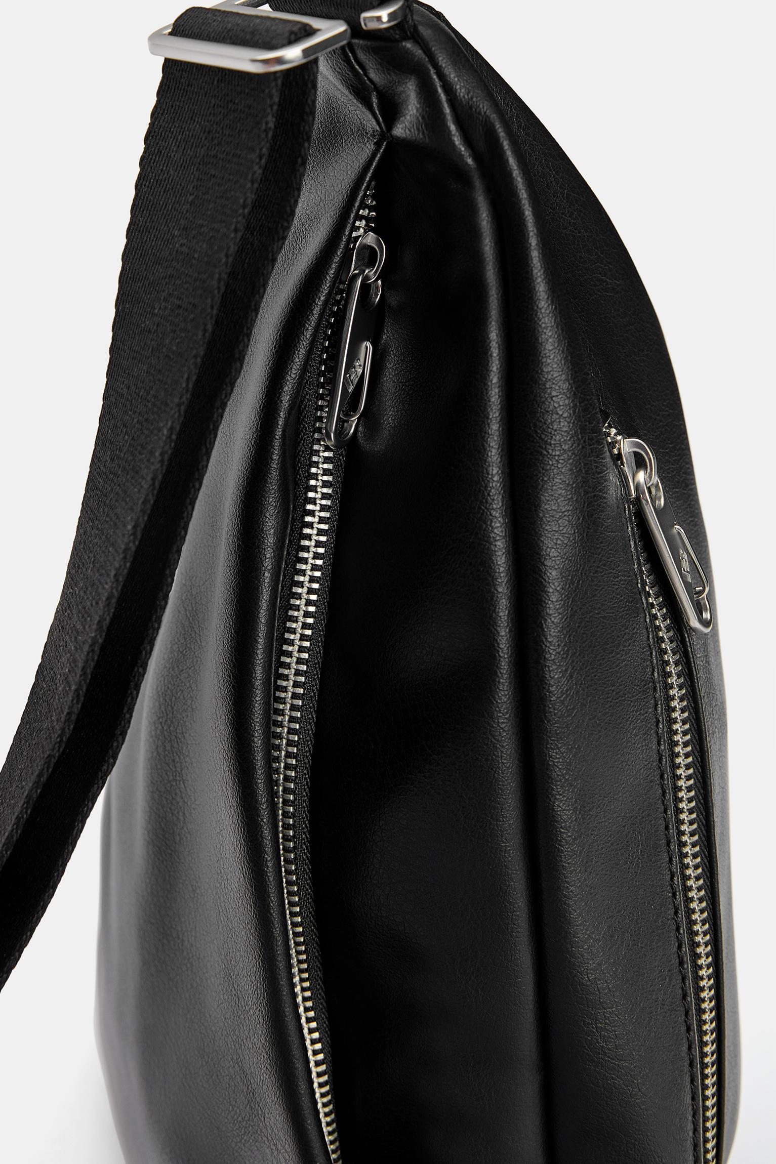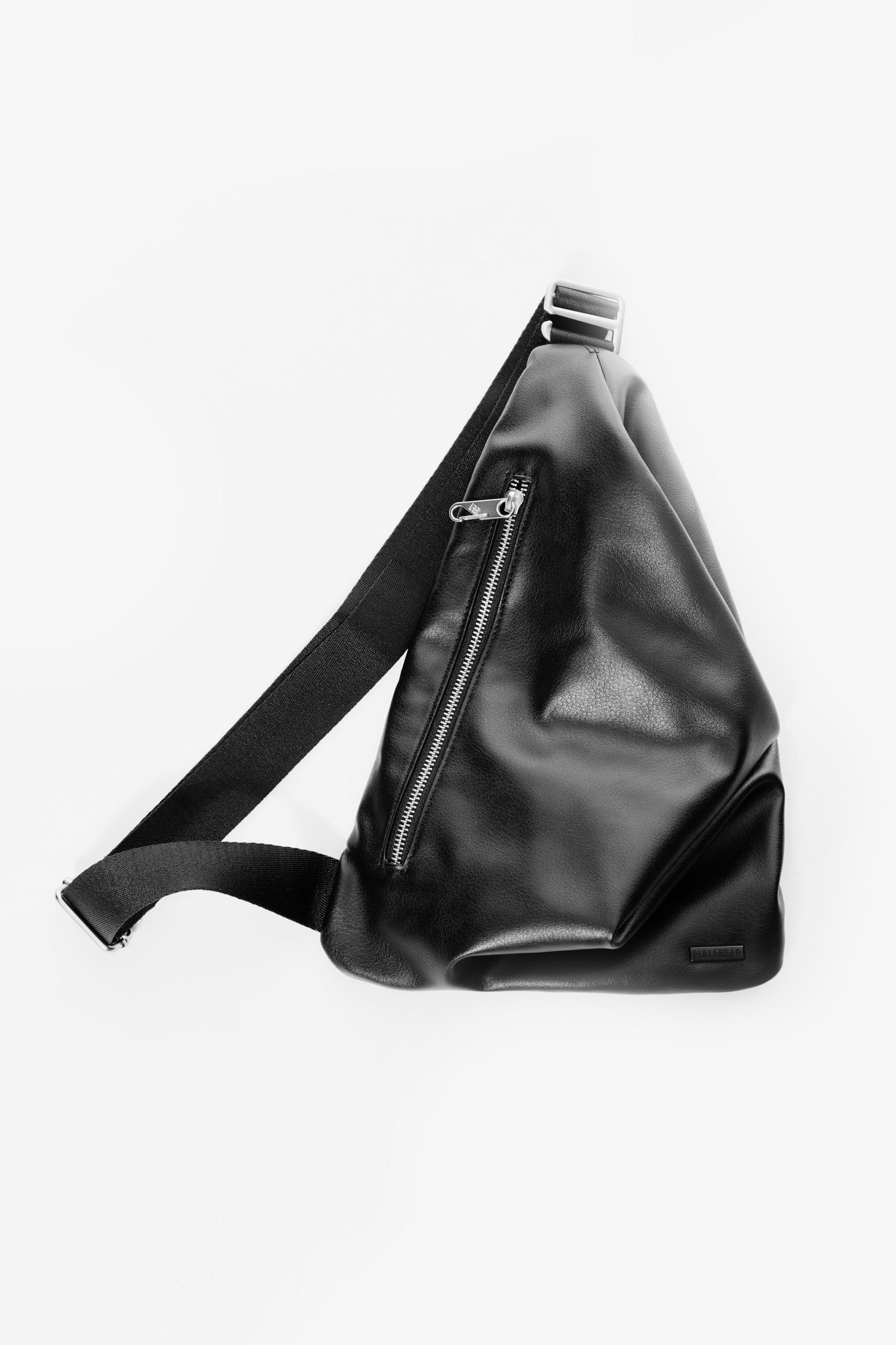 Faux leather crossbody bag, available in black. Adjustable long strap. Features multiple compartments. Magnetic flap closure. Height x Length x Width: 22 x 37.9 x 24 cm.