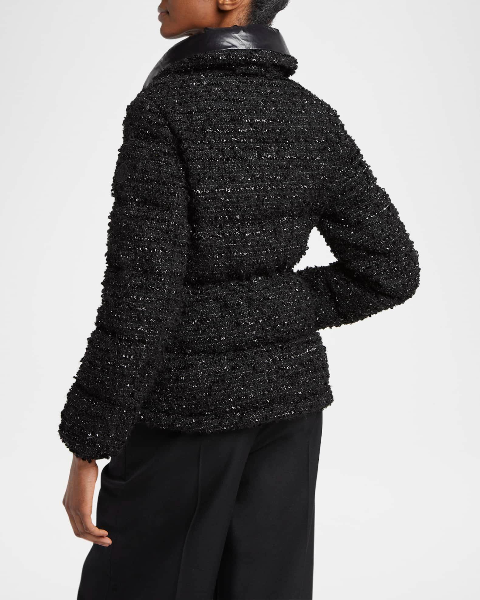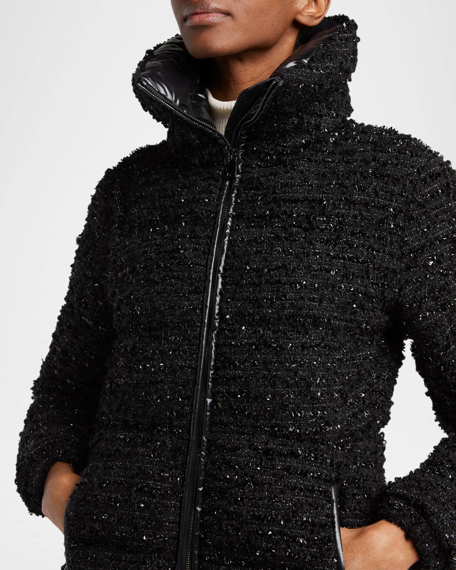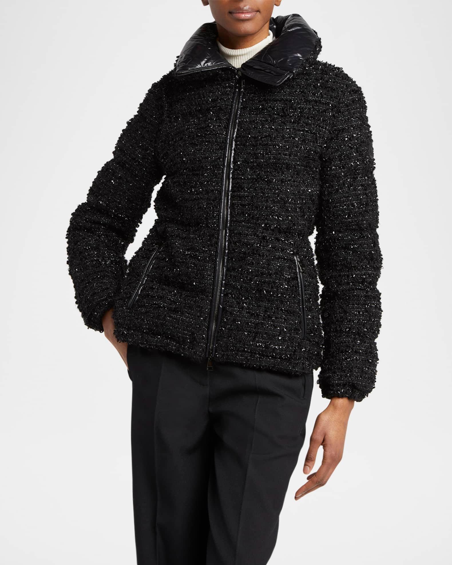 Moncler "Urbel" jacket is a fresh take on the classic puffer in sparkly on-trend tweed Stand collar Long sleeves Side zip pockets Classic fit Hem sits at the hip Two-way zip-front Mohair/cotton/wool Lining: Nylon Fill: Down/feather Professional cleaning recommended Imported