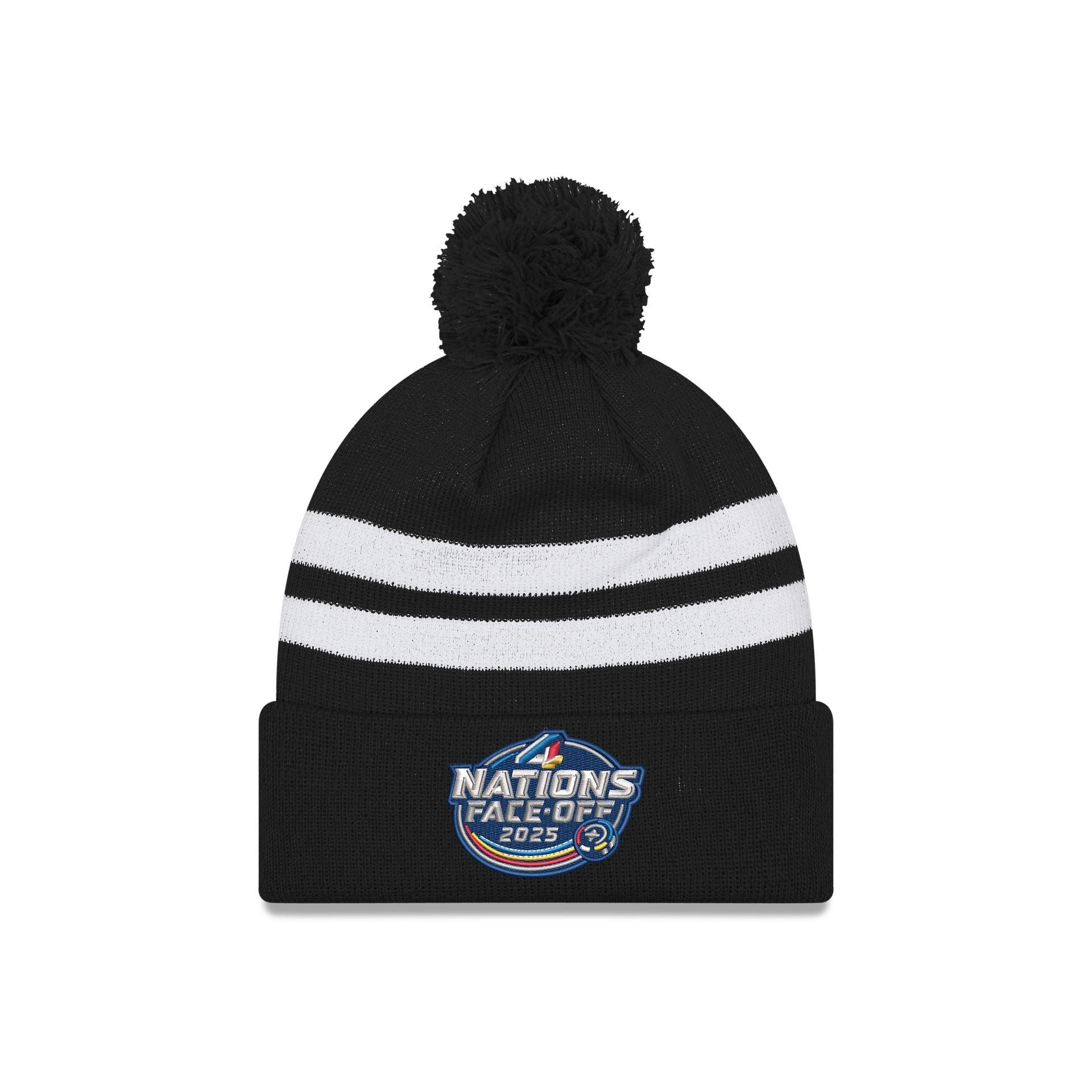 The USA 2025 4 Nations Face-Off Pom Knit features an embroidered USA logo at the front with a 2025 4 Nations Face-Off patch at the rear and a one-time removable pom.
