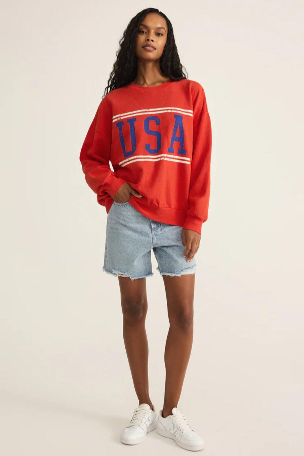 Stay cozy and classic in this oversized sweatshirt with a bold "USA" collegiate graphic. Made from soft 100% cotton brushed fleece, it’s the perfect everyday layer.
