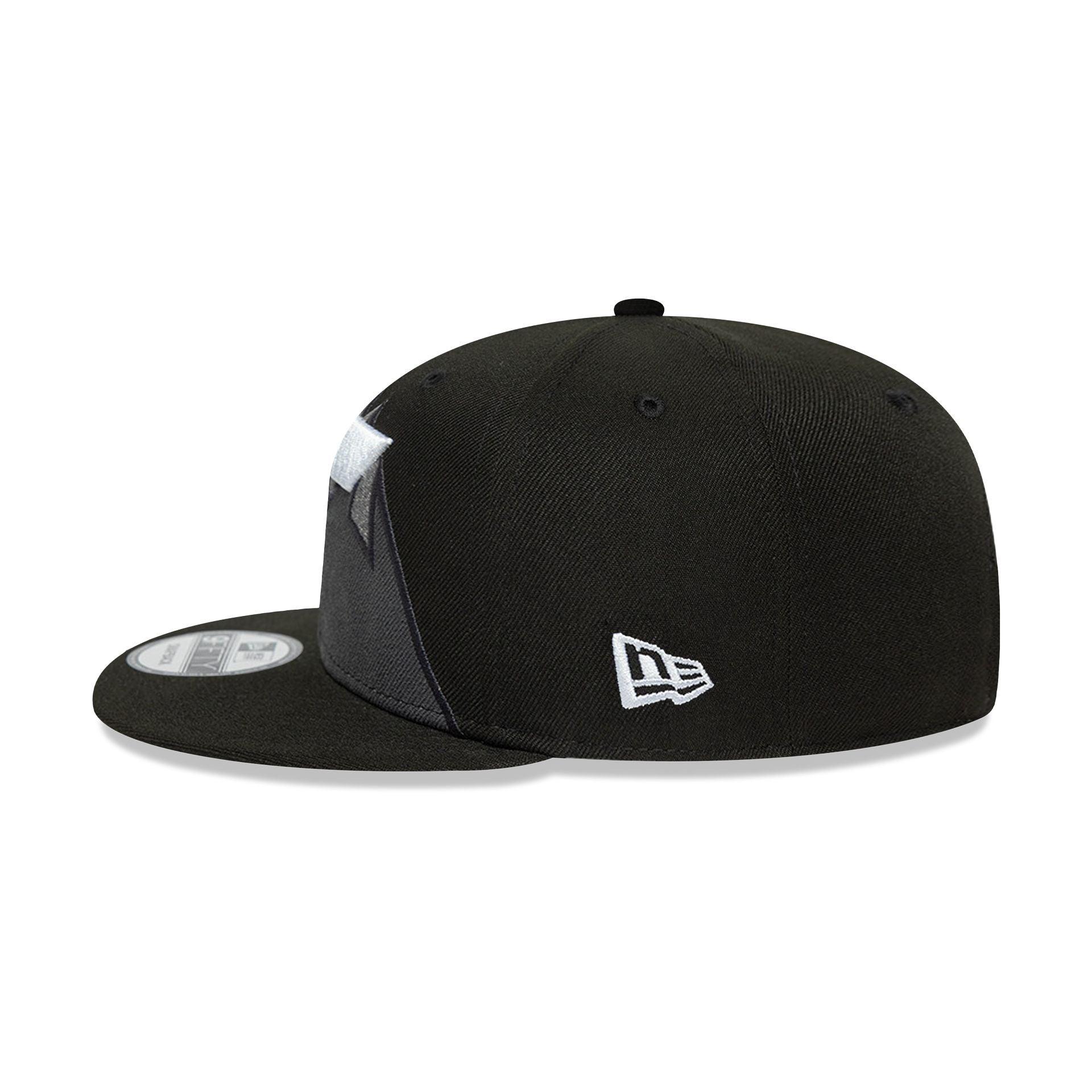 The Utah Jazz 2024 Statement Edition 9FIFTY Snapback features an embroidered Jazz logo at the front panels with a team logo at the right-wear side. Additional details include an NBA Logoman above a snapback closure at the rear and a gray undervisor.