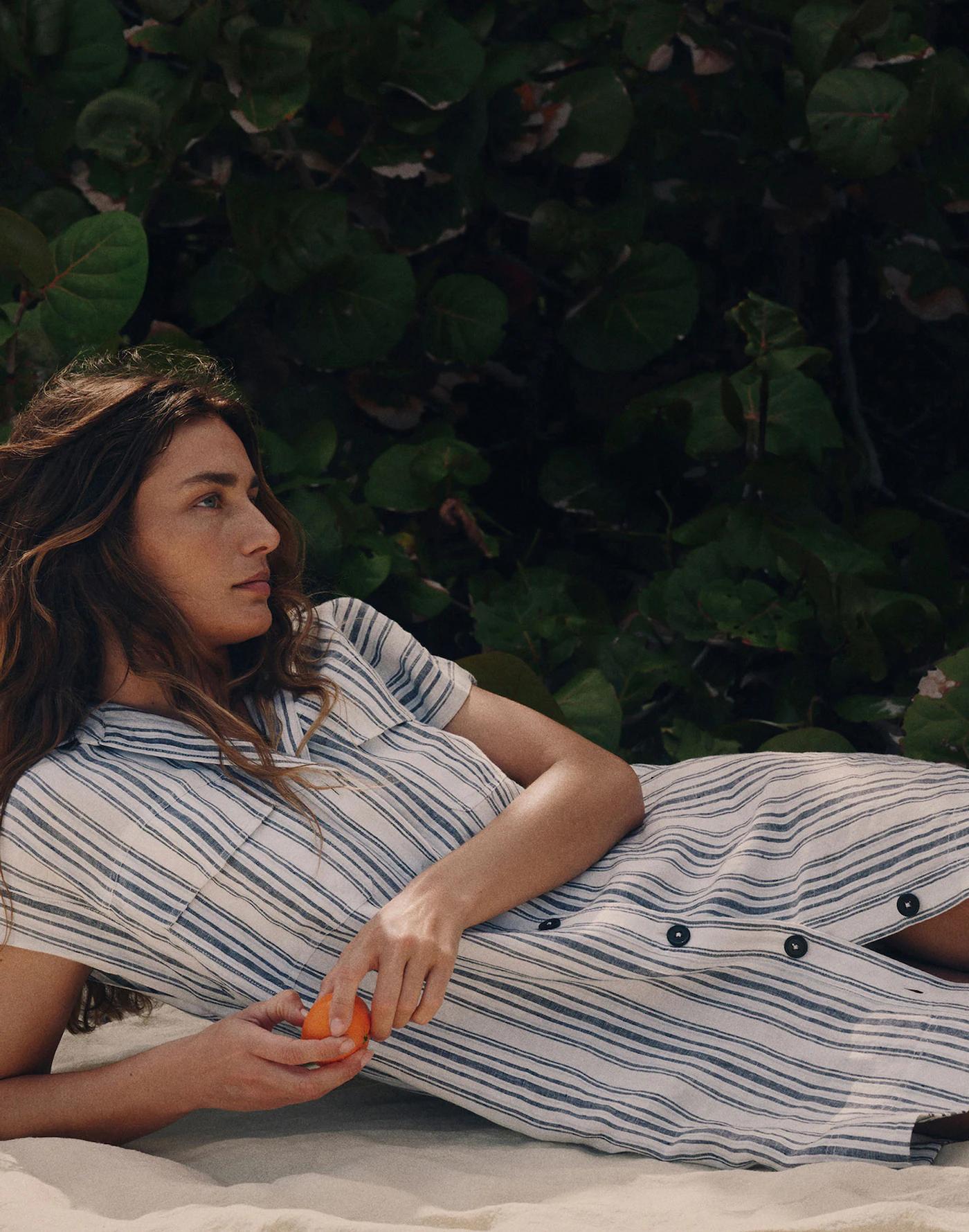 Light and airy in 100% linen, this striped shirtdress has a classic point collar, Y-neckline and patch pockets at the chest. A utility-inspired take on a classic silhouette.