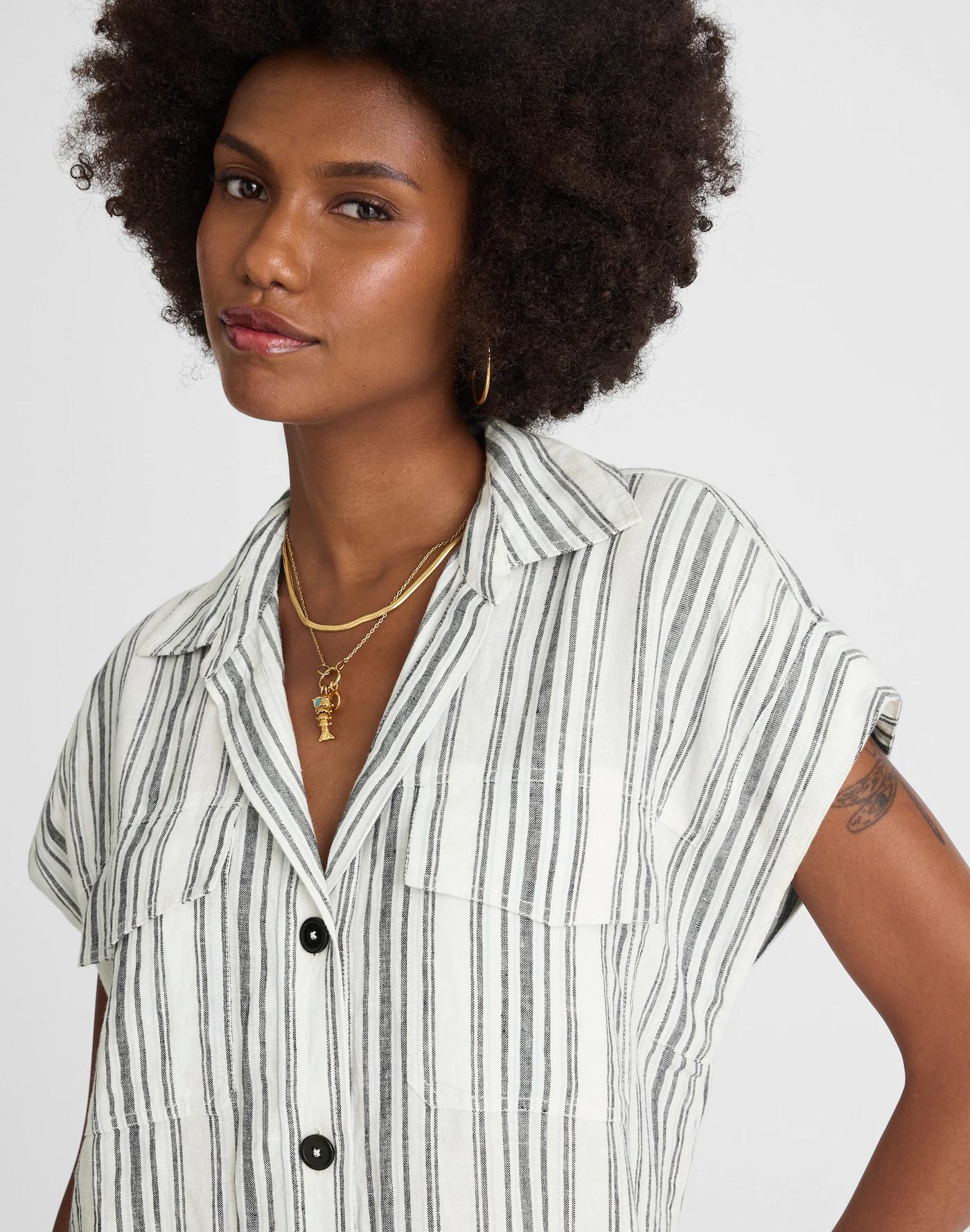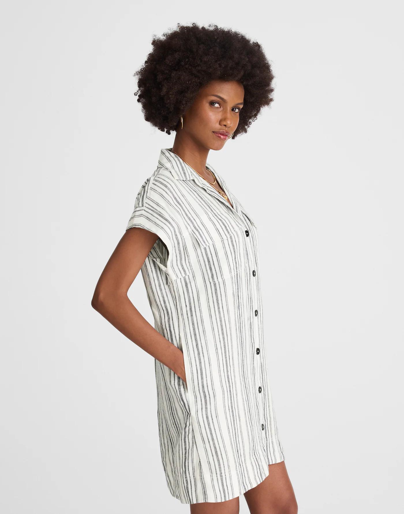 Utility Short-Sleeve Mini Shirtdress in 100% Linen