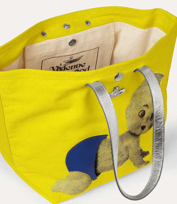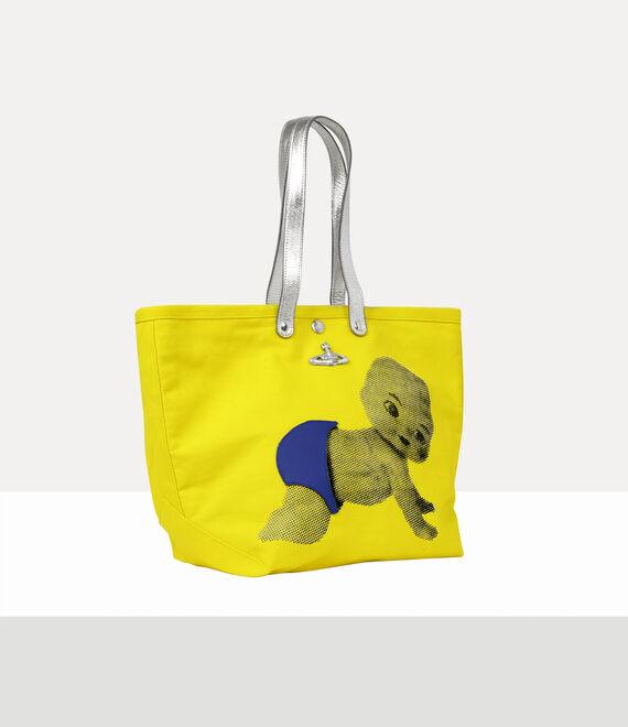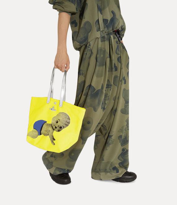 The Utility Small Shopper showcases a vibrant yellow cotton canvas silhouette, accented with metallic leather handles—drawing inspiration from our signature Studio Shopper tote range. This season’s 'Baby' artwork is hand-applied across the design, enhanced by a blue fabric appliqué for a playful, three-dimensional finish.