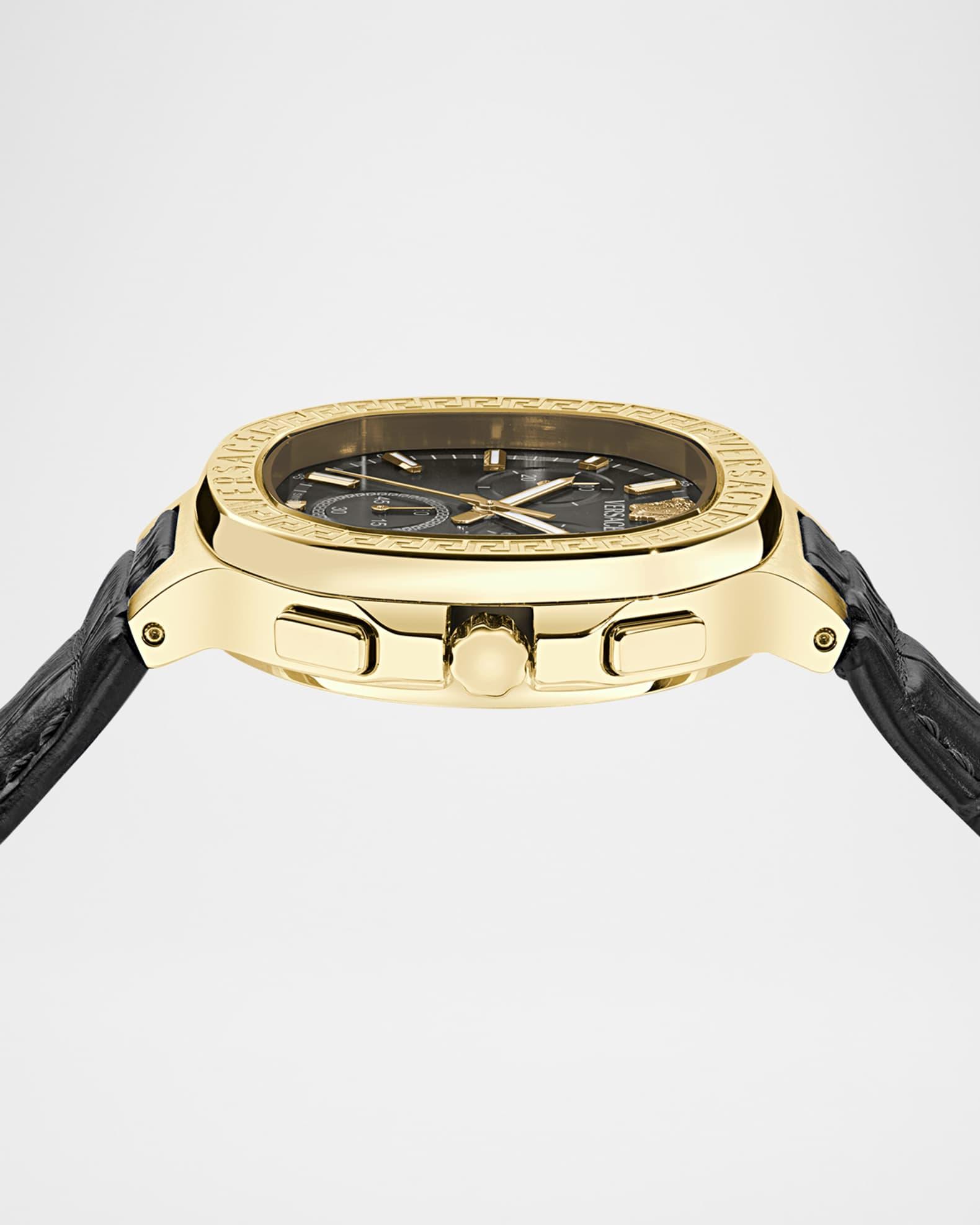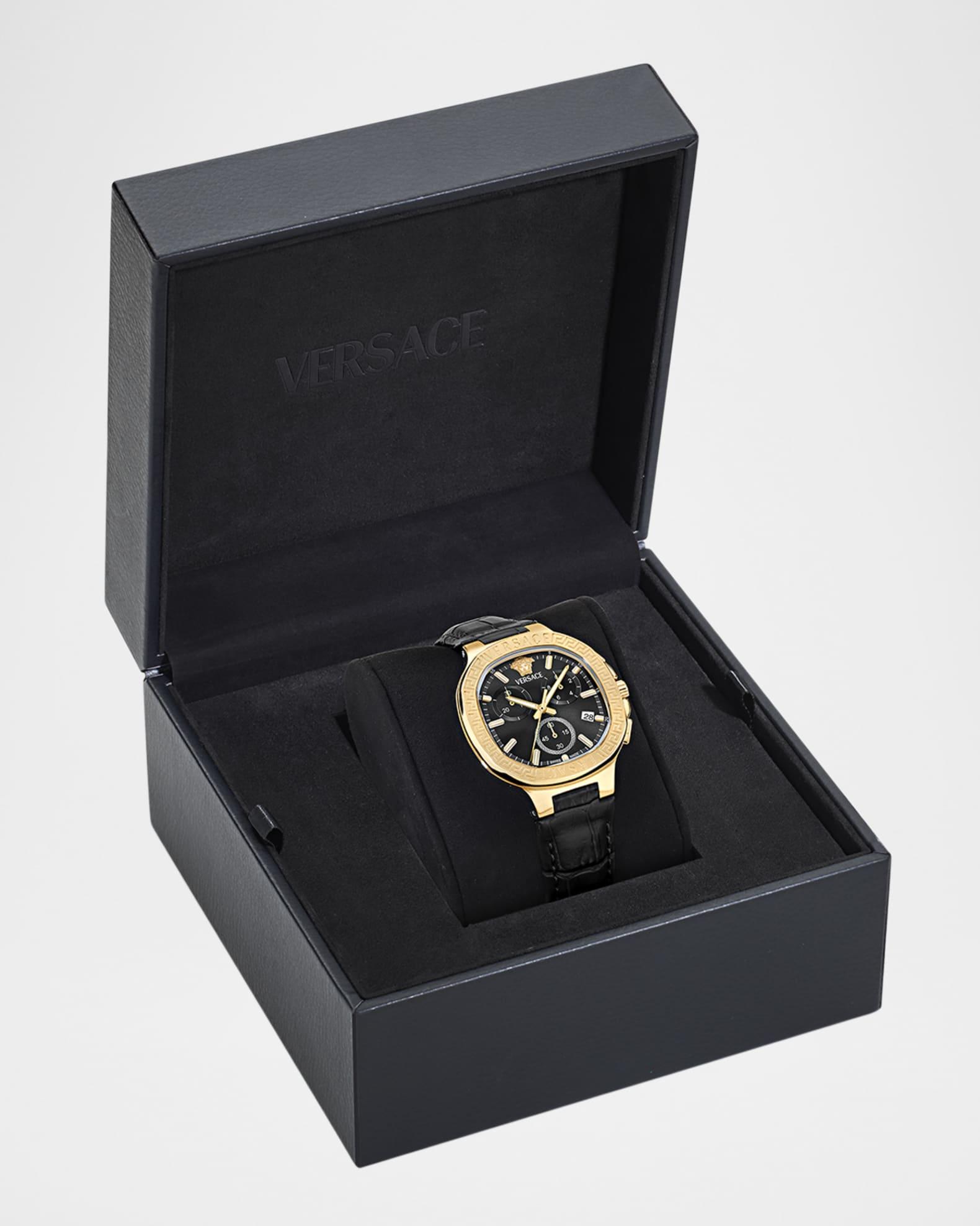 Versace chronograph watch with signature Greca detailing Approx. 40mm square gold-tone stainless steel case Black dial with three subdials and baton indices Medusa logo at 12 o'clock Date window at 4 o'clock Croc-embossed black calf leather bracelet Deployant buckle Quartz movement Spot clean Made in Switzerland
