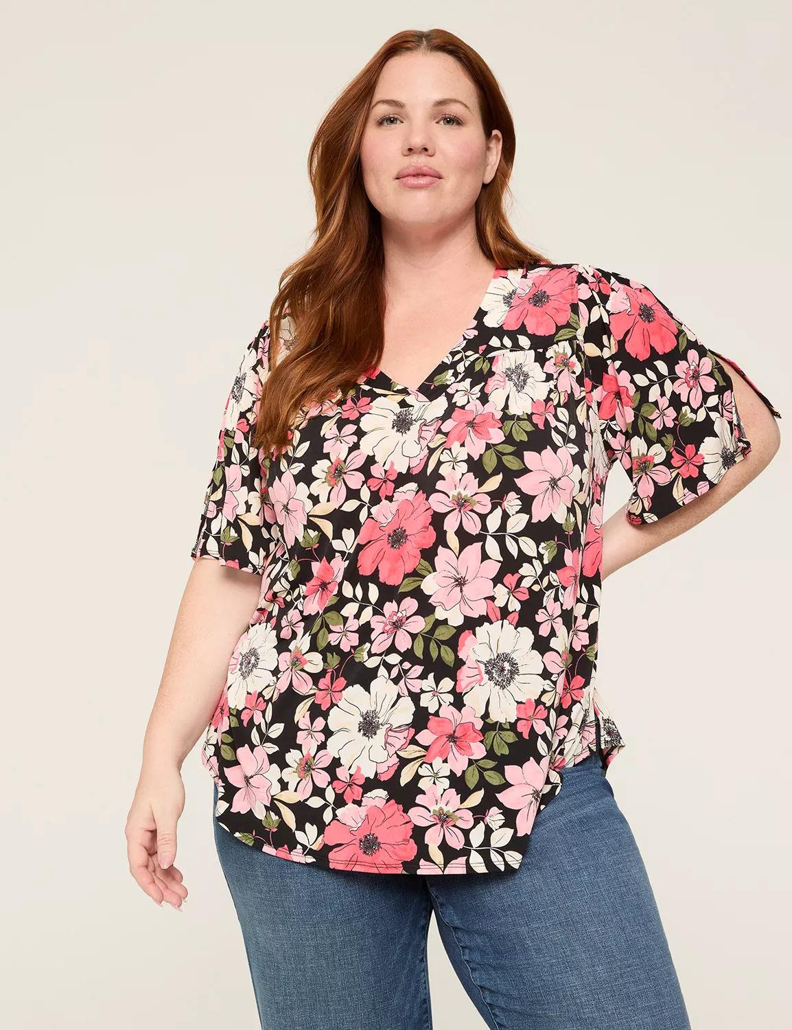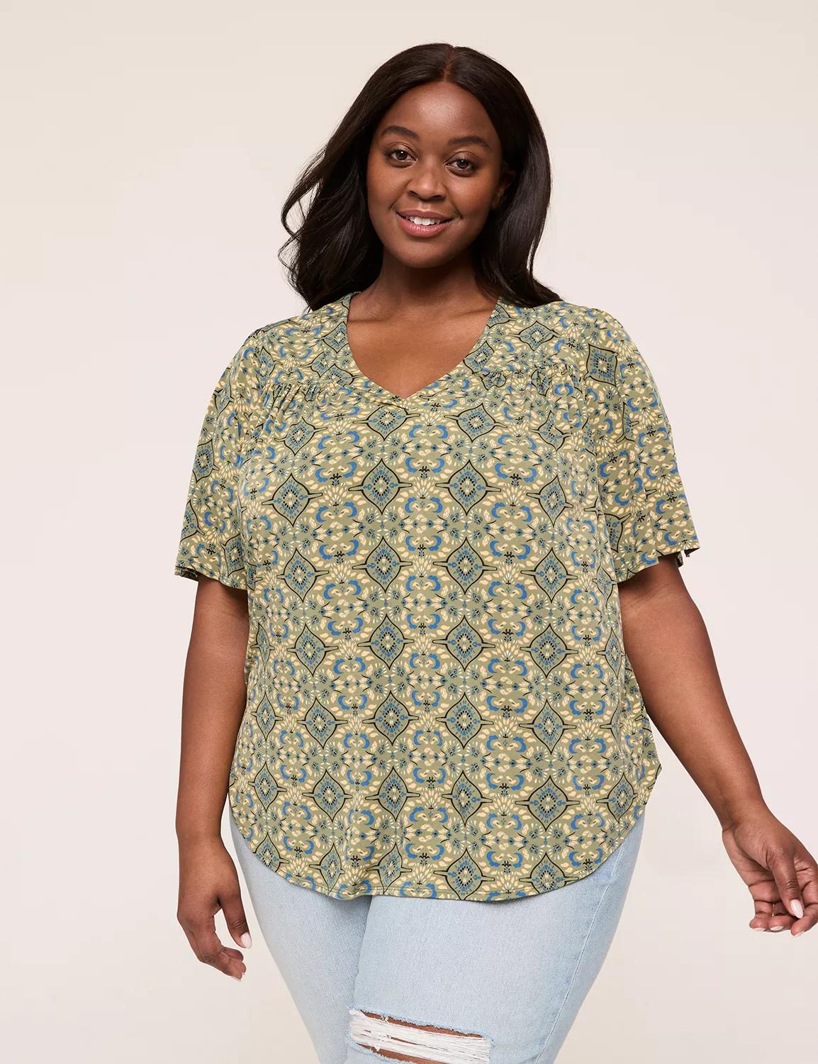 Available in Plus Size Meet the top that can do it all - the super-soft Matte Jersey, statement, fluttery sleeves and standout ruching can be paired with everything from our denim to a pair of 4-season pants. FIT: Classic. Designed for curves and a not-too-tight, not-too-loose, just-right fit. Front Body Length: 30 (On Size 18) Standard length FEATURES: V-neck Short sleeves with side slits for movement Curved hem with side slits Ruching at yoke FABRIC: Matte Jersey. Super soft & comfy, but also