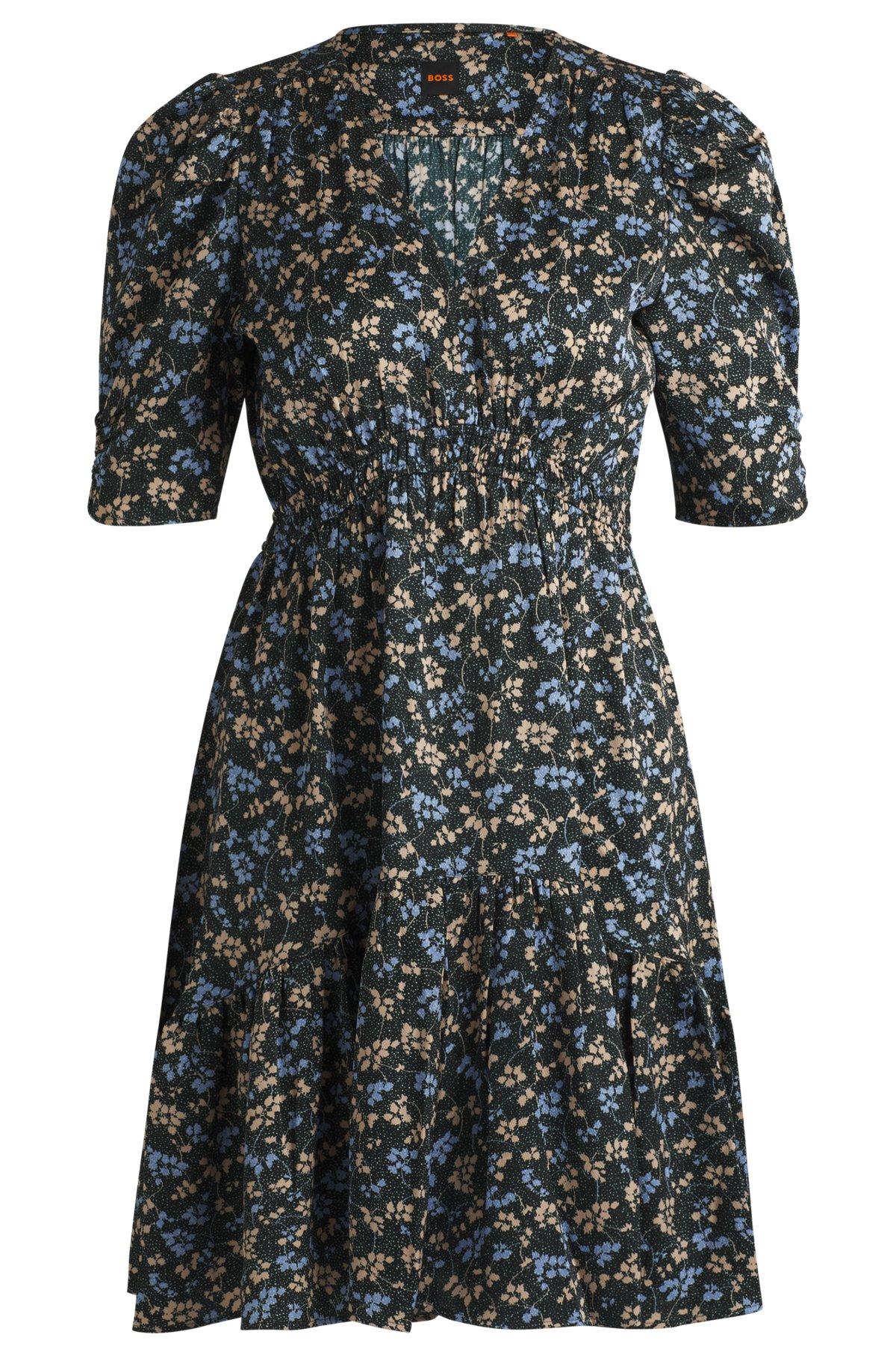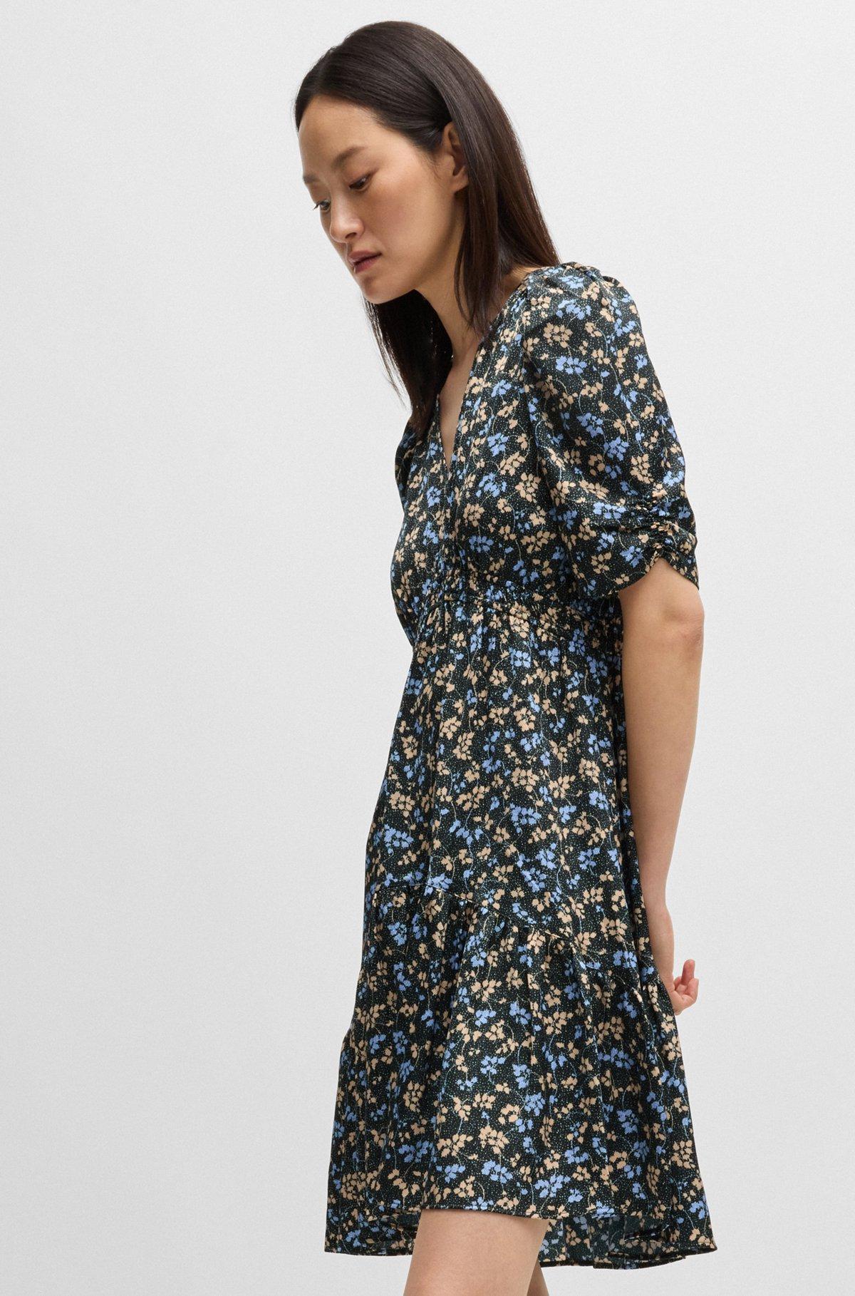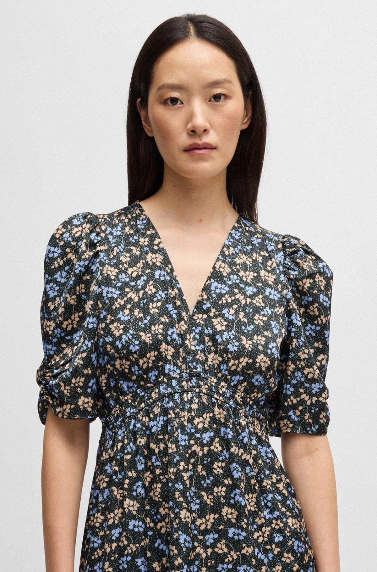 A super-soft dress in seasonally printed satin by BOSS Womenswear. This elegant piece features gathered sleeves and a V neckline.