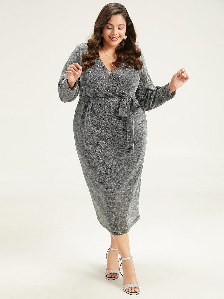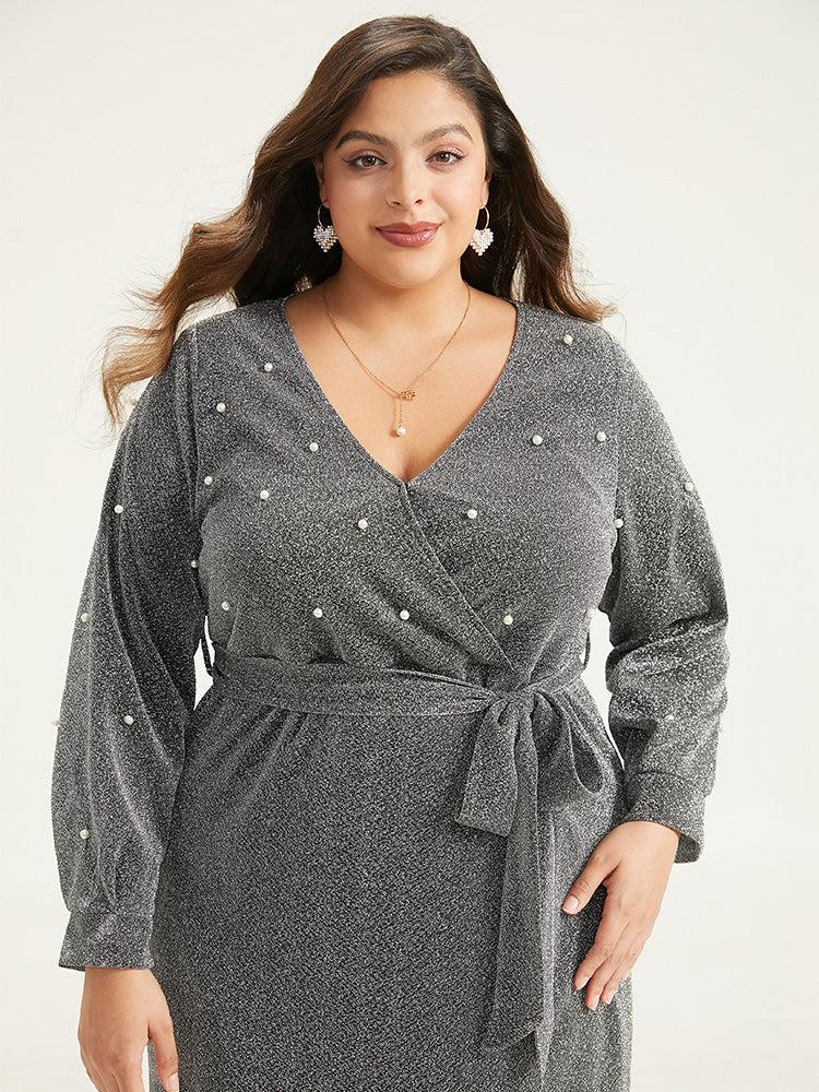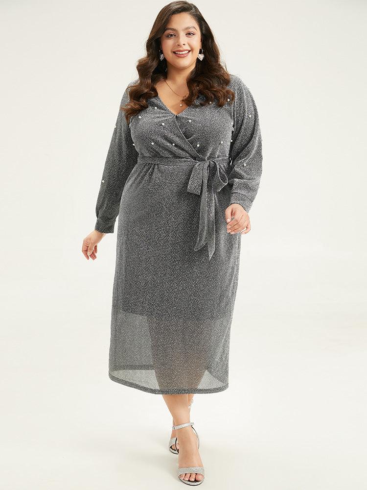 Shop V Neck Pearl Beaded Belted Dress now and redefine your style with confidence at BloomChic. Tailored for mid and plus-size women. This trendy Dress, sizes 10-30. You can never go wrong with BloomChic Dresses. Season:Winter;Color:DimGray;Style:Party;Neckline:Overlap Collar;Sleeve Type:Regular Sleeve;Pattern Type:Plain;Details:Button, Elastic Waist, Pleated, Plain, Belted, Wrap;Pocket:No-pocket;Belt:Belt