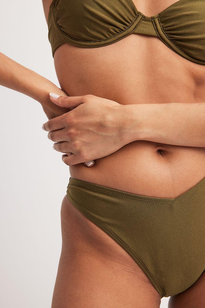 This bikini panty features a v cut and a high cut leg. It has swimsuit material.
