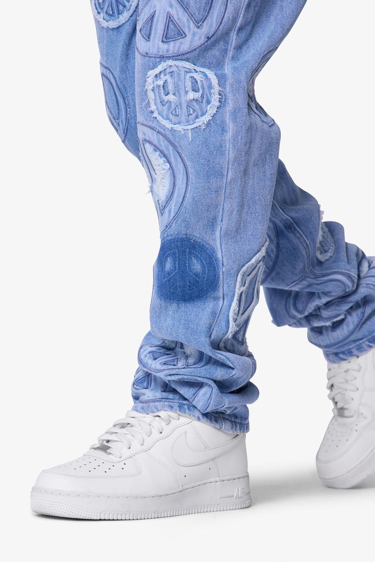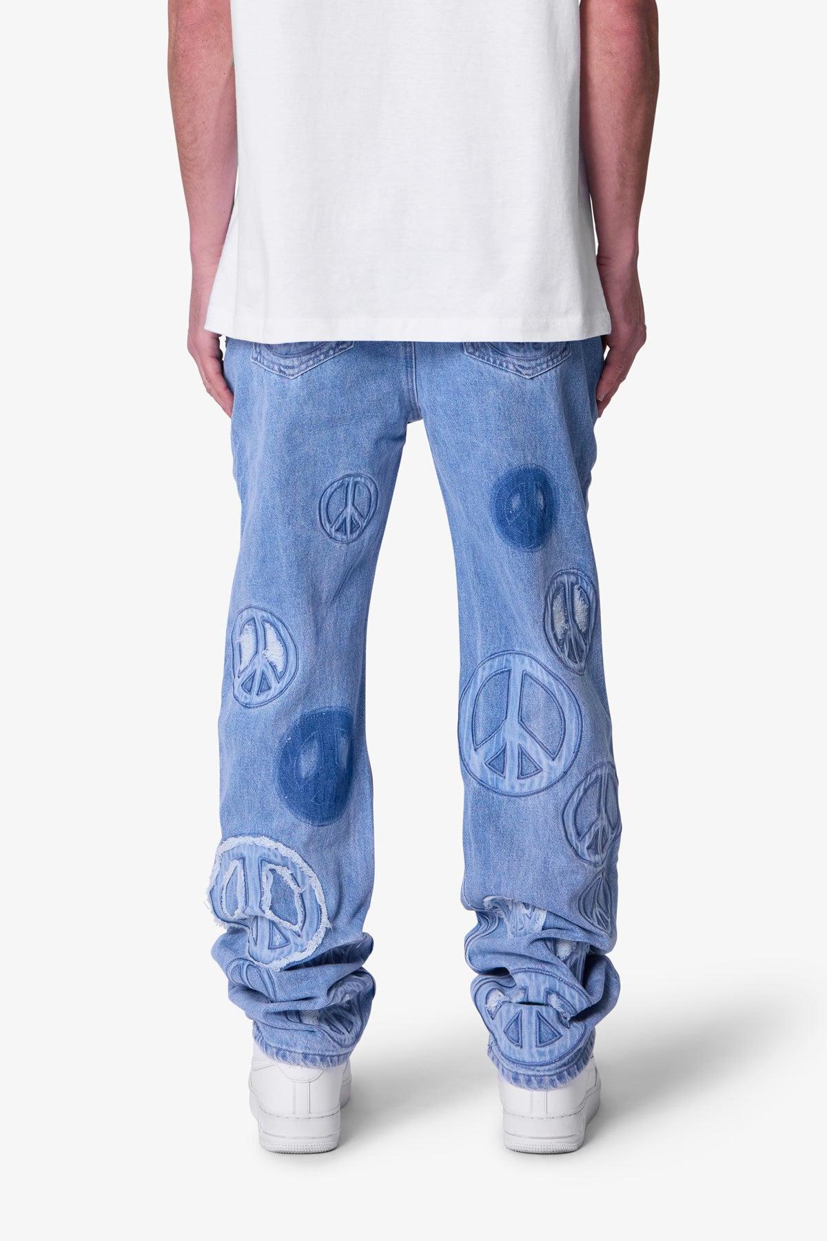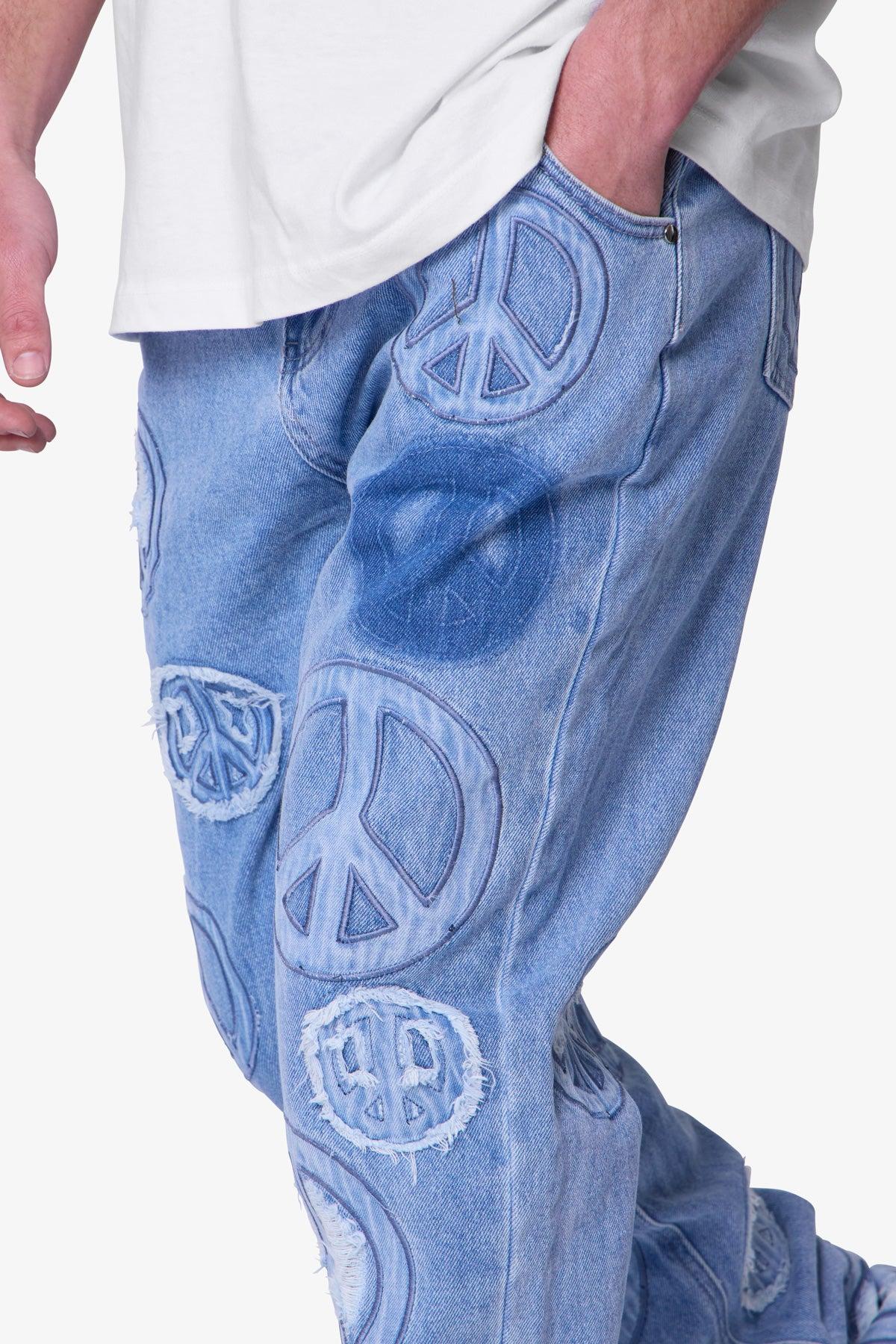 Constructed from 100% cotton denim with a medium blue wash, these baggy fit jeans feature all-over peace sign appliques with light distressing on select patches. Finished with five-pocket styling and standard belt loops. details Baggy fit 100% cotton Medium blue wash Peace sign appliques throughout Light distressing on
