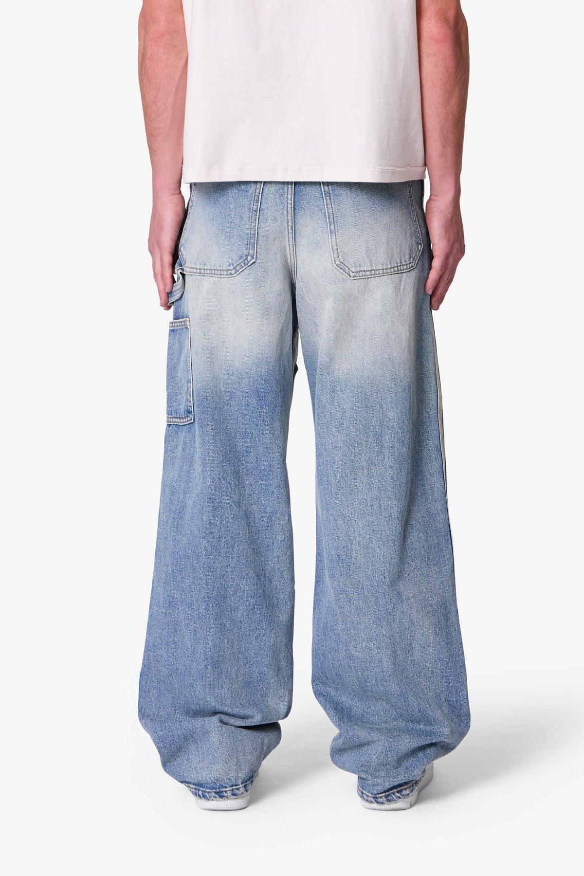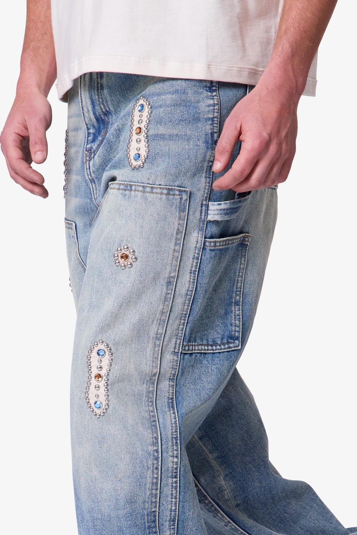 The V734 Western Jewel Denim is constructed from 100% cotton denim in a medium blue wash. Designed with a baggy fit, it features jewel and leather patch applique, a studded applique patch, and double knee construction. Functional workwear details include a hammer loop and work pocket. details Baggy fit 100% cotton deni