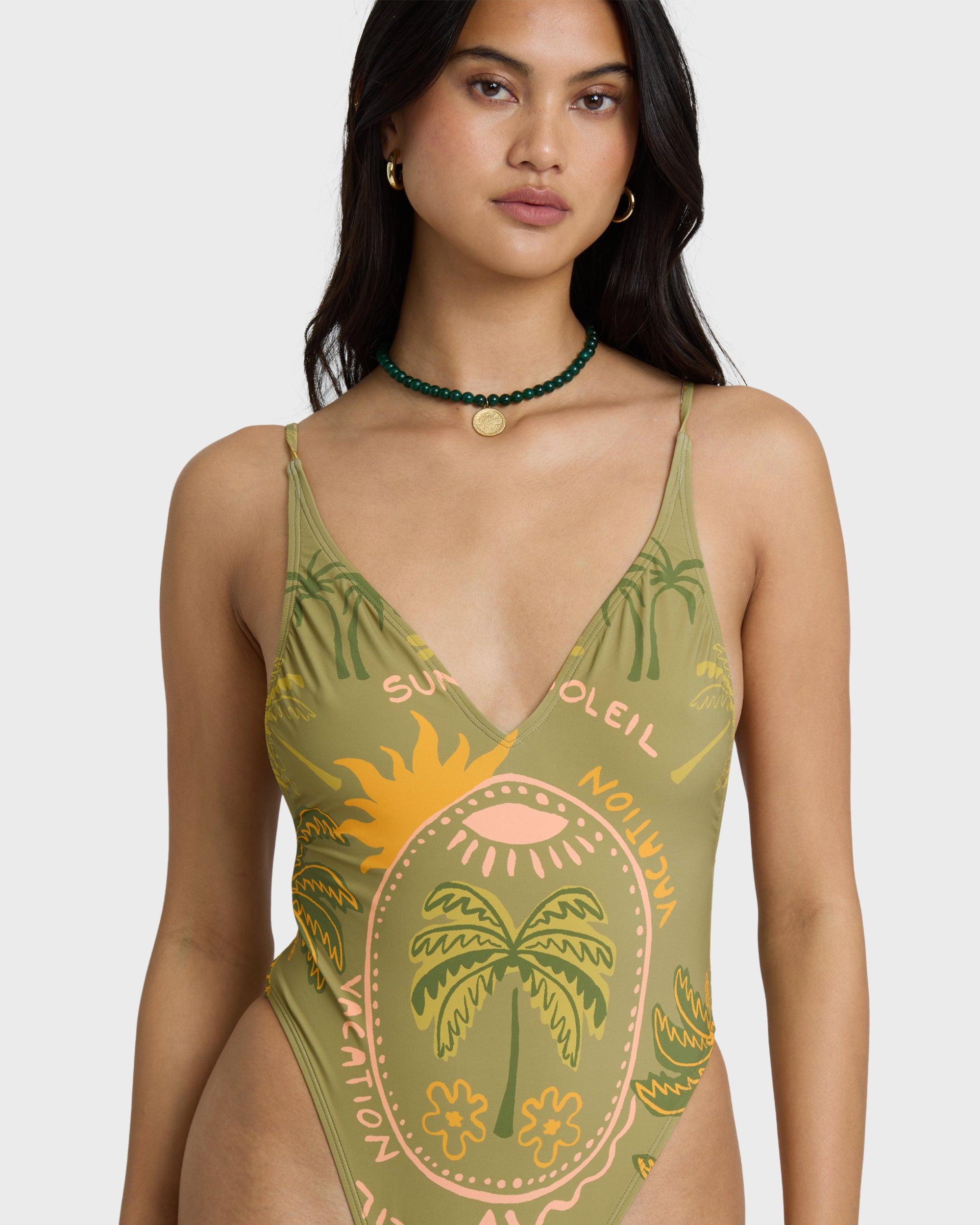 Strike a pose in our Vaca Soleil Deep V One-Piece Swimsuit. The daring plunge neckline and high-cut leg create a flattering silhouette, while adjustable straps with O-rings ensure your perfect fit. Made with partially recycled nylon, this suit sits high on the hips with a cheeky cut that's ready for sunshine. Features Fabric: 78% recycled nylon (polyamide), 22% elastane Type: Deep v one piece Fit: Skimpy bum coverage Features: Sits high on hips, high leg fit O rings and sliders for adjustable straps No cups Logo embroidery at wearers center back