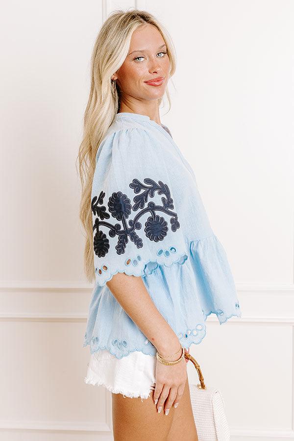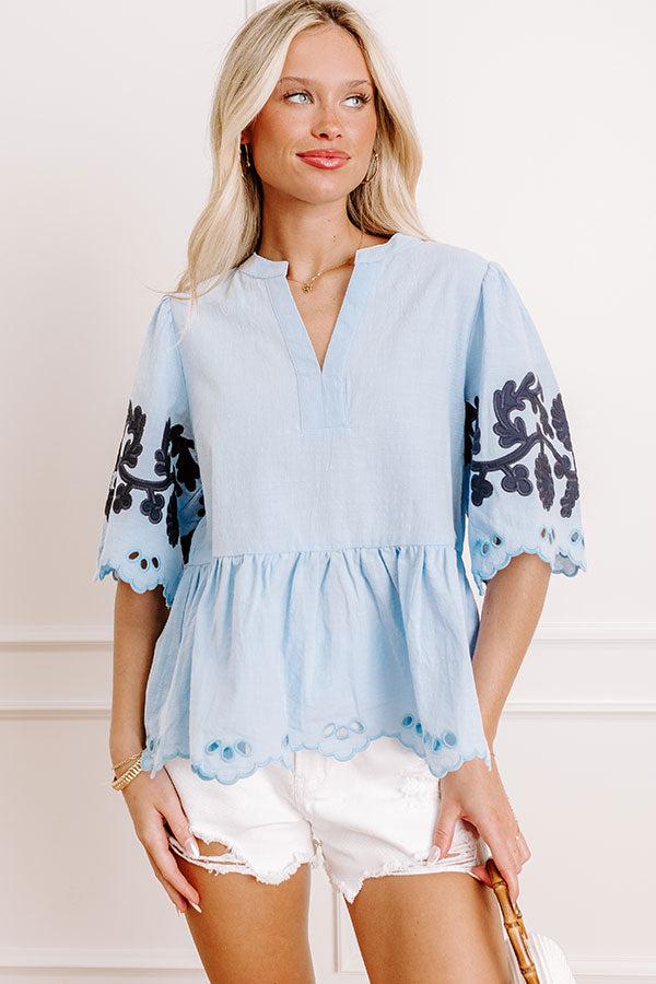 - Flirty and feminine! This eyelet top brings all the charm with its peplum design and delicate floral embroidery. Perfect for adding a stylish touch to your everyday look, it's the kind of piece that makes any outfit feel effortlessly pretty. - Unlined material - A v-cut neckline - Short, loose sleeves with floral embroidery, eyelet accents, and scalloped cuffs - A relaxed silhouette that ends in a scalloped peplum hemline with eyelet accents