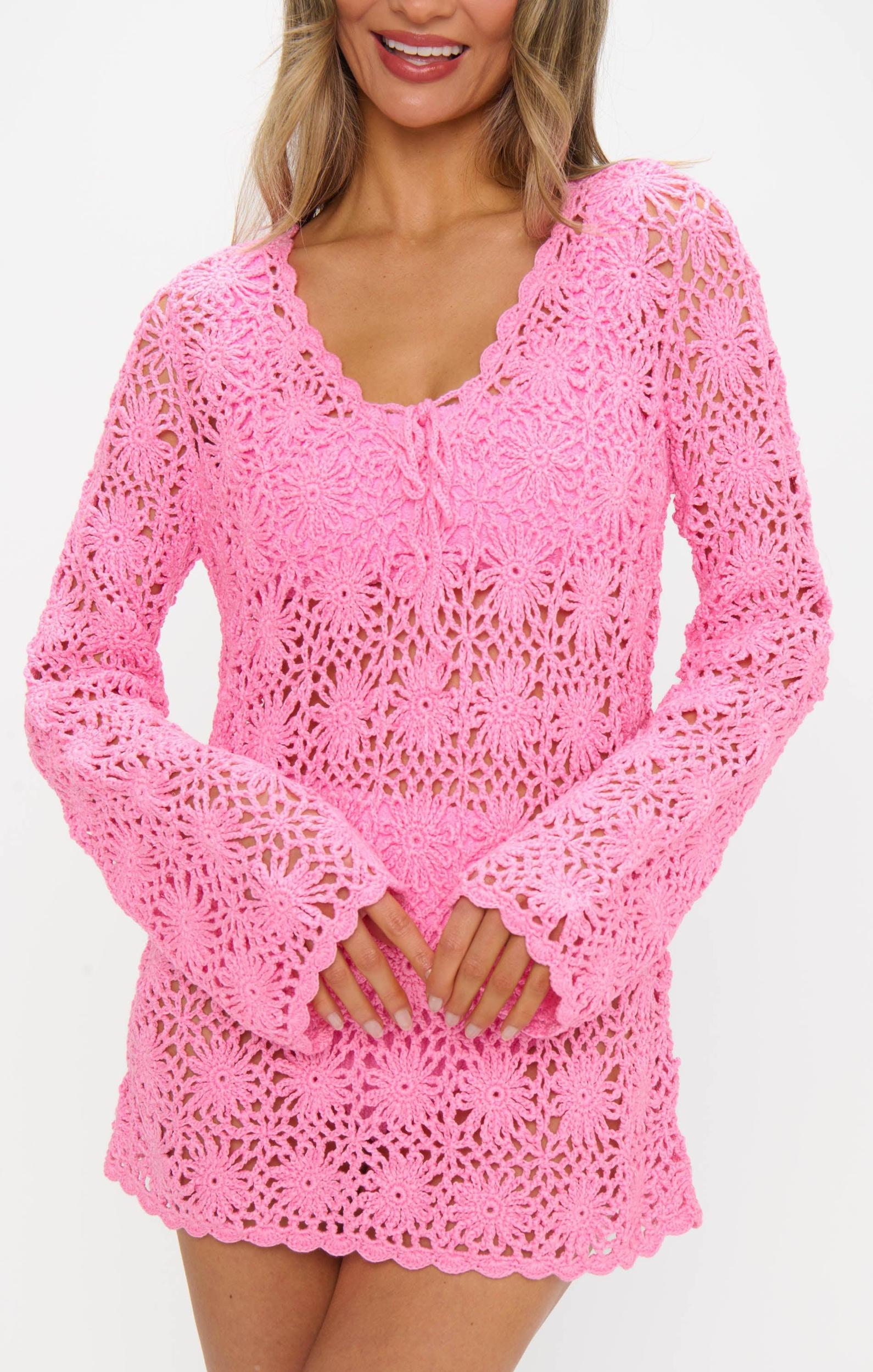 Your next pool day just got a whole lot cuter! We teamed up with long-time Mumu lover and one of our fav influencers, Krista Horton, to create a fun & vibrant spring/summer collection! This collab has everything we love - sunshine, daisies, and twinning styles for the whole fam! Get ready to soak up the sun and make unforgettable memories with your crew!Your fave coverup is now a mini! Beach bound with drink in hand in this bubblegum pink crochet coverup with long sleeves and a sweet tie front. Throw her on over a bikini with strappy sandals and straw hat!