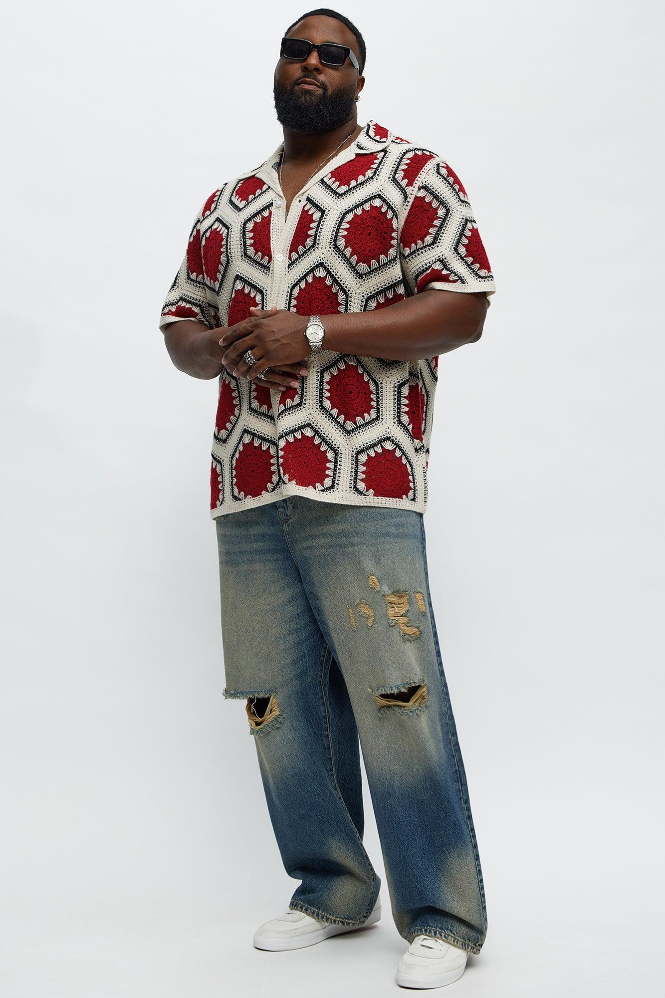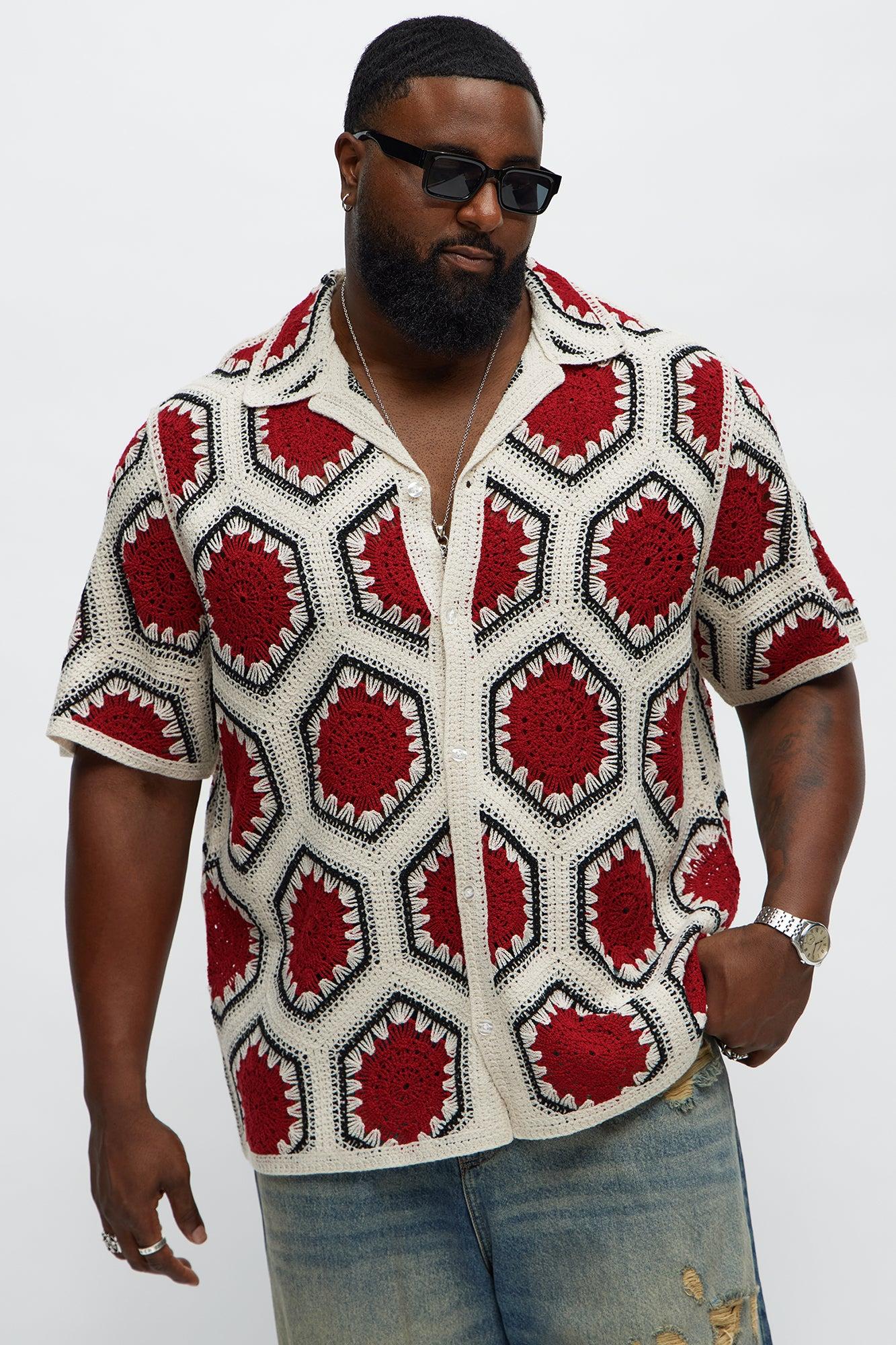 Vacay Vibes Crochet Button Up Shirt - Red/combo Male