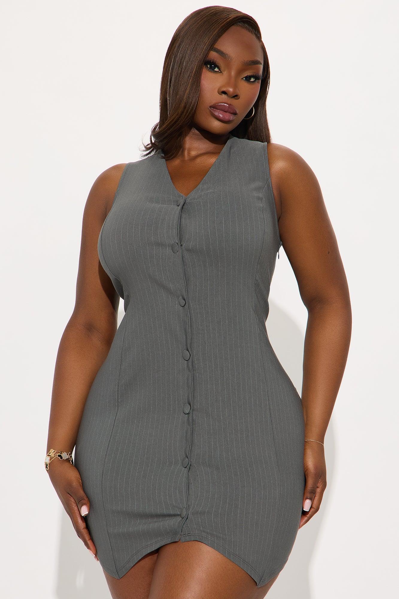Available In Slate Grey And Tan. Pinstripe Vest Mini Dress V-neck Sleeveless Button up Back zipper Stretch Length measured flat = 32" 74% Rayon 23% Nylon 3% Spandex Imported California Proposition 65WARNING: Cancer and Reproductive Harm - www.P65Warnings.ca.gov.