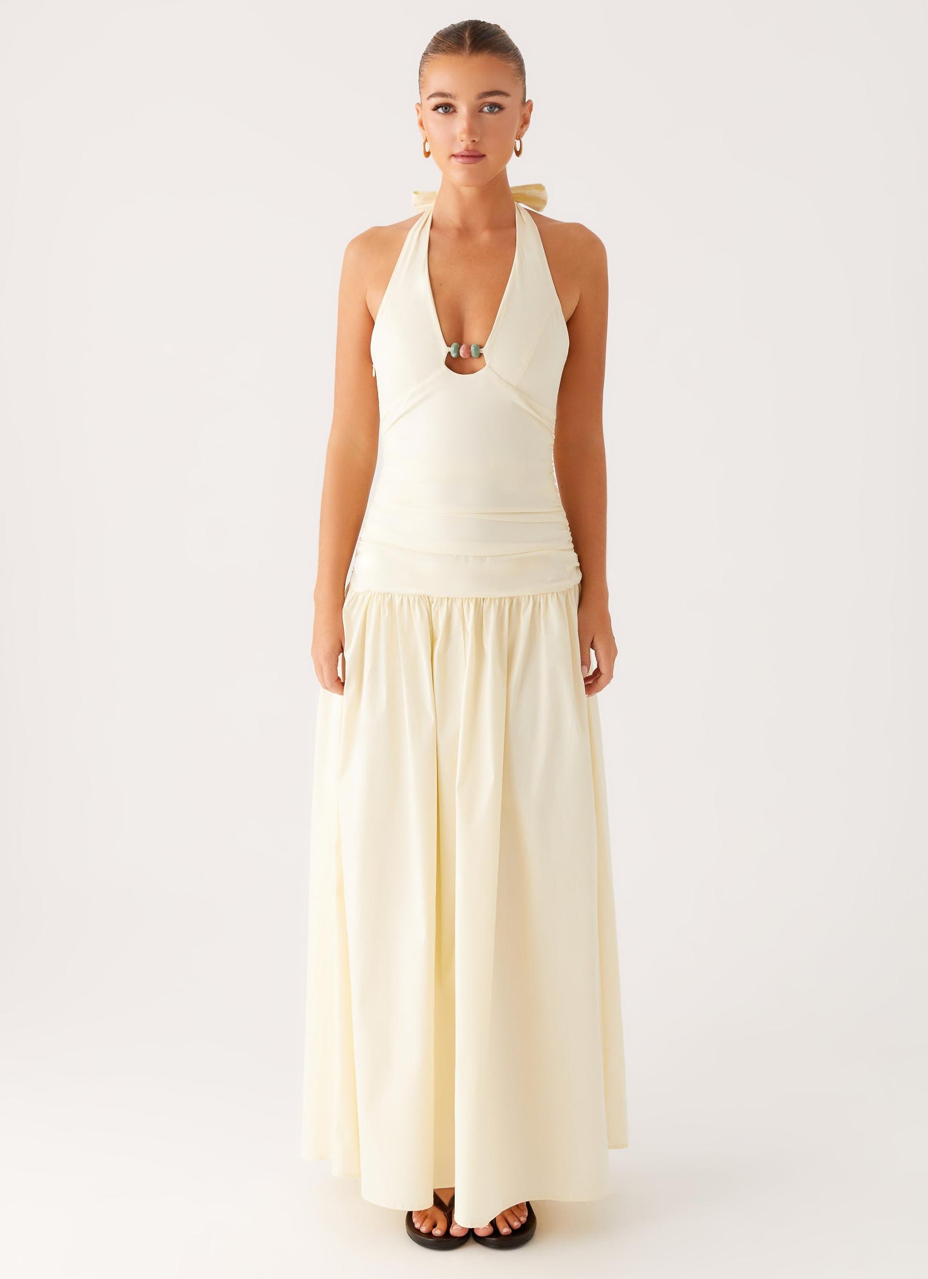 Peppermayo ExclusiveThe Val Maxi Dress flows effortlessly with its ruched side, drop waistline, and shimmering front beading. A true statement piece for those who live for the spotlight.- Maxi length - V neckline - Front beading detailings - Neck tie strap - Ruched side and drop waistline - A-line skirt - Fully lined - Side invisible zipper - 65% Cotton, 32% Nylon, 3% ElastaneSize AU 8 / US 4 garment measurements:Bust - 76 cm (29.92 in) Waist - 66 cm (25.98 in) Hip - 90 cm (35.43 in) Hem - 232 cm (91.34 in) Length - 121 cm (47.64 in)Yasmin is 174cm and wears size AU 6 / size US 2