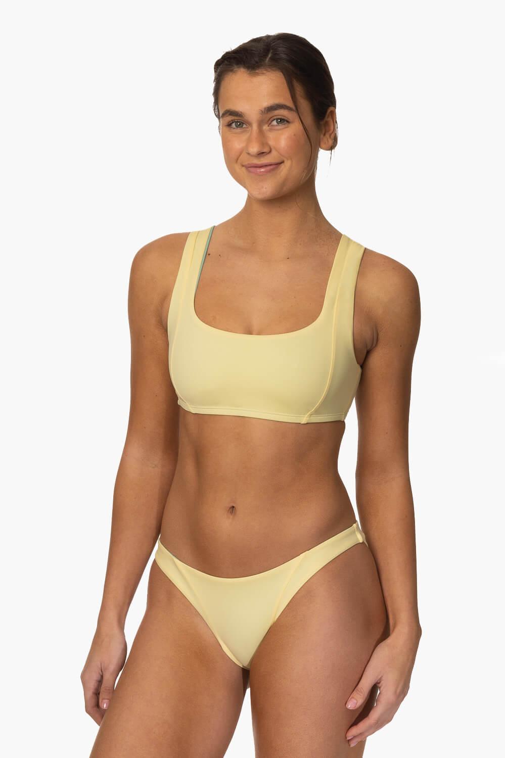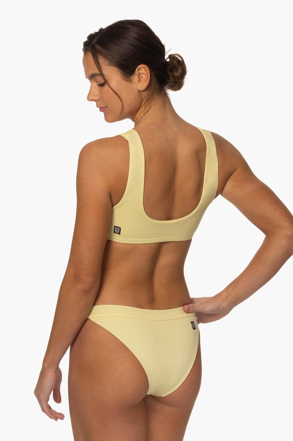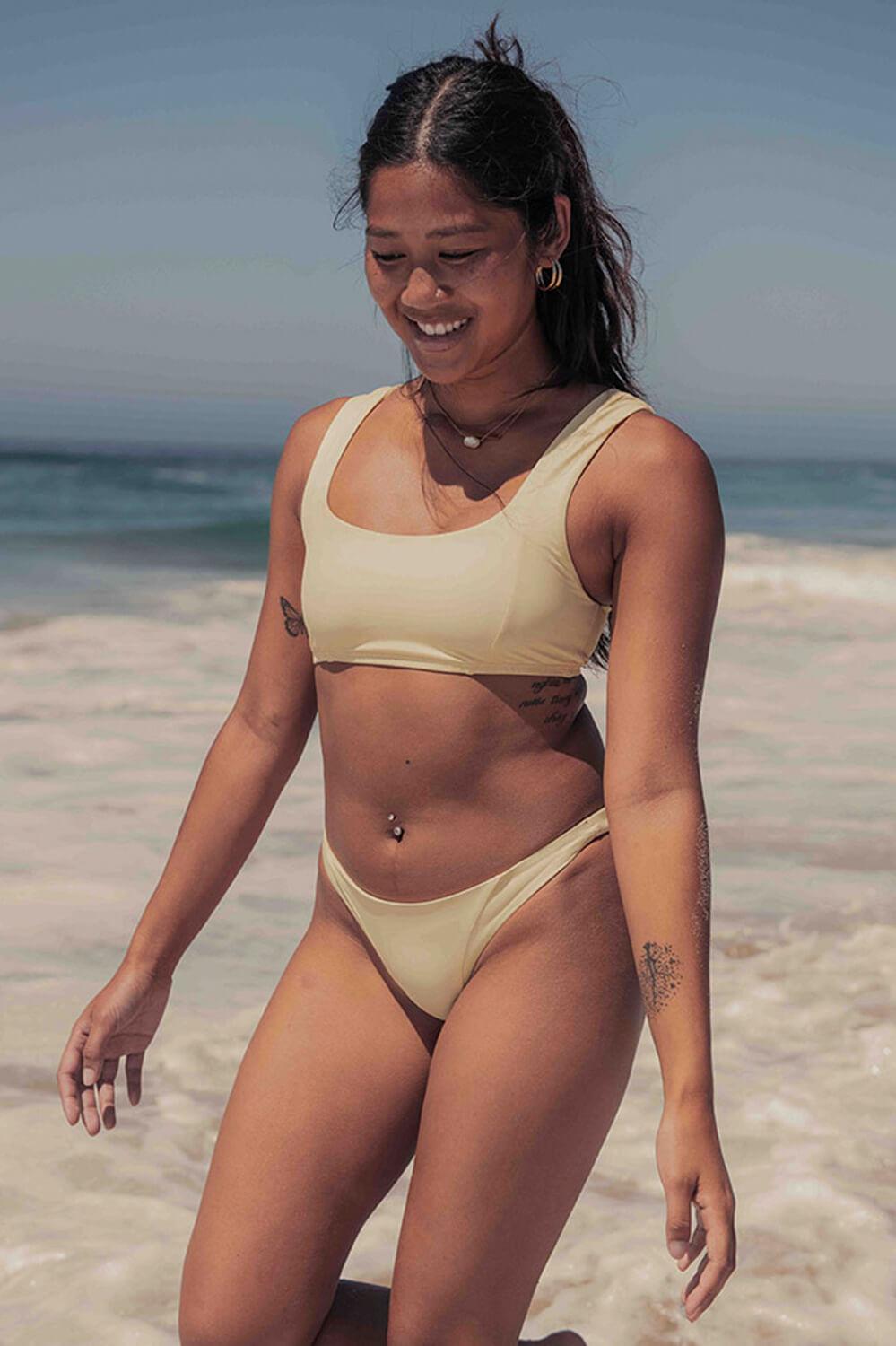 We designed a medium coverage bikini bottom that will perform just as hard as you do. Designed with a little flair, these contrasting bikini bottoms will turn heads as you're charging any wave or cooling off on the beach. Great for those who want slimmer coverage without compromising durability. Proudly made with our stylish yet athletic Recycled Sea-Flex fabric. Features: Good for: Surfing, paddling, ocean activities, lifestyle Low Rise Medium Coverage (3) Medium Impact (3) Lined for maximum privacy Tagless for maximum comfort Chlorine Resistant Pairs with Paige Bikini Top True to size Fabric Composition: Recycled Sea-Flex fabric Made out of recycled fishing nets and other discarded nylon UPF 50+ Shell: 78% Recycled Nylon 22% Elastane Liner: 78% Recycled Nylon 22% Elastane Care Instructions: Hand wash cold Hang dry Do not iron, dry clean or bleach