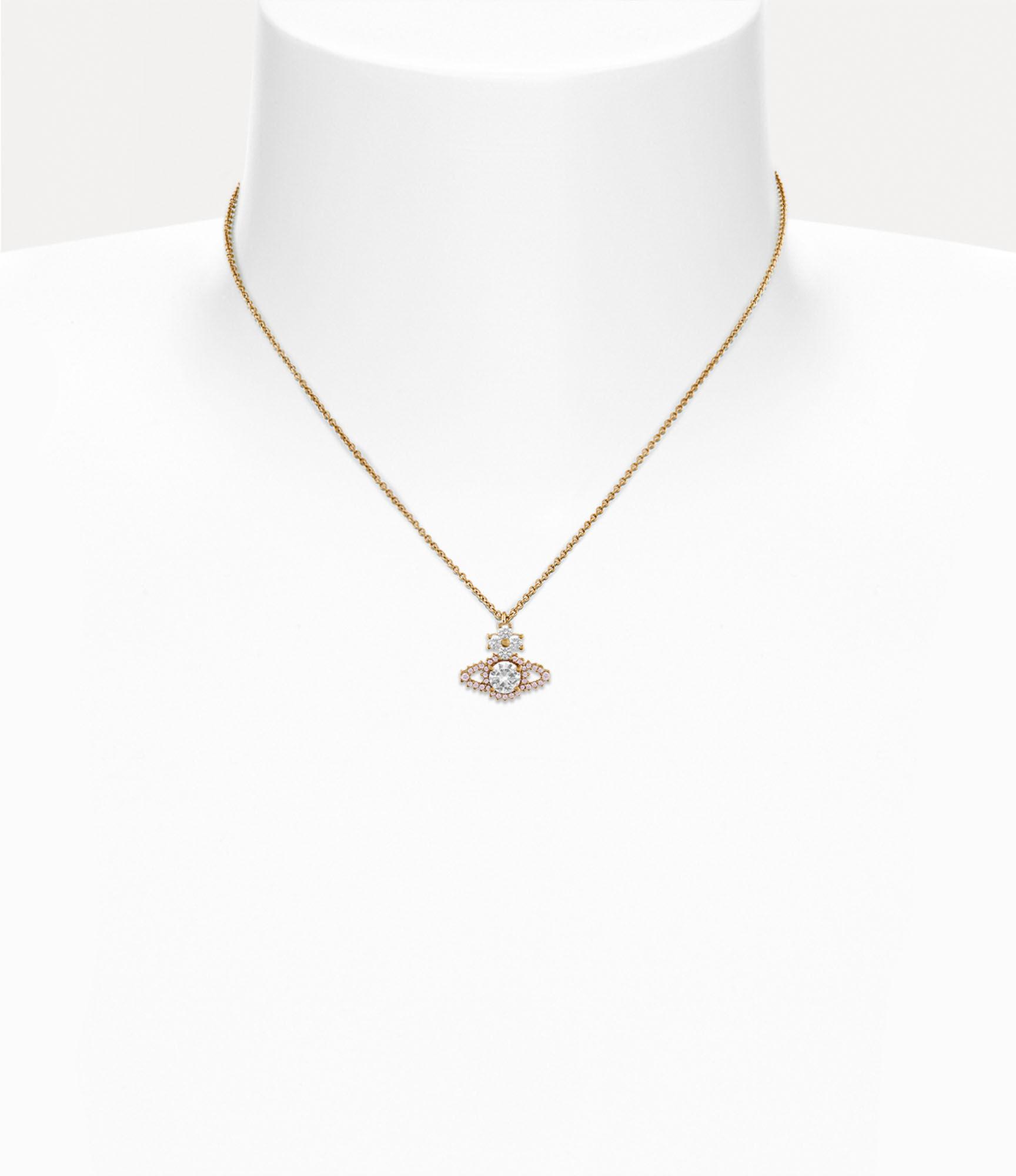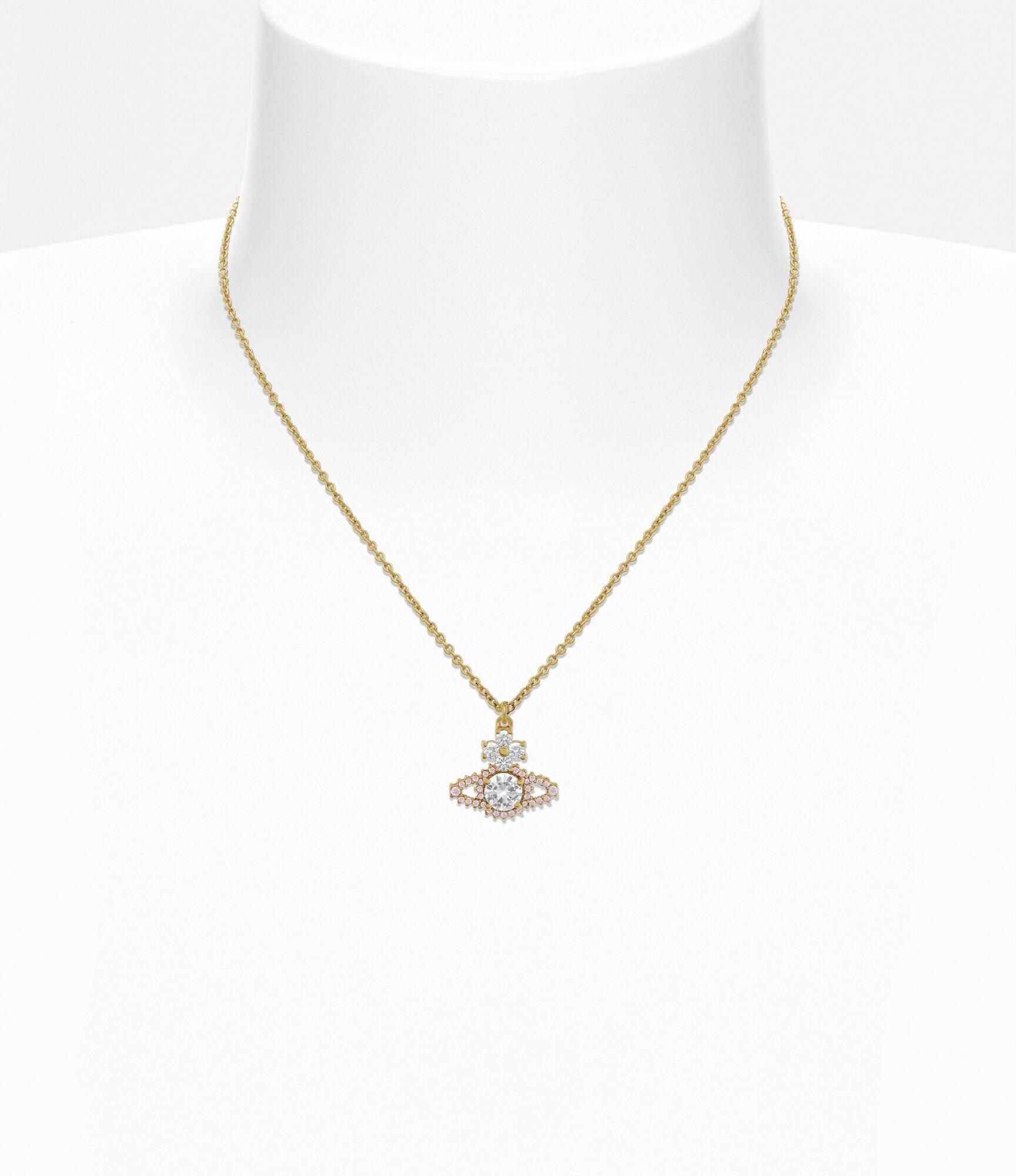 The orb emblem represents Vivienne's vision of propelling tradition into the future, serving as a source of inspiration for the house's Classic jewellery collection. The Valentina Orb Pendant necklace features an orb-shaped silhouette at the centre of the design, embellished with crystal accents set in a gold-tone prong setting.